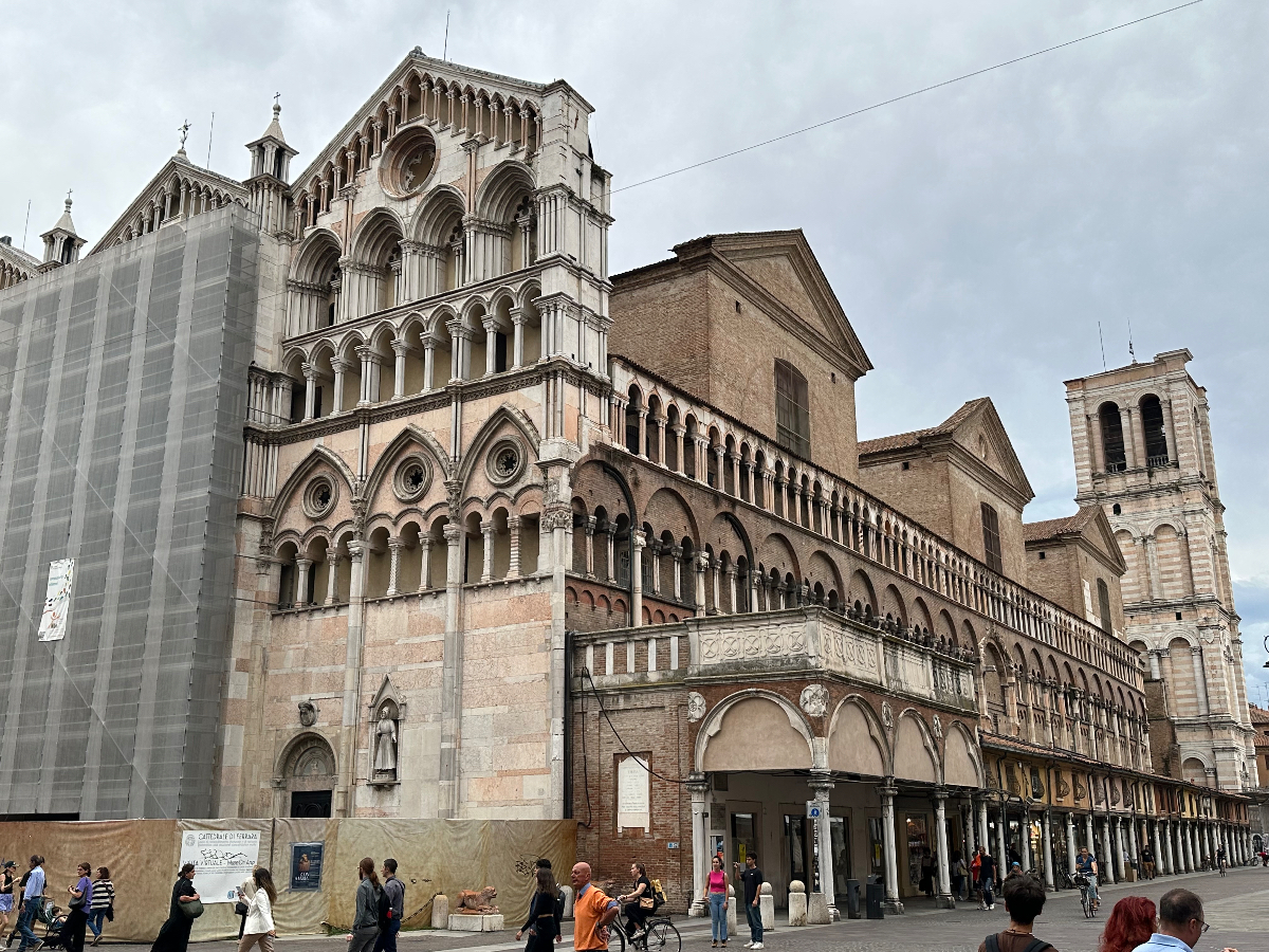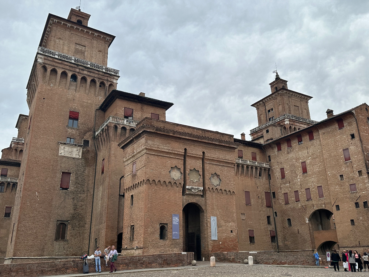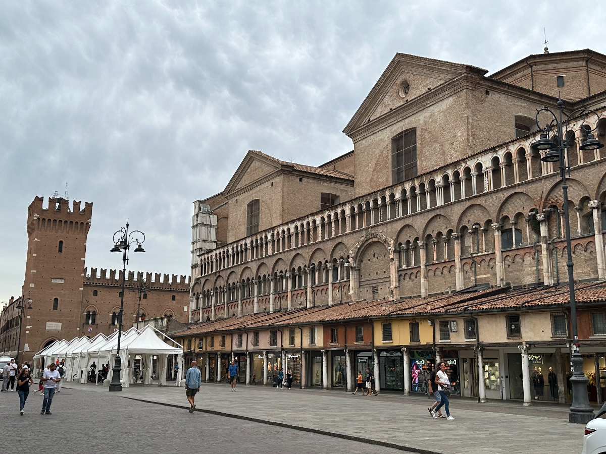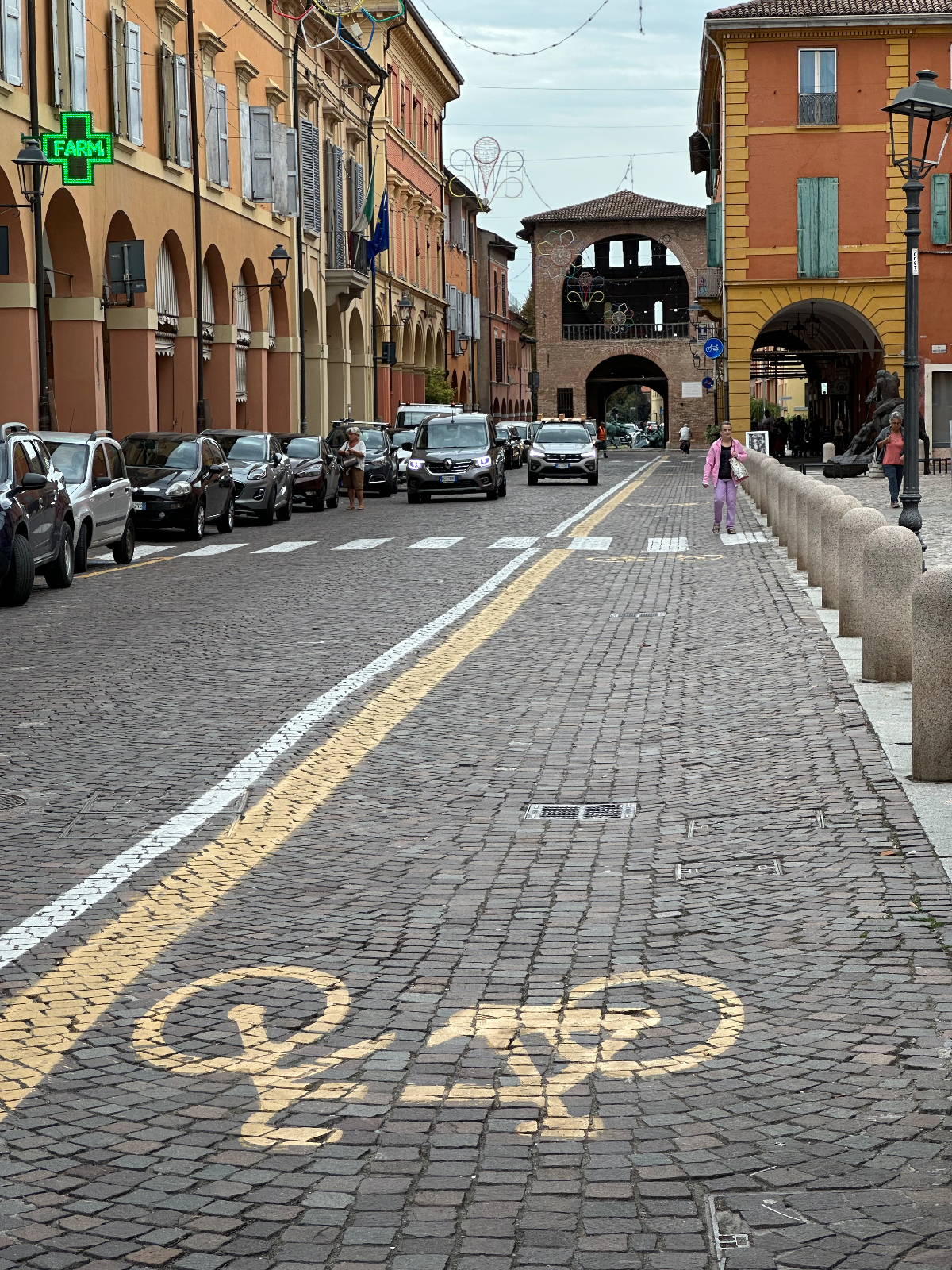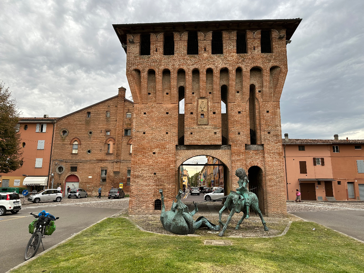 Was ich bisher vergessen habe zu erwähnen, vorgestern als ich bei casa Torre ankam, hatte ich genau 2022km am Display, ich schätze, so 2500km werden es in Summe werden, bis ich zuhause bin. Heute ist seit längerem der erste Tag, an dem es morgens über 20 Grad hat, passt gut. Gestern habe ich erstmals mein „verbotenes“ Rücklicht angeschaltet, ich habe es aus Amerika importiert, es ist bei uns nicht erhältlich, weil verboten. Es ist so stark, dass der nachkommende Fahrer geblendet wird, wenn er direkt hinter mir fährt, aber ich bin schon aus einiger Entfernung wahrnehmbar, das ist bei schlechter Sicht und dichtem Verkehr wie eben gestern, ein echter Bonus! Italienische Straßenfahrer haben zum Teil auch ein sehr starkes Rücklicht, ich nehme an, hier ist es erlaubt. Meine heutige Tour geht bzw. fährt nach Ferrara, wieder entlang einer stark frequentierten direkten Verbindungsstraße. Zum Unterschied zu gestern, führt über ganz lange Streckenabschnitte ein schöner Radweg parallel zur Straße, zumeist auch baulich getrennt, ein Radfahrer Paradies. Die zuständigen Politiker in dieser Gegend Bologna und Ferrara müssen wohl selbst Radfahrer sein ;-) Ferrara hat darüber hinaus den Ruf, Italiens Radfahrer Hauptstadt zu sein. Es ist zwar sehr laut entlang der Straße, aber ich radle ganz entspannt dahin, kein Stress. Die Berge sind längst aus meinem Rückspiegel verschwunden, vor mir liegt wieder die schon bekannte Po Ebene. Von den heutigen 67 Kilometer der Gesamtstrecke, waren es sicher 45 Kilometer Radwege. Als der Radweg endet, ändert sich auch das Wetter, es beginnt leicht zu regnen. Regenschutz auf den Helm, Regenjacke an und das xx-starke Rücklicht ein. Ich fahre wieder auf scheinbar unendlich langen, geraden Straßen dahin, das Ende kann man nur ahnen. In der Ferne taucht schemenhaft ein Kirchturm auf, dort werde ich einmal einen Unterstand suchen und im Internet nachsehen, wie sich das Wetter entwickeln wird. Ich komme näher, aber nicht nahe, denn die Straße macht einen 90 Grad Schwenk, und vor mir die nächste unendlich lange Gerade, und es beginnt stärker zu regnen. Unter einem großen Baum bleibe ich schließlich stehen, und krame aus einer Packtasche – natürlich ganz zuunterst – meine Regenhose hervor, und es geht weiter. Der paradoxe Nachteil dieser regendichten Bekleidung ist der, dass sie dicht ist. Von außen dringt kein Wasser ein, trotzdem spüre ich, wie mir innen das Wasser den Körper hinunter rinnt. Es ist kühler geworden, da wird das Köcheln im eigenen Saft fast schon wieder zum Vorteil, solange man sich bewegt. Deshalb beschließe ich auch, keinen Halt mehr einzulegen, sondern schnellstmöglich zu meinem Quartier zu radeln. Kurz nach zwölf erreiche ich schon Ferrara, ich muss aber durch die Stadt, mein Hotel liegt in einem Vorort. Kein Problem, dass ich so früh da bin, mein Zimmer ist fertig, ich kann einchecken. Mein Rad ist im Heizkeller sicher verstaut, und ich habe mir fest vorgenommen, es heute auch nicht mehr zu bewegen, ganz egal welche Sehenswürdigkeiten die City auch zu bieten hat. Nach dem Duschen gehe ich ins hauseigene Restaurant und esse ein als lokale Spezialität angepriesenes Nudelgericht, Bandnudeln, hier vorwiegend Eierteigwaren! mit einer Tomatensoße mit einer nur hier erhältlichen Salami. Dazu ein Glas Rotwein, vino della casa und zum Abschluss ein Tiramisu. Eigentlich wäre ich jetzt bereit für ein Mittagsschläfchen, aber da kommt mir die Statistik in den Sinn, die mir Ingo vor einigen Tagen geschickt hat. Von 1. September bis zum 13. September hat dieser Blog 585 verschiedene Besucher mit 1.223 Besuchen 10.673 Seitenaufrufen und 107.760 Zugriffen verzeichnet, und heute ist bereits der 22! Da bin ich all diesen Besuchern und zahlreichen Unterstützern wohl schuldig, ein paar Fotos aus der Region zu liefern. Ich mache mich auf und chartere ein Taxi. Der Fahrer erzählt mir allerhand interessantes zur Stadt, eine zur Gänze vorhandene Stadtmauer die begehbar und mit dem Rad befahrbar ist, (Ferrara ist eine der Städte mit der höchsten Fahrraddichte der Welt!), wir fahren am Palazzo di Diamanti mit seiner Fassade von 8000 pyramidenförmigen Steinen vorbei, und er zeigt mir das Geburtshaus von Ettore Bugatti, der Namensgeber der gleichnamigen französischen Automarke. Lustig ist auch, dass hier in Ferrara einer der häufigsten Familiennamen Ferrari ist :-) Mitten im Zentrum, beim Castello Estense, steige ich aus dem Taxi und bedanke mich für die interessante Fahrt. Ich vermute, heute muss hier Sponsion oder Promotion gefeiert werden, überall stehen mit einem Blumenkranz geschmückte junge Frauen inmitten von Freunden und Familie, die sie feiern und fotografieren. Über den Platz und in den Gassen wird lauthals gesungen, mit dem Refrain Dottore, Dottore…. Es ist insgesamt angenehm viel los, kein Vergleich zu den unlängst besuchten Kult Städten. Wieder schlendere ich durch die Gassen und über Plätze, lass mich treiben und fotografiere auch, und gönne mir ein Eis. Diese Fotos kosten mich 48 Euro fürs Taxi, aber ich bin sehr froh, dass ich mich aufgerafft habe, Ferrara wird mir sehr angenehm in Erinnerung bleiben. Obwohl auch hier in und um die Stadt ein enormes Verkehrsaufkommen herrsch, ist die Luft klar. Ganz anders gestern in Bologna, dort ist die Luft von Abgasen geschwängert, es ist kaum auszuhalten gewesen. Marteen und Dominique, die beiden Holländer von der Casa Terre haben mir erzählt, wenn sie Sehnsucht nach der Stadt haben, fahren sie nach Bologna. Beide sind Raucher, aber wenn sie nach einigen Tagen Bologna wieder nach Hause kommen, spucken sie schwarzen Schleim aus. Ekelhaft, aber nachvollziehbar, wenn man da gewesen ist. Mittlerweile ist es 20:15 ich werde versuchen noch heute Fotos hochzuladen, habe aber wenig Hoffnung dass es hinhaut, die Internetverbindung ist sehr, sehr, sehr mau…..