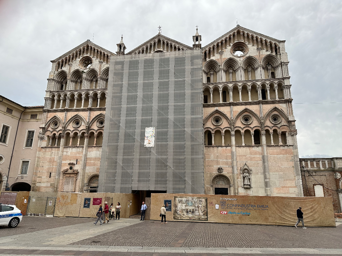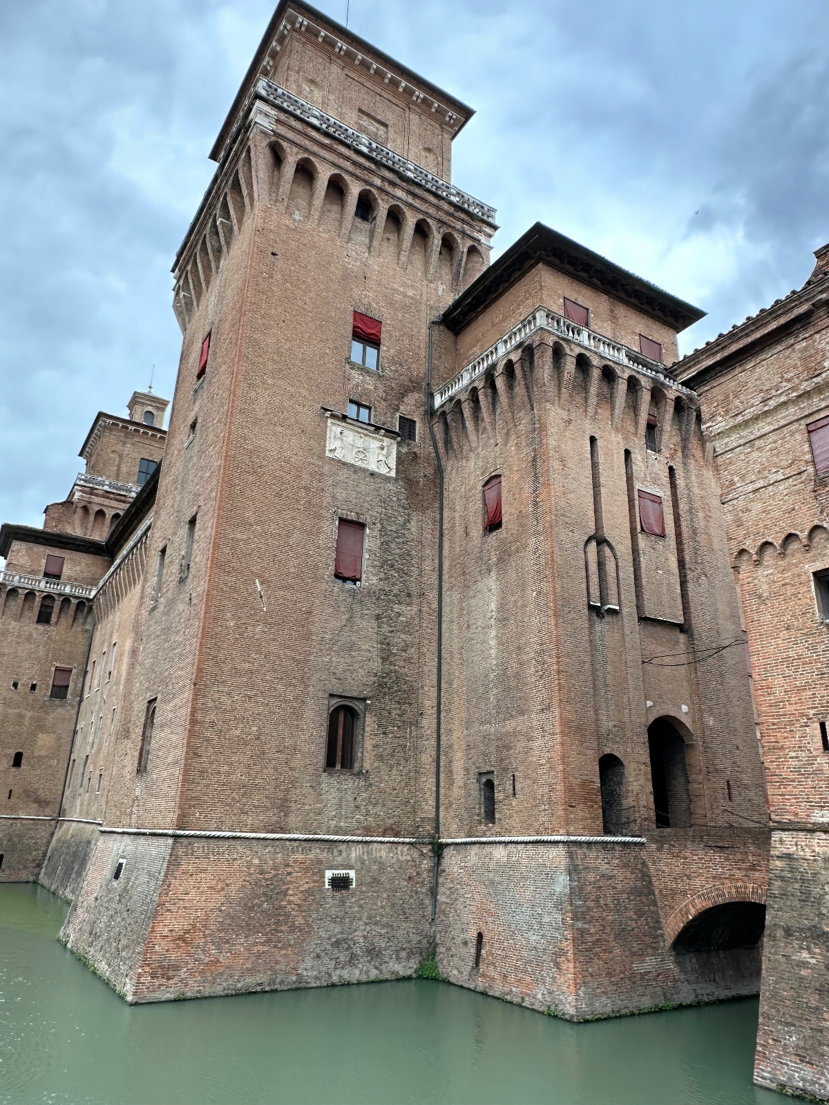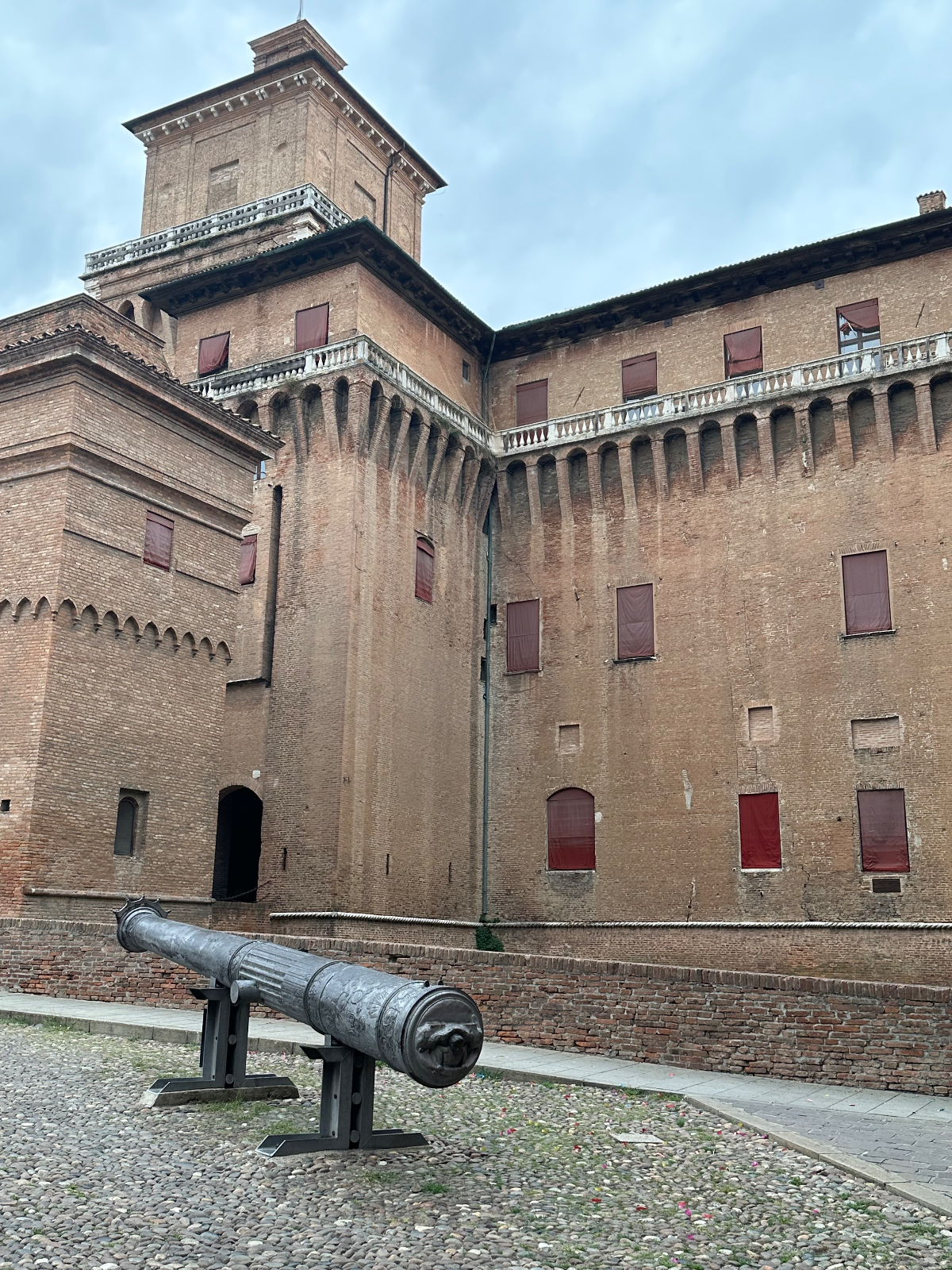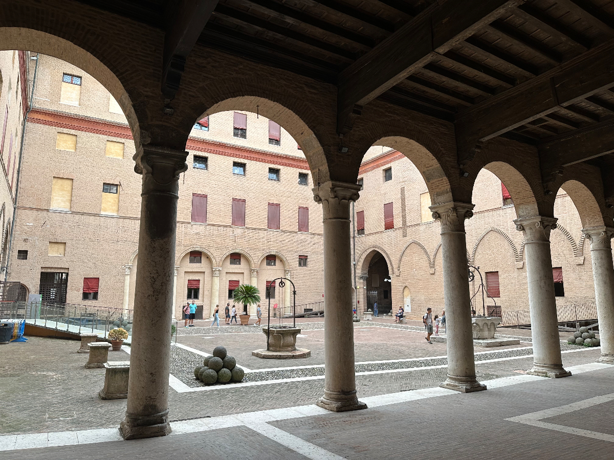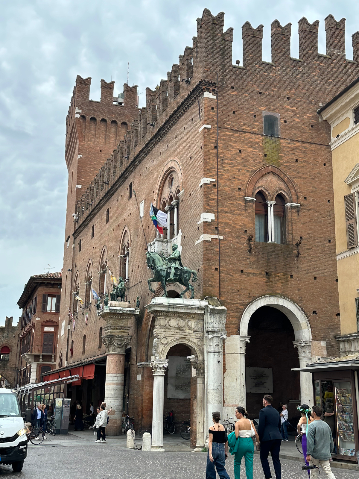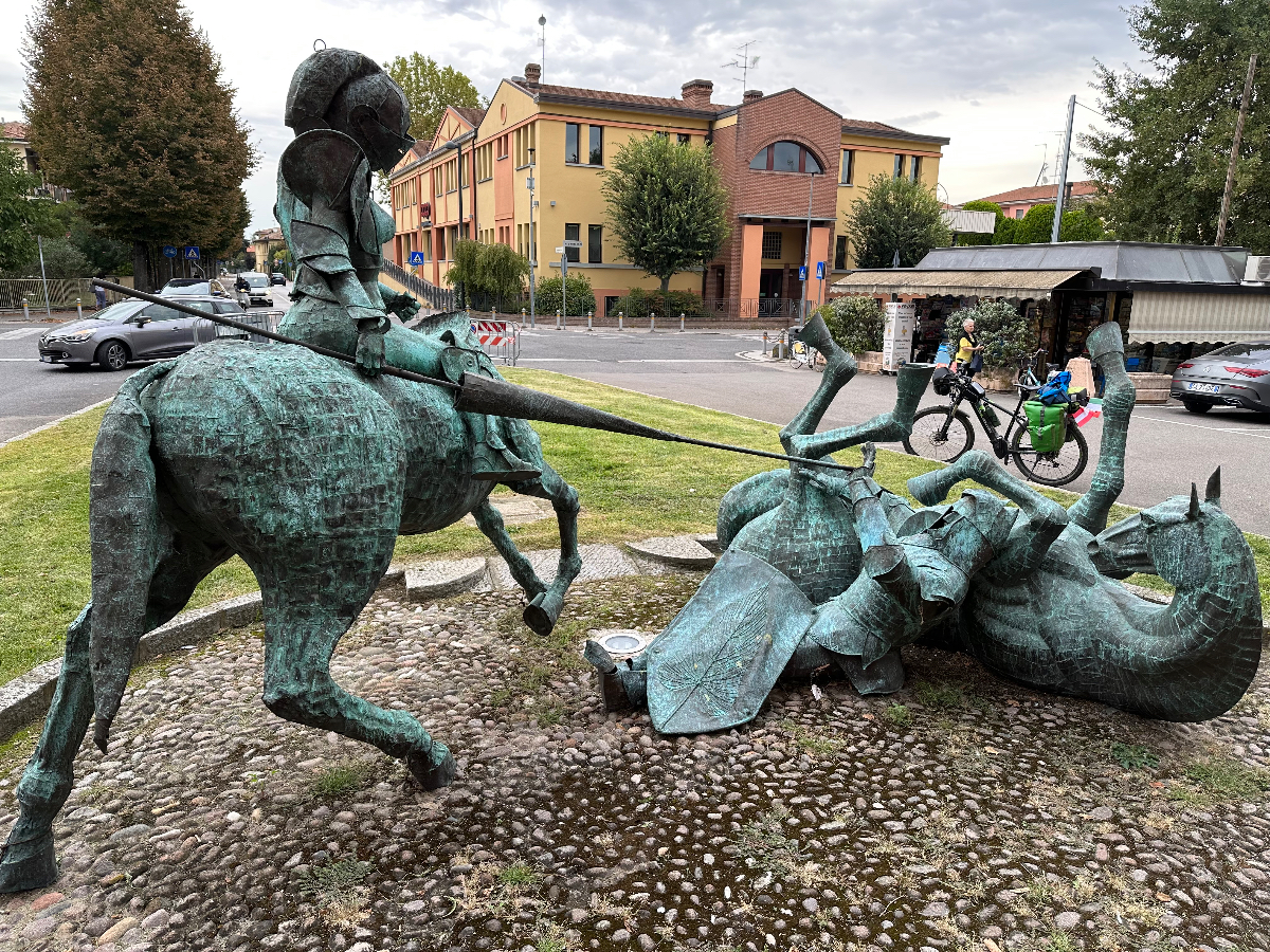 Was ich bisher vergessen habe zu erwähnen, vorgestern als ich bei casa Torre ankam, hatte ich genau 2022km am Display, ich schätze, so 2500km werden es in Summe werden, bis ich zuhause bin. Heute ist seit längerem der erste Tag, an dem es morgens über 20 Grad hat, passt gut. Gestern habe ich erstmals mein „verbotenes“ Rücklicht angeschaltet, ich habe es aus Amerika importiert, es ist bei uns nicht erhältlich, weil verboten. Es ist so stark, dass der nachkommende Fahrer geblendet wird, wenn er direkt hinter mir fährt, aber ich bin schon aus einiger Entfernung wahrnehmbar, das ist bei schlechter Sicht und dichtem Verkehr wie eben gestern, ein echter Bonus! Italienische Straßenfahrer haben zum Teil auch ein sehr starkes Rücklicht, ich nehme an, hier ist es erlaubt. Meine heutige Tour geht bzw. fährt nach Ferrara, wieder entlang einer stark frequentierten direkten Verbindungsstraße. Zum Unterschied zu gestern, führt über ganz lange Streckenabschnitte ein schöner Radweg parallel zur Straße, zumeist auch baulich getrennt, ein Radfahrer Paradies. Die zuständigen Politiker in dieser Gegend Bologna und Ferrara müssen wohl selbst Radfahrer sein ;-) Ferrara hat darüber hinaus den Ruf, Italiens Radfahrer Hauptstadt zu sein. Es ist zwar sehr laut entlang der Straße, aber ich radle ganz entspannt dahin, kein Stress. Die Berge sind längst aus meinem Rückspiegel verschwunden, vor mir liegt wieder die schon bekannte Po Ebene. Von den heutigen 67 Kilometer der Gesamtstrecke, waren es sicher 45 Kilometer Radwege. Als der Radweg endet, ändert sich auch das Wetter, es beginnt leicht zu regnen. Regenschutz auf den Helm, Regenjacke an und das xx-starke Rücklicht ein. Ich fahre wieder auf scheinbar unendlich langen, geraden Straßen dahin, das Ende kann man nur ahnen. In der Ferne taucht schemenhaft ein Kirchturm auf, dort werde ich einmal einen Unterstand suchen und im Internet nachsehen, wie sich das Wetter entwickeln wird. Ich komme näher, aber nicht nahe, denn die Straße macht einen 90 Grad Schwenk, und vor mir die nächste unendlich lange Gerade, und es beginnt stärker zu regnen. Unter einem großen Baum bleibe ich schließlich stehen, und krame aus einer Packtasche – natürlich ganz zuunterst – meine Regenhose hervor, und es geht weiter. Der paradoxe Nachteil dieser regendichten Bekleidung ist der, dass sie dicht ist. Von außen dringt kein Wasser ein, trotzdem spüre ich, wie mir innen das Wasser den Körper hinunter rinnt. Es ist kühler geworden, da wird das Köcheln im eigenen Saft fast schon wieder zum Vorteil, solange man sich bewegt. Deshalb beschließe ich auch, keinen Halt mehr einzulegen, sondern schnellstmöglich zu meinem Quartier zu radeln. Kurz nach zwölf erreiche ich schon Ferrara, ich muss aber durch die Stadt, mein Hotel liegt in einem Vorort. Kein Problem, dass ich so früh da bin, mein Zimmer ist fertig, ich kann einchecken. Mein Rad ist im Heizkeller sicher verstaut, und ich habe mir fest vorgenommen, es heute auch nicht mehr zu bewegen, ganz egal welche Sehenswürdigkeiten die City auch zu bieten hat. Nach dem Duschen gehe ich ins hauseigene Restaurant und esse ein als lokale Spezialität angepriesenes Nudelgericht, Bandnudeln, hier vorwiegend Eierteigwaren! mit einer Tomatensoße mit einer nur hier erhältlichen Salami. Dazu ein Glas Rotwein, vino della casa und zum Abschluss ein Tiramisu. Eigentlich wäre ich jetzt bereit für ein Mittagsschläfchen, aber da kommt mir die Statistik in den Sinn, die mir Ingo vor einigen Tagen geschickt hat. Von 1. September bis zum 13. September hat dieser Blog 585 verschiedene Besucher mit 1.223 Besuchen 10.673 Seitenaufrufen und 107.760 Zugriffen verzeichnet, und heute ist bereits der 22! Da bin ich all diesen Besuchern und zahlreichen Unterstützern wohl schuldig, ein paar Fotos aus der Region zu liefern. Ich mache mich auf und chartere ein Taxi. Der Fahrer erzählt mir allerhand interessantes zur Stadt, eine zur Gänze vorhandene Stadtmauer die begehbar und mit dem Rad befahrbar ist, (Ferrara ist eine der Städte mit der höchsten Fahrraddichte der Welt!), wir fahren am Palazzo di Diamanti mit seiner Fassade von 8000 pyramidenförmigen Steinen vorbei, und er zeigt mir das Geburtshaus von Ettore Bugatti, der Namensgeber der gleichnamigen französischen Automarke. Lustig ist auch, dass hier in Ferrara einer der häufigsten Familiennamen Ferrari ist :-) Mitten im Zentrum, beim Castello Estense, steige ich aus dem Taxi und bedanke mich für die interessante Fahrt. Ich vermute, heute muss hier Sponsion oder Promotion gefeiert werden, überall stehen mit einem Blumenkranz geschmückte junge Frauen inmitten von Freunden und Familie, die sie feiern und fotografieren. Über den Platz und in den Gassen wird lauthals gesungen, mit dem Refrain Dottore, Dottore…. Es ist insgesamt angenehm viel los, kein Vergleich zu den unlängst besuchten Kult Städten. Wieder schlendere ich durch die Gassen und über Plätze, lass mich treiben und fotografiere auch, und gönne mir ein Eis. Diese Fotos kosten mich 48 Euro fürs Taxi, aber ich bin sehr froh, dass ich mich aufgerafft habe, Ferrara wird mir sehr angenehm in Erinnerung bleiben. Obwohl auch hier in und um die Stadt ein enormes Verkehrsaufkommen herrsch, ist die Luft klar. Ganz anders gestern in Bologna, dort ist die Luft von Abgasen geschwängert, es ist kaum auszuhalten gewesen. Marteen und Dominique, die beiden Holländer von der Casa Terre haben mir erzählt, wenn sie Sehnsucht nach der Stadt haben, fahren sie nach Bologna. Beide sind Raucher, aber wenn sie nach einigen Tagen Bologna wieder nach Hause kommen, spucken sie schwarzen Schleim aus. Ekelhaft, aber nachvollziehbar, wenn man da gewesen ist. Mittlerweile ist es 20:15 ich werde versuchen noch heute Fotos hochzuladen, habe aber wenig Hoffnung dass es hinhaut, die Internetverbindung ist sehr, sehr, sehr mau…..