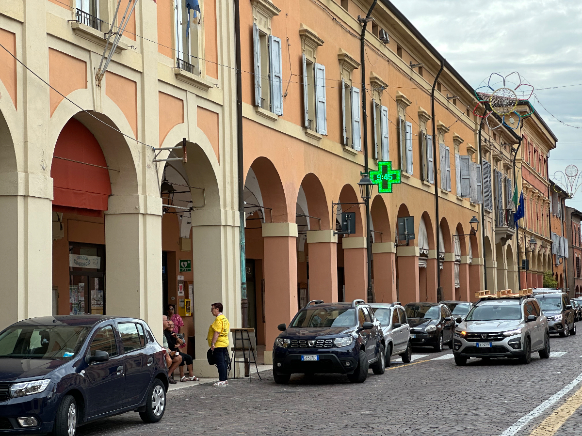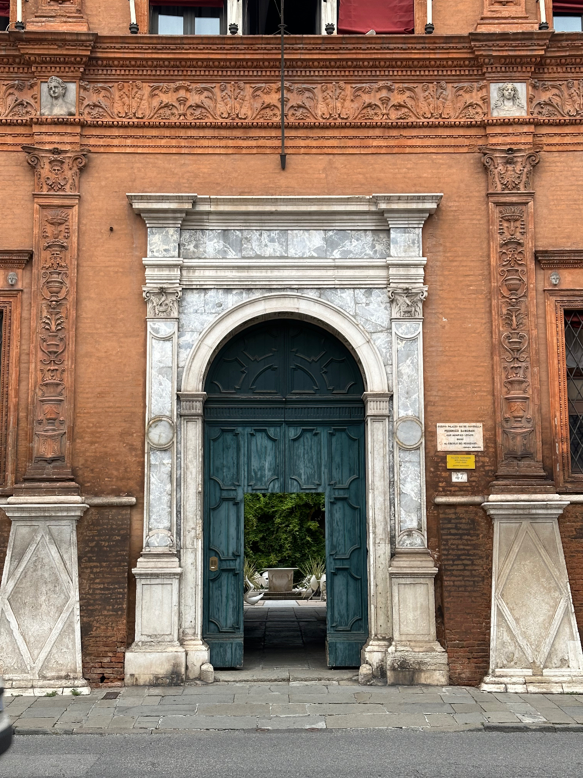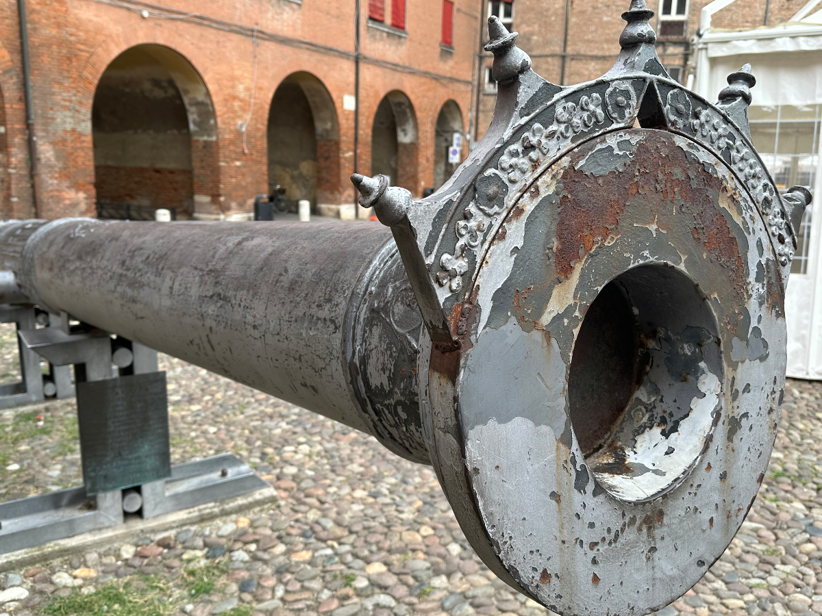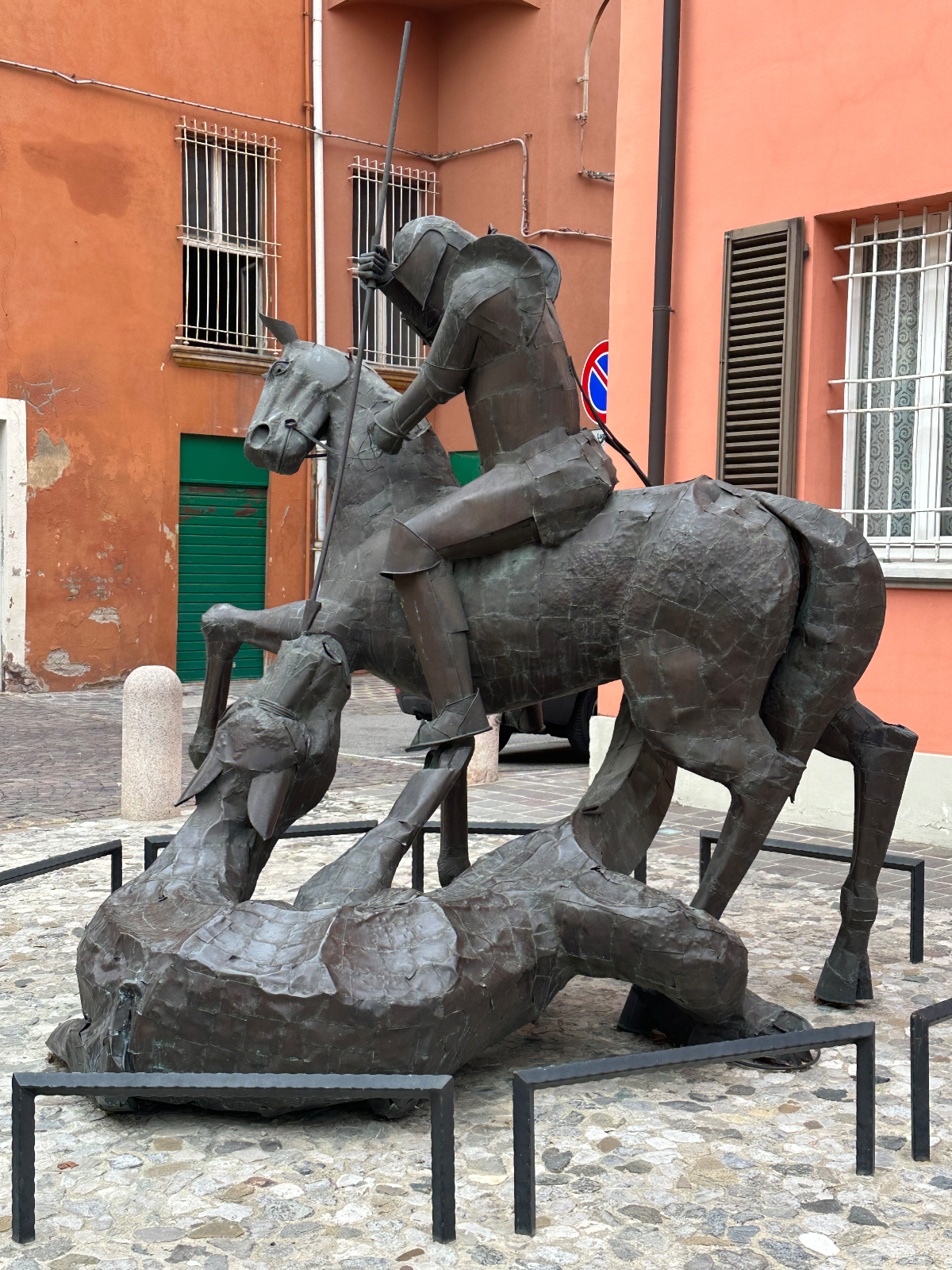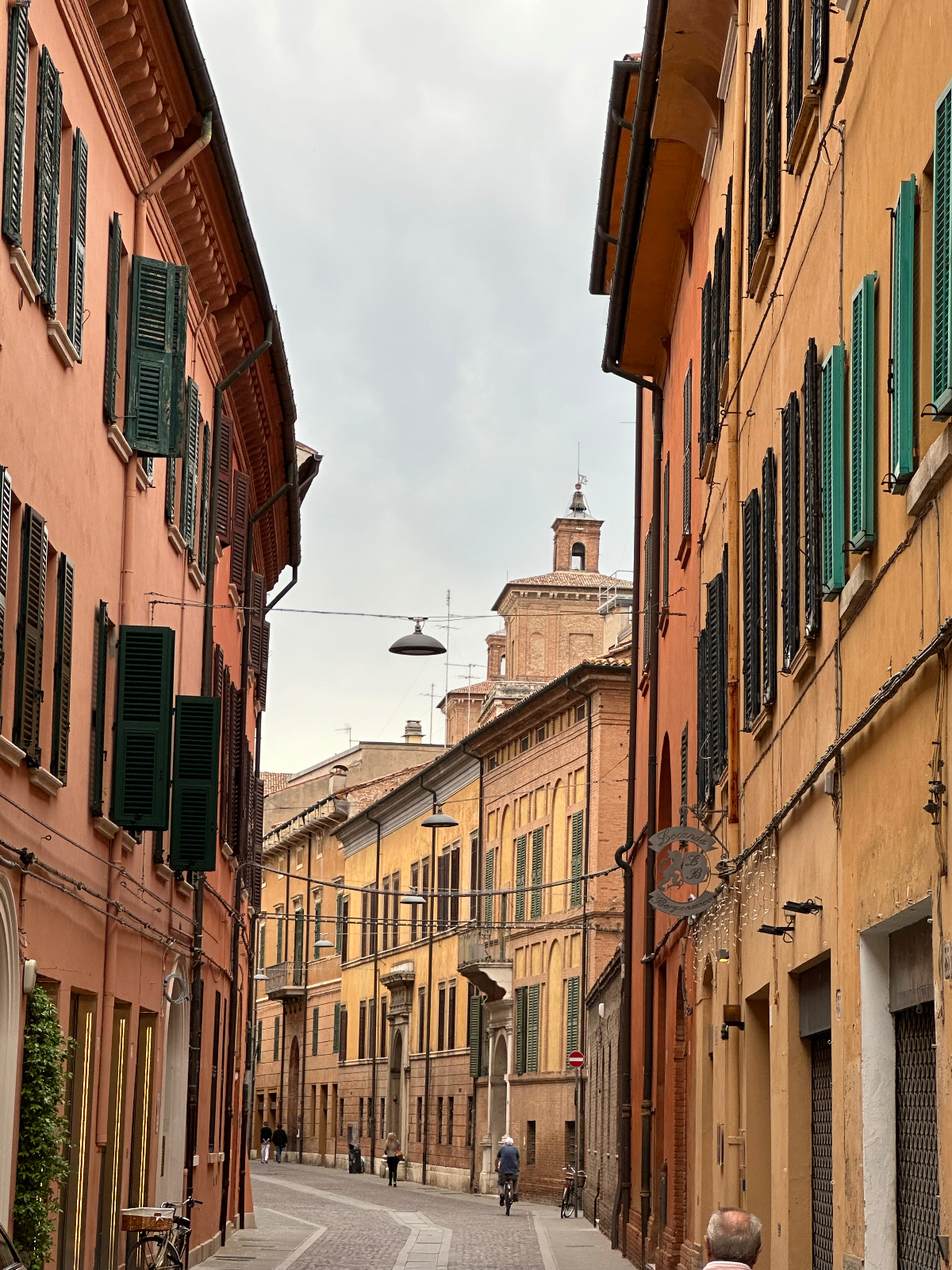 Was ich bisher vergessen habe zu erwähnen, vorgestern als ich bei casa Torre ankam, hatte ich genau 2022km am Display, ich schätze, so 2500km werden es in Summe werden, bis ich zuhause bin. Heute ist seit längerem der erste Tag, an dem es morgens über 20 Grad hat, passt gut. Gestern habe ich erstmals mein „verbotenes“ Rücklicht angeschaltet, ich habe es aus Amerika importiert, es ist bei uns nicht erhältlich, weil verboten. Es ist so stark, dass der nachkommende Fahrer geblendet wird, wenn er direkt hinter mir fährt, aber ich bin schon aus einiger Entfernung wahrnehmbar, das ist bei schlechter Sicht und dichtem Verkehr wie eben gestern, ein echter Bonus! Italienische Straßenfahrer haben zum Teil auch ein sehr starkes Rücklicht, ich nehme an, hier ist es erlaubt. Meine heutige Tour geht bzw. fährt nach Ferrara, wieder entlang einer stark frequentierten direkten Verbindungsstraße. Zum Unterschied zu gestern, führt über ganz lange Streckenabschnitte ein schöner Radweg parallel zur Straße, zumeist auch baulich getrennt, ein Radfahrer Paradies. Die zuständigen Politiker in dieser Gegend Bologna und Ferrara müssen wohl selbst Radfahrer sein ;-) Ferrara hat darüber hinaus den Ruf, Italiens Radfahrer Hauptstadt zu sein. Es ist zwar sehr laut entlang der Straße, aber ich radle ganz entspannt dahin, kein Stress. Die Berge sind längst aus meinem Rückspiegel verschwunden, vor mir liegt wieder die schon bekannte Po Ebene. Von den heutigen 67 Kilometer der Gesamtstrecke, waren es sicher 45 Kilometer Radwege. Als der Radweg endet, ändert sich auch das Wetter, es beginnt leicht zu regnen. Regenschutz auf den Helm, Regenjacke an und das xx-starke Rücklicht ein. Ich fahre wieder auf scheinbar unendlich langen, geraden Straßen dahin, das Ende kann man nur ahnen. In der Ferne taucht schemenhaft ein Kirchturm auf, dort werde ich einmal einen Unterstand suchen und im Internet nachsehen, wie sich das Wetter entwickeln wird. Ich komme näher, aber nicht nahe, denn die Straße macht einen 90 Grad Schwenk, und vor mir die nächste unendlich lange Gerade, und es beginnt stärker zu regnen. Unter einem großen Baum bleibe ich schließlich stehen, und krame aus einer Packtasche – natürlich ganz zuunterst – meine Regenhose hervor, und es geht weiter. Der paradoxe Nachteil dieser regendichten Bekleidung ist der, dass sie dicht ist. Von außen dringt kein Wasser ein, trotzdem spüre ich, wie mir innen das Wasser den Körper hinunter rinnt. Es ist kühler geworden, da wird das Köcheln im eigenen Saft fast schon wieder zum Vorteil, solange man sich bewegt. Deshalb beschließe ich auch, keinen Halt mehr einzulegen, sondern schnellstmöglich zu meinem Quartier zu radeln. Kurz nach zwölf erreiche ich schon Ferrara, ich muss aber durch die Stadt, mein Hotel liegt in einem Vorort. Kein Problem, dass ich so früh da bin, mein Zimmer ist fertig, ich kann einchecken. Mein Rad ist im Heizkeller sicher verstaut, und ich habe mir fest vorgenommen, es heute auch nicht mehr zu bewegen, ganz egal welche Sehenswürdigkeiten die City auch zu bieten hat. Nach dem Duschen gehe ich ins hauseigene Restaurant und esse ein als lokale Spezialität angepriesenes Nudelgericht, Bandnudeln, hier vorwiegend Eierteigwaren! mit einer Tomatensoße mit einer nur hier erhältlichen Salami. Dazu ein Glas Rotwein, vino della casa und zum Abschluss ein Tiramisu. Eigentlich wäre ich jetzt bereit für ein Mittagsschläfchen, aber da kommt mir die Statistik in den Sinn, die mir Ingo vor einigen Tagen geschickt hat. Von 1. September bis zum 13. September hat dieser Blog 585 verschiedene Besucher mit 1.223 Besuchen 10.673 Seitenaufrufen und 107.760 Zugriffen verzeichnet, und heute ist bereits der 22! Da bin ich all diesen Besuchern und zahlreichen Unterstützern wohl schuldig, ein paar Fotos aus der Region zu liefern. Ich mache mich auf und chartere ein Taxi. Der Fahrer erzählt mir allerhand interessantes zur Stadt, eine zur Gänze vorhandene Stadtmauer die begehbar und mit dem Rad befahrbar ist, (Ferrara ist eine der Städte mit der höchsten Fahrraddichte der Welt!), wir fahren am Palazzo di Diamanti mit seiner Fassade von 8000 pyramidenförmigen Steinen vorbei, und er zeigt mir das Geburtshaus von Ettore Bugatti, der Namensgeber der gleichnamigen französischen Automarke. Lustig ist auch, dass hier in Ferrara einer der häufigsten Familiennamen Ferrari ist :-) Mitten im Zentrum, beim Castello Estense, steige ich aus dem Taxi und bedanke mich für die interessante Fahrt. Ich vermute, heute muss hier Sponsion oder Promotion gefeiert werden, überall stehen mit einem Blumenkranz geschmückte junge Frauen inmitten von Freunden und Familie, die sie feiern und fotografieren. Über den Platz und in den Gassen wird lauthals gesungen, mit dem Refrain Dottore, Dottore…. Es ist insgesamt angenehm viel los, kein Vergleich zu den unlängst besuchten Kult Städten. Wieder schlendere ich durch die Gassen und über Plätze, lass mich treiben und fotografiere auch, und gönne mir ein Eis. Diese Fotos kosten mich 48 Euro fürs Taxi, aber ich bin sehr froh, dass ich mich aufgerafft habe, Ferrara wird mir sehr angenehm in Erinnerung bleiben. Obwohl auch hier in und um die Stadt ein enormes Verkehrsaufkommen herrsch, ist die Luft klar. Ganz anders gestern in Bologna, dort ist die Luft von Abgasen geschwängert, es ist kaum auszuhalten gewesen. Marteen und Dominique, die beiden Holländer von der Casa Terre haben mir erzählt, wenn sie Sehnsucht nach der Stadt haben, fahren sie nach Bologna. Beide sind Raucher, aber wenn sie nach einigen Tagen Bologna wieder nach Hause kommen, spucken sie schwarzen Schleim aus. Ekelhaft, aber nachvollziehbar, wenn man da gewesen ist. Mittlerweile ist es 20:15 ich werde versuchen noch heute Fotos hochzuladen, habe aber wenig Hoffnung dass es hinhaut, die Internetverbindung ist sehr, sehr, sehr mau…..