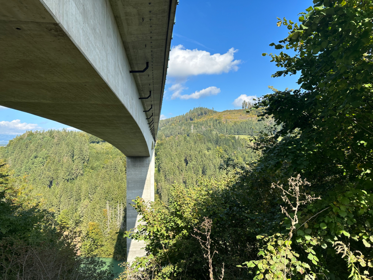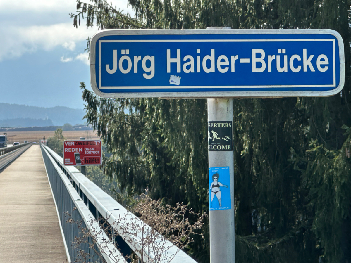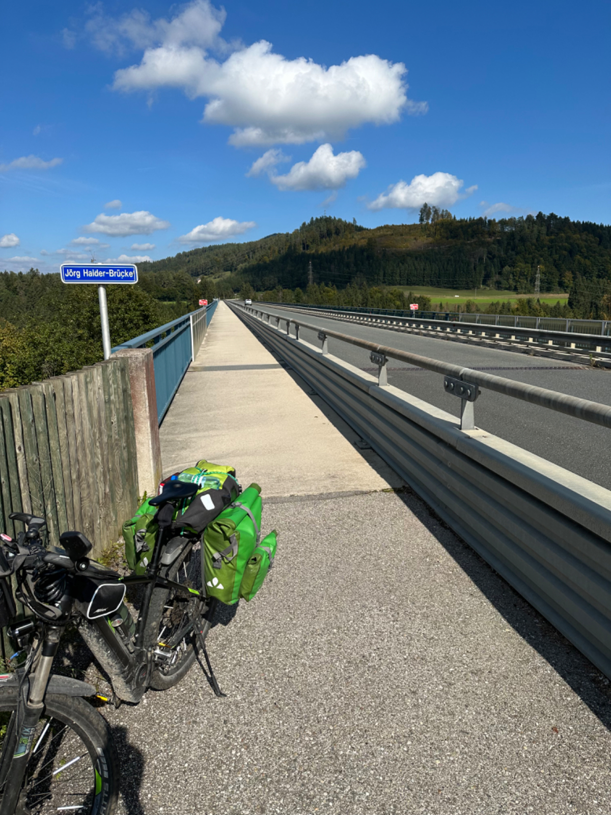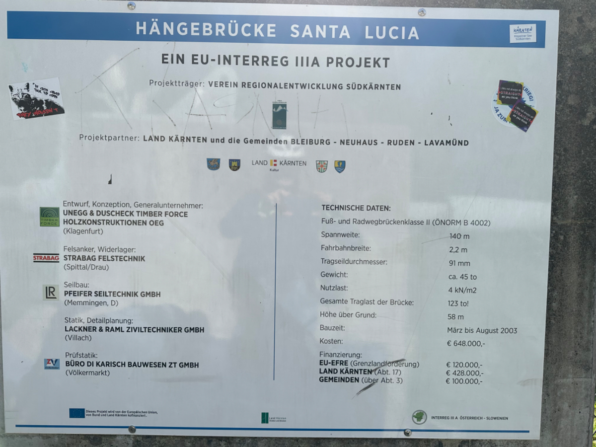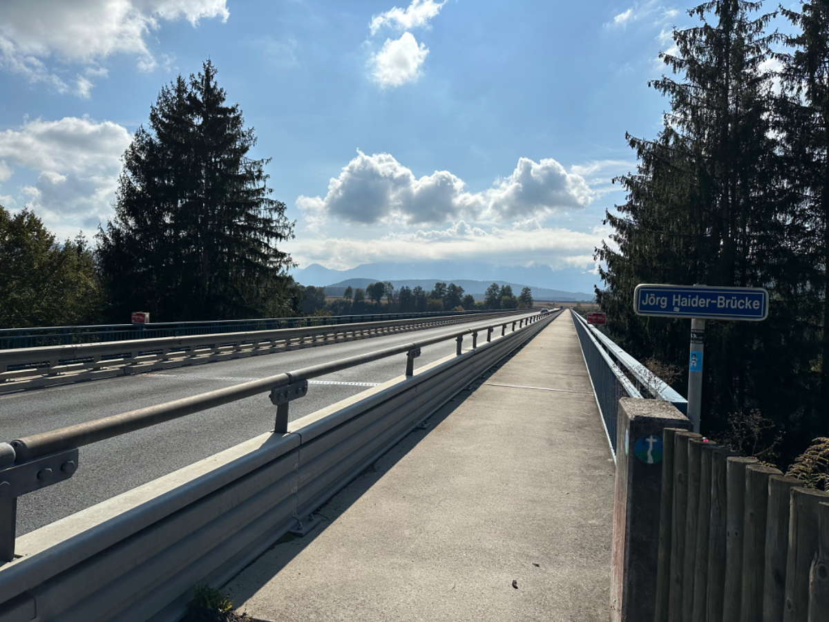 Es ist bereits nach zehn Uhr, als ich mich auf das Rad schwinge. Heute habe ich alle Zeit der Welt, so mein Gefühl, heute fahre ich mit knapp fünfzig Kilometer die kürzeste Etappe der gesamten Tour, und die Wettervorhersage war auch vielversprechend. Nach der letzten Nacht bin ich froh, dass die Rückenschmerzen der Nacht sich mit dem Verlassen dieser unseligen, ultraweichen Bettstatt nicht manifestiert haben, alles gut :-) Noch ist es bewölkt und recht kühl, aber es geht gut dahin. Ich habe mir vorgenommen, heute wirklich zu bummeln und die Fahrt an jedem Kilometer bewusst zu genießen, doch so einfach ist das gar nicht, ich bin es seit Wochen gewöhnt, immer recht zügig zu fahren. So wird auch der Radweg am Damm entlang der Drau als sehr angenehm erlebbar ;-) Wieder fahre ich durch Dörfer, es geht rauf und runter, fast schon wie in der Toskana, halt wirklich nur fast. Bevor ich Völkermarkt erreiche, beginnt der Bereich mit den extremen Sturmschäden im Wald. Die vor sechs Wochen noch überall sichtbaren Schäden sind großteils aufgearbeitet, überall im Wald hört man das Kreischen der Motorsägen, große Stapel von abgelängten Baumstämmen warten auf ihren Abtransport. Dann setzt sich endlich die Sonne durch, es wird angenehm warm, die Jacke kann weg. Jetzt wird das Radfahren zu einer Genussfahrt durch die sonnenbeschiene Herbstlandschaft, es macht richtig Freude. Heute ist ja der Tag des Lächelns, das fällt mir heute auch wirklich nicht schwer :-) Bei Ruden mache ich an einem Rastplatz halt und genieße die warmen Sonnenstrahlen, was für ein Tag! Dann erreiche ich die Jörg Haider Brücke, die über die Drau führt und Ruden und Bleiburg verbindet. Es ist Kärntens höchste Brücke, mit Höhenangst ausgestattet kostete es mich große Überwindung in der Brückenmitte abzusteigen, hinunter zu schauen und Fotos zu machen, ich war froh, als ich die Brücke hinter mir hatte. Eine weitere Brücke hatte ich noch vor mir, über die ich vor Wochen schon das Rad geschoben habe, die Hängebrücke Santa Lucia über den fünfzig Meter tiefen Feistritzbachgraben. Vor der Brücke treffe ich einen Mann, der sich die Sonne auf den gebräunten Körper scheinen lässt. Ernsti ist mit seiner Begleiterin Hanni gestern in Bleiburg bei einem Jazz Konzert gewesen. Er erzählt mir, dass er schon Spanien und Portugal durchwandert hat. Heute wollen sie noch das Liaunig Museum besuchen. Noch ein paar Fotos, und mit guten Wünschen fahre ich weiter. Schön euch kennengelernt zu haben! Die Fahrt über die Brücke ist ok, ich schaue halt nur gerade voraus und nicht links oder rechts hinunter. Nach Lavamünd ist nun nicht mehr weit, als ich gerade eine Anhöhe hinunterrolle, sehe ich auf der anderen Straßenseite das Liaunig Museum. Spontan kehre ich um und fahre hin. Die Zufahrt ist für Fahrräder verboten, ich fahre trotzdem hinein, ich möchte ja nur ein paar Fotos machen. Es dauert nicht lange, da kommt eine junge Frau heraus und auf mich zu. Ich bin schon auf einen Verweis eingestellt, doch sie fragt mich freundlich, ob sie mir weiterhelfen kann, und überreicht mir einen Folder des Museums. Ich bekomme einen Privatvortrag zur Geschichte des Museums, dessen Gründer, der Industrielle Herbert Liaunig, erst letzten Freitag verstorben ist. Die schwarze Fahne an der Einfahrt war mir aufgefallen. Es war sehr interessant, nicht ausgeschlossen, dass ich das Museum einmal besuchen werde. Kurz nach 14 Uhr erreiche ich Lavamünd, trinke im sonnigen Gastgarten ein Ankommensbier, checke ein, dusche, und dennoch ist noch reichlich Zeit bis 17 Uhr, erst dann gibt es was zu essen. Ich gehe spazieren, mit Attraktionen ist dieser Ort wahrlich nicht gesegnet. Was auffällt, sind die kürzlich erfolgten Bauarbeiten zur Hochwasservermeidung. Hier, am Zusammenfluss der Lavant in die Drau, gab es wohl schon die eine oder andere Katastrophe. Alles andere als eine Katastrophe war dann mein Abendessen, zuerst Käsespätzle, doch dann das kulinarische Highlight, Kärntner Nudeln mit Topfen und Marillen, wow, was für ein Genuss! :-) dazu ein Glas Chardonnay........ im Radio habe ich einen italienischen Sender gefunden, ich verstehe zwar kaum etwas, aber es fühlt sich heute einfach gut an :-)