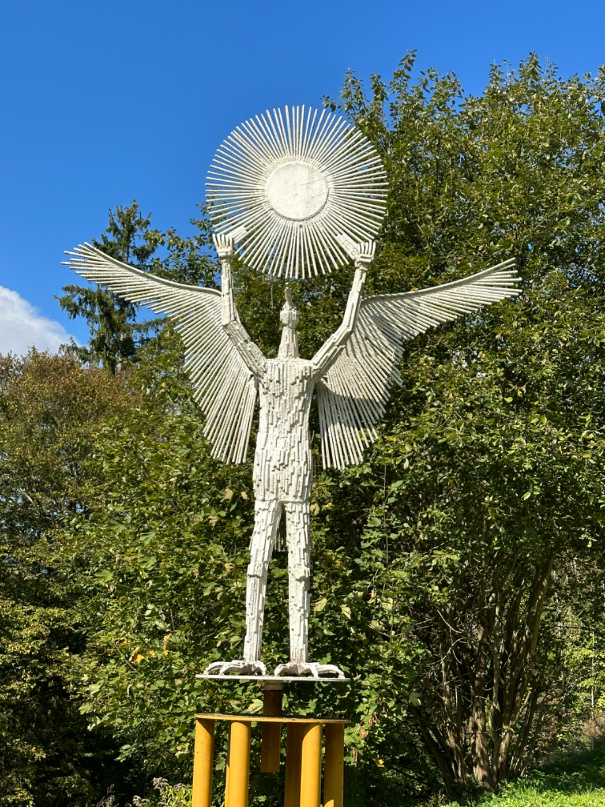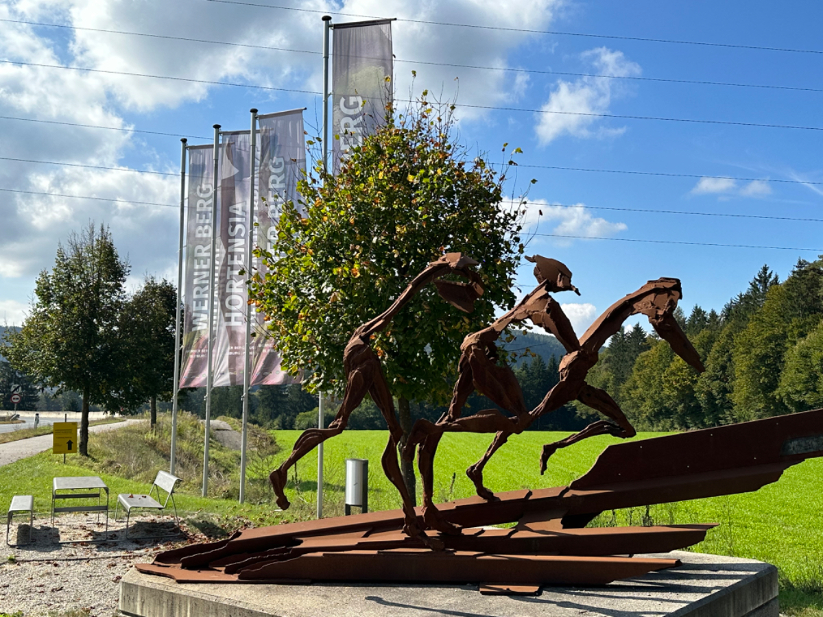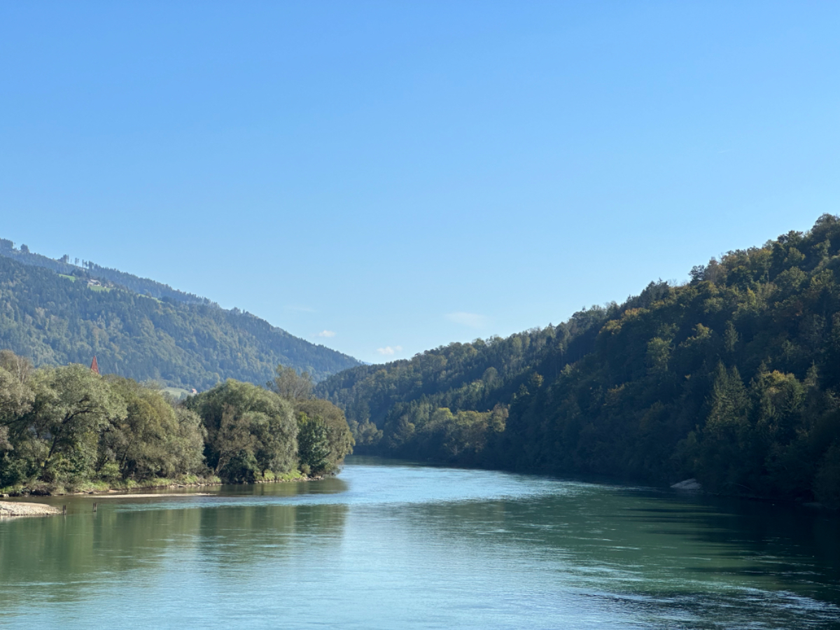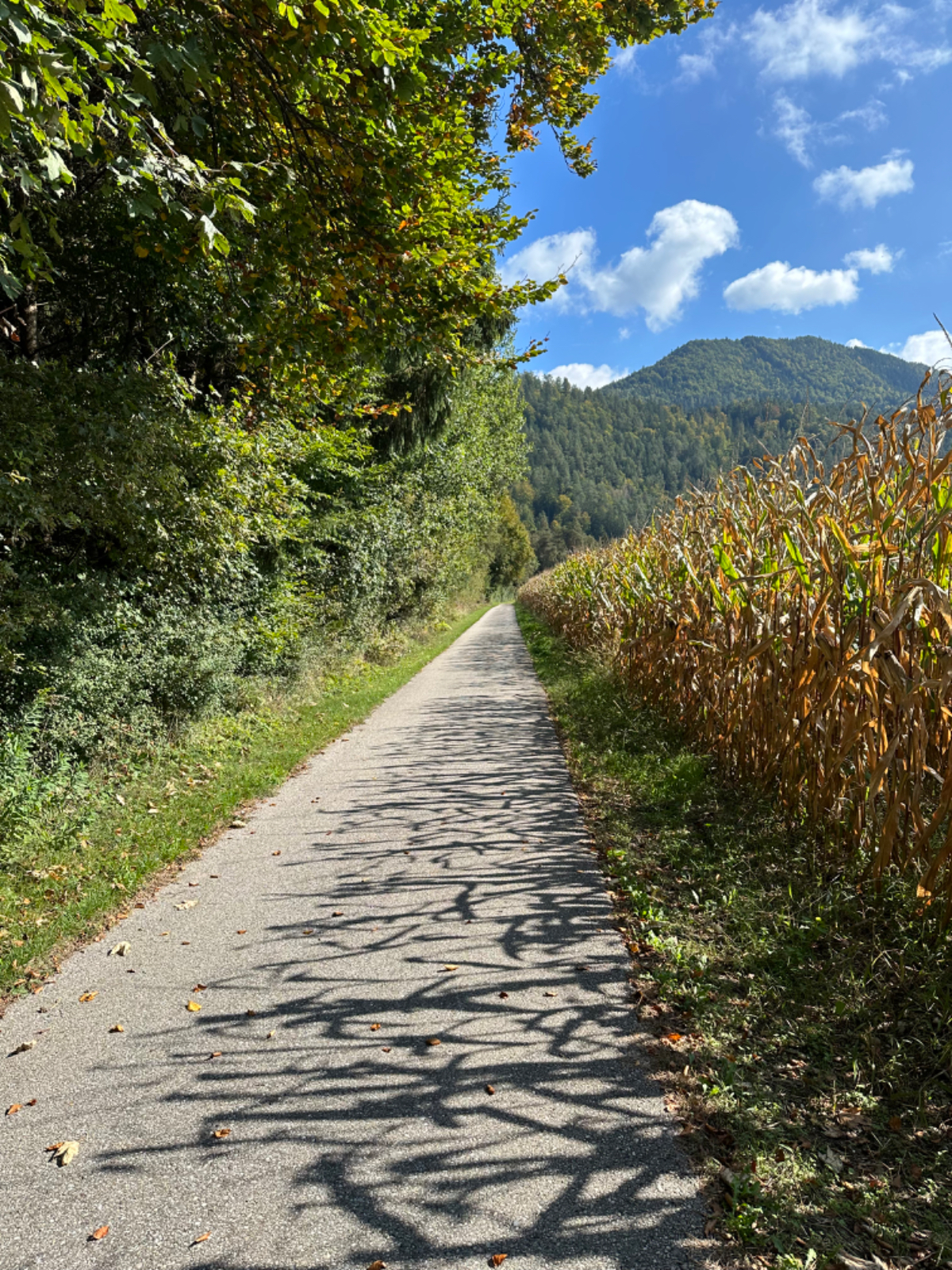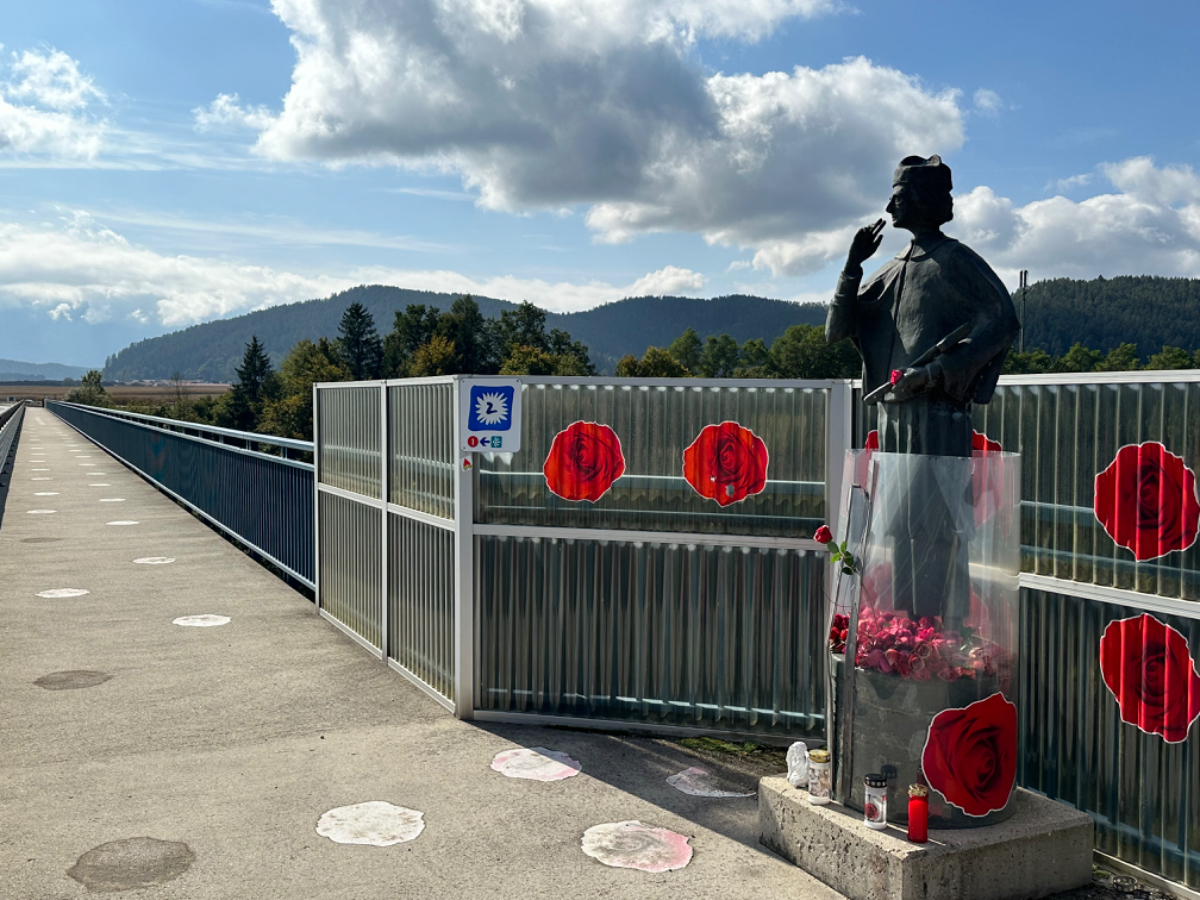 Es ist bereits nach zehn Uhr, als ich mich auf das Rad schwinge. Heute habe ich alle Zeit der Welt, so mein Gefühl, heute fahre ich mit knapp fünfzig Kilometer die kürzeste Etappe der gesamten Tour, und die Wettervorhersage war auch vielversprechend. Nach der letzten Nacht bin ich froh, dass die Rückenschmerzen der Nacht sich mit dem Verlassen dieser unseligen, ultraweichen Bettstatt nicht manifestiert haben, alles gut :-) Noch ist es bewölkt und recht kühl, aber es geht gut dahin. Ich habe mir vorgenommen, heute wirklich zu bummeln und die Fahrt an jedem Kilometer bewusst zu genießen, doch so einfach ist das gar nicht, ich bin es seit Wochen gewöhnt, immer recht zügig zu fahren. So wird auch der Radweg am Damm entlang der Drau als sehr angenehm erlebbar ;-) Wieder fahre ich durch Dörfer, es geht rauf und runter, fast schon wie in der Toskana, halt wirklich nur fast. Bevor ich Völkermarkt erreiche, beginnt der Bereich mit den extremen Sturmschäden im Wald. Die vor sechs Wochen noch überall sichtbaren Schäden sind großteils aufgearbeitet, überall im Wald hört man das Kreischen der Motorsägen, große Stapel von abgelängten Baumstämmen warten auf ihren Abtransport. Dann setzt sich endlich die Sonne durch, es wird angenehm warm, die Jacke kann weg. Jetzt wird das Radfahren zu einer Genussfahrt durch die sonnenbeschiene Herbstlandschaft, es macht richtig Freude. Heute ist ja der Tag des Lächelns, das fällt mir heute auch wirklich nicht schwer :-) Bei Ruden mache ich an einem Rastplatz halt und genieße die warmen Sonnenstrahlen, was für ein Tag! Dann erreiche ich die Jörg Haider Brücke, die über die Drau führt und Ruden und Bleiburg verbindet. Es ist Kärntens höchste Brücke, mit Höhenangst ausgestattet kostete es mich große Überwindung in der Brückenmitte abzusteigen, hinunter zu schauen und Fotos zu machen, ich war froh, als ich die Brücke hinter mir hatte. Eine weitere Brücke hatte ich noch vor mir, über die ich vor Wochen schon das Rad geschoben habe, die Hängebrücke Santa Lucia über den fünfzig Meter tiefen Feistritzbachgraben. Vor der Brücke treffe ich einen Mann, der sich die Sonne auf den gebräunten Körper scheinen lässt. Ernsti ist mit seiner Begleiterin Hanni gestern in Bleiburg bei einem Jazz Konzert gewesen. Er erzählt mir, dass er schon Spanien und Portugal durchwandert hat. Heute wollen sie noch das Liaunig Museum besuchen. Noch ein paar Fotos, und mit guten Wünschen fahre ich weiter. Schön euch kennengelernt zu haben! Die Fahrt über die Brücke ist ok, ich schaue halt nur gerade voraus und nicht links oder rechts hinunter. Nach Lavamünd ist nun nicht mehr weit, als ich gerade eine Anhöhe hinunterrolle, sehe ich auf der anderen Straßenseite das Liaunig Museum. Spontan kehre ich um und fahre hin. Die Zufahrt ist für Fahrräder verboten, ich fahre trotzdem hinein, ich möchte ja nur ein paar Fotos machen. Es dauert nicht lange, da kommt eine junge Frau heraus und auf mich zu. Ich bin schon auf einen Verweis eingestellt, doch sie fragt mich freundlich, ob sie mir weiterhelfen kann, und überreicht mir einen Folder des Museums. Ich bekomme einen Privatvortrag zur Geschichte des Museums, dessen Gründer, der Industrielle Herbert Liaunig, erst letzten Freitag verstorben ist. Die schwarze Fahne an der Einfahrt war mir aufgefallen. Es war sehr interessant, nicht ausgeschlossen, dass ich das Museum einmal besuchen werde. Kurz nach 14 Uhr erreiche ich Lavamünd, trinke im sonnigen Gastgarten ein Ankommensbier, checke ein, dusche, und dennoch ist noch reichlich Zeit bis 17 Uhr, erst dann gibt es was zu essen. Ich gehe spazieren, mit Attraktionen ist dieser Ort wahrlich nicht gesegnet. Was auffällt, sind die kürzlich erfolgten Bauarbeiten zur Hochwasservermeidung. Hier, am Zusammenfluss der Lavant in die Drau, gab es wohl schon die eine oder andere Katastrophe. Alles andere als eine Katastrophe war dann mein Abendessen, zuerst Käsespätzle, doch dann das kulinarische Highlight, Kärntner Nudeln mit Topfen und Marillen, wow, was für ein Genuss! :-) dazu ein Glas Chardonnay........ im Radio habe ich einen italienischen Sender gefunden, ich verstehe zwar kaum etwas, aber es fühlt sich heute einfach gut an :-)