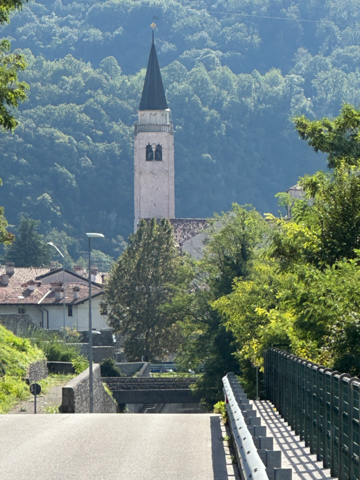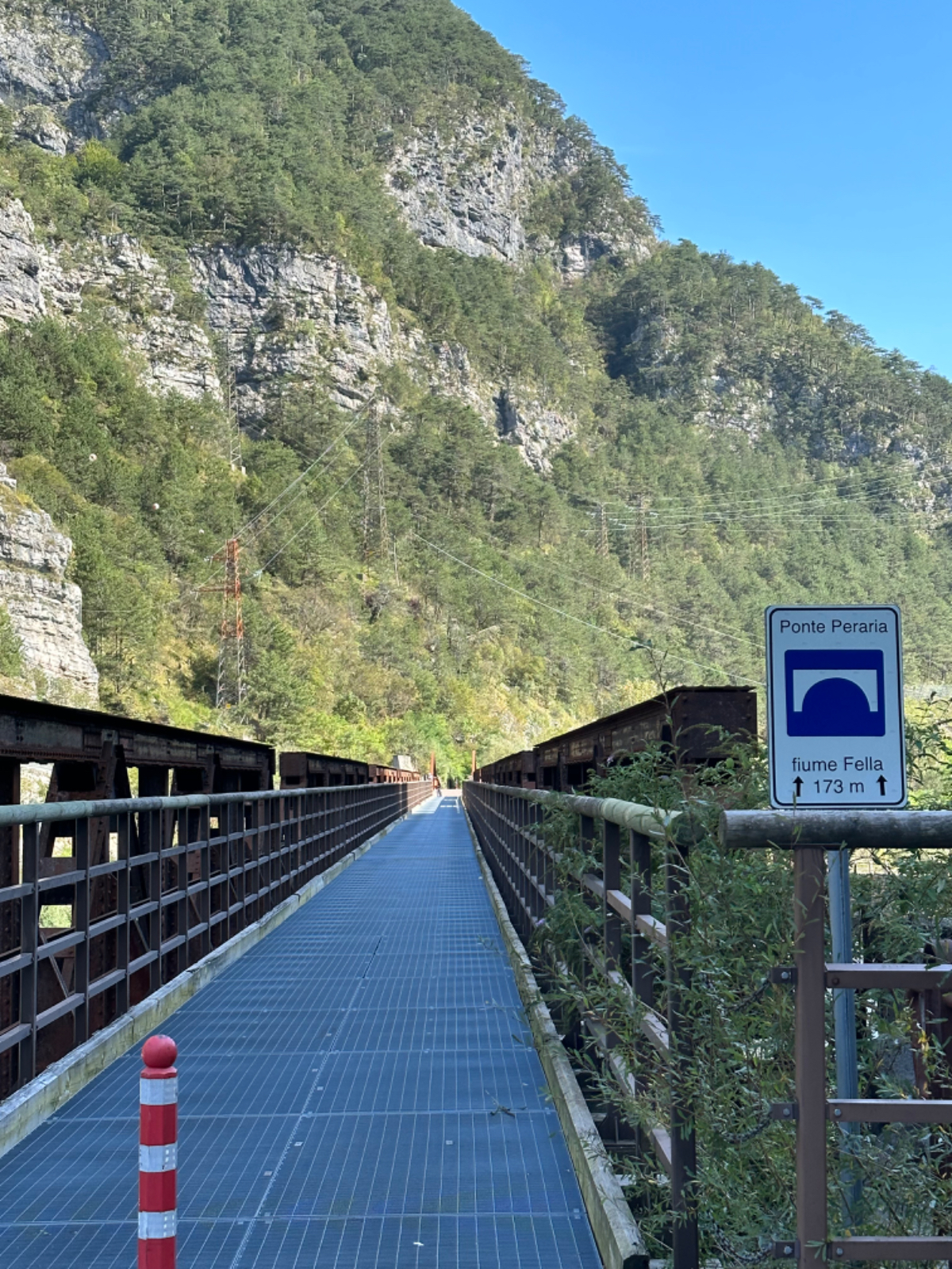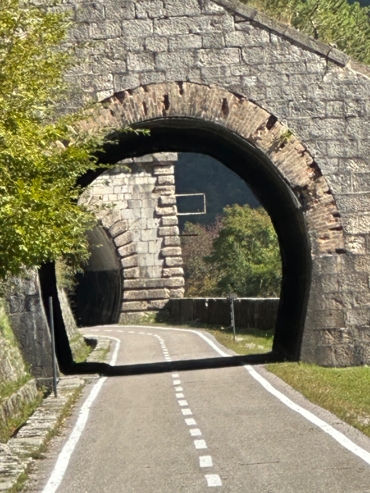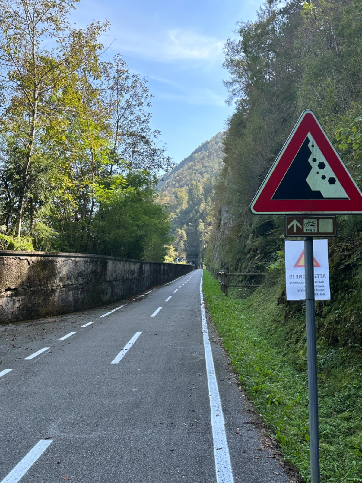 Das Hotel President in Spilimbergo ist ein weiteres auf meiner Reise, das ein großes Restaurant hat, welches aber nicht mehr geöffnet ist. Überall nur noch bed & breakfast, aber das Frühstück war sehr in Ordnung. Das Rad war im Keller sicher untergebracht, auch diesbezüglich hatte ich immer Glück. Beim Rausfahren aus Spilimbergo zeigt sich, dieser Ort ist größer als ich dachte, aber mit dem Navi keinerlei Probleme, die richtigen Wege zu finden. Kaum aus der Stadt, werde ich gleich auf einen Nebenweg geleitet. Nicht schon wieder! Wieder eine derartige Rumpelpiste, dass es kaum ein Vorankommen gibt. Endlich wieder auf der Straße, beschließe ich, nur noch dieser zu folgen, solange es Sinn macht. Ich fahre auf die Berge zu, und bin schon gleich mitten drinnen, es steigt stetig an, wie es in den Bergen so ist ;-) Die Straße ist sehr schmal und kurvenreich, aber es herrscht kaum Verkehr, es geht gut voran. Ich erreiche den Lago di Cornino, einen idyllischen kleinen Bergsee. Dann geht es lange Zeit entlang des Tagliamento auf ruhigen Straßen dahin, bis ich eine Brücke erreiche. Auf der anderen Seite liegt Venzone, mein heutiges Zwischenziel nach 40 Kilometer. Durch das Stadttor erreiche ich einen Platz, an beiden Seiten eine Bar. Ich entscheide mich für links, der Platz liegt in der Sonne. Allerdings trifft das Angebot nicht meinen Geschmack, ich wechsle die Seiten. Gute Wahl, hier gibt es frischen Apfelstrudel, dazu einen café, da ist der Schattenplatz zu vernachlässigen. Am Nebentisch sitzt ein Paar, sie sind auch mit Rädern da. Ich frage nach dem woher und wohin, und erkundige mich über ihre auffallenden Bikes. Es sind Fahrräder aus Holz, eBikes, Made in Oberösterreich, cool! Die beiden, Elisabeth und Eugen kommen aus Wien, sie sind sowohl Motorrad wie auch Rad-Biker. Es war sehr angenehm mit ihnen zu plaudern, dann bekommen sie ihr Essen, und ich muss weiter. Habt noch eine schöne Zeit! :-) Der weitere Weg führt entlang der Bundesstraße bis kurz vor Moggio Udinese, immer leicht ansteigend, anders wird es heute auch nicht mehr. Ich fahre auf den Alpe Adria Radweg, den schönsten Abschnitt vor mir, die ehemalige Bahnstrecke Pontebbana, mit ihren zahllosen Tunnels - in denen es arschkalt ist - und herrlichen Ausblicken auf das Kanaltal. Diesen Weg bin ich schon dreimal gefahren, heute erstmals in die Gegenrichtung. Wie bereits gesagt, es geht nun 30 Kilometer stetig bergan, aber sehr moderat. Der erste Tunnel, wie alle weiteren, ist gut beleuchtet, viele Lichter im Gegenverkehr, es ist noch recht viel Verkehr in Richtung Süden. Wieviel es tatsächlich ist, sehe ich bei meinem nächsten Stopp in Chiusaforte, ein Restaurant in einer ehemalige Bahnstation. Ein älterer Herr, der auch gerade hier halt macht, sagt zu mir, hier stehen Räder im Wert von mindestens 100.000 Euro, er hat Recht! So voll ist es hier. Auch auf der gegenüberliegenden Straßenseite stehen Tische, hier wird mir ein Platz zugewiesen. Am Tisch ein Schild mit der Aufschrift " Riservato Peter 13:30" Mir ist nicht bewusst dass ich reserviert hätte, aber passt doch. Ich bestelle pasta con ragu und Wasser, da kommt eine größere Gruppe von Radlern an, die Reservierung Peter. Peter ist Hotelier in Bodensdorf, er macht mit seinen Gästen eine Tagestour von Tarvisio bis Moggio Udinese, dort werden sie wieder abgeholt. Eine nette Truppe aus Deutschen und Österreichern, wir plaudern eine Weile, dann muss ich aber weiter, wir wünschen uns zum Abschied noch eine gute Reise. Nach dem Essen ist es dann doch ein bisschen mühsam, aber ich finde bald wieder meinen Rhythmus. Pontebba ist bald erreicht, an der Ortseinfahrt eine Werkstatt, Alfa Marchesan. Dio mio, da werden Erinnerungen wach! Vor dreißig Jahren! bin erstmals mit einem Alfa hierher zu Walter gefahren, eine Reparatur die in Österreich ein kleines Vermögen gekostet hätte, wurde von Walter, einem Edelschrauber, kostengünstig erledigt. Seitdem bin ich immer wieder mit diversen Autos zu Walter gefahren. Wenn man die Gesamtkosten inkl. Anfahrt berechnet, war es nicht immer nur eine Kostenentscheidung, Walter hatte einfach mein ultimatives Vertrauen. Gerne hätte ich ihn heute wiedergesehen, doch er war nicht da, er ist auch schon in Pension. Das Albergo Spina in Pontebba ist einfach aber absolut ok, ein eigener abgesperrter Radraum und liegt direkt am Radweg. Bei meiner Ankunft hatte es noch angenehme 22 Grad, ich habe am Hauptplatz in der Sonne zwei kleine Bier genossen. Rund um Pontebba sind hohe Berge, da ist die Sonne leider bald verschwunden, und es wird schnell unangenehm kalt, ich muss hinein und eine Jacke anziehen. Morgens hat es hier zehn Grad ....... Das ist heute also l'ultima notte in Italia, kaum zu glauben, und auch wenn Riki es nicht versteht, es macht mich ein wenig schwermütig. Vielleicht sollte ich morgen umkehren und in den Süden radeln, Zeit habe ich, und die nächste Pension kommt auch in den kommenden Tagen auf's Konto ;-) Realistisch ist aber, morgen habe ich in Villach gebucht, da bleibe ich zwei Tage, ich habe keine saubere Wäsche mehr, und Riki braucht dringend eine Kettenpflege. Dann noch einige Tage am Drauradweg über Maribor heim nach Graz. Ich freue mich darauf! :-))