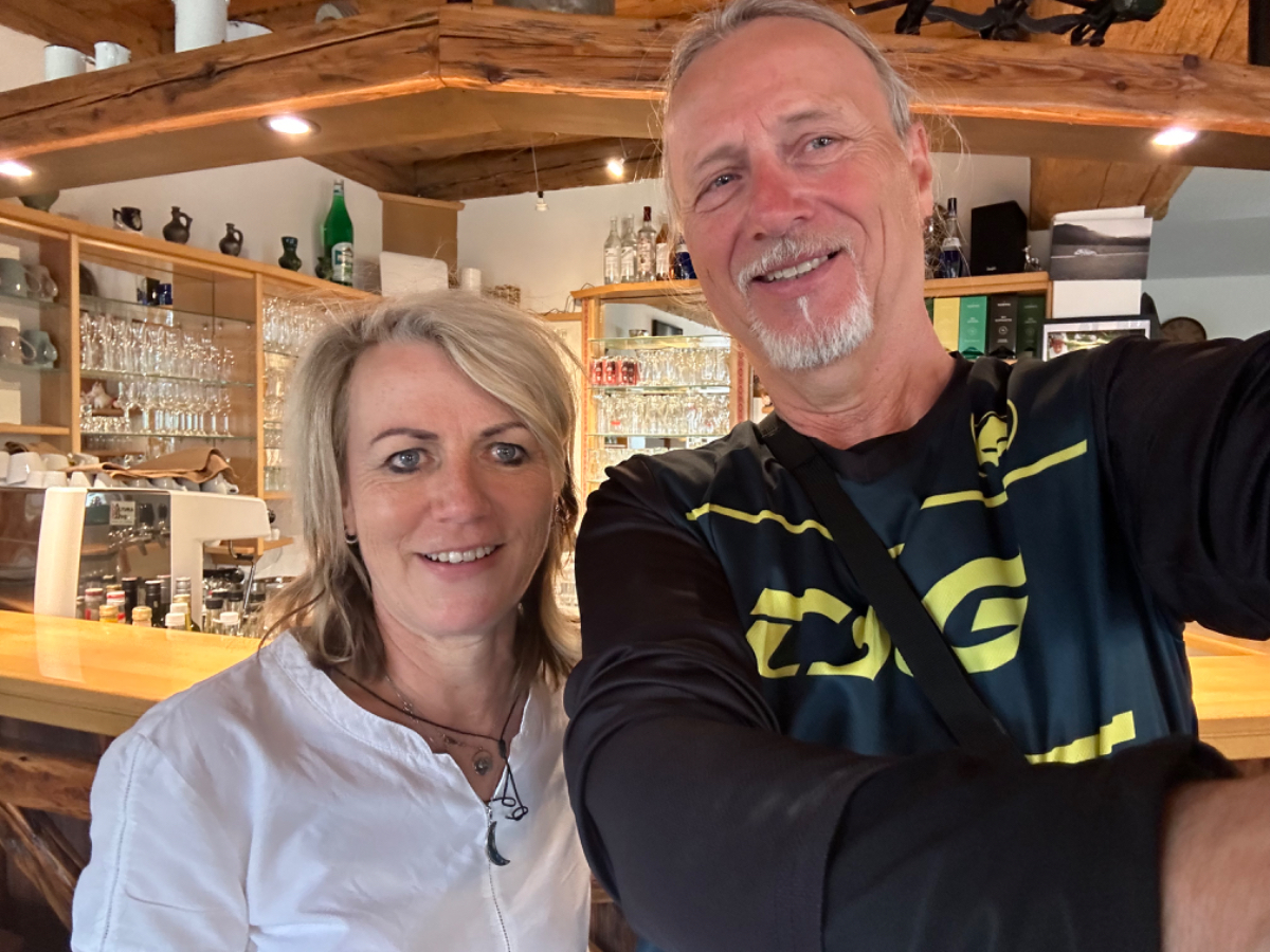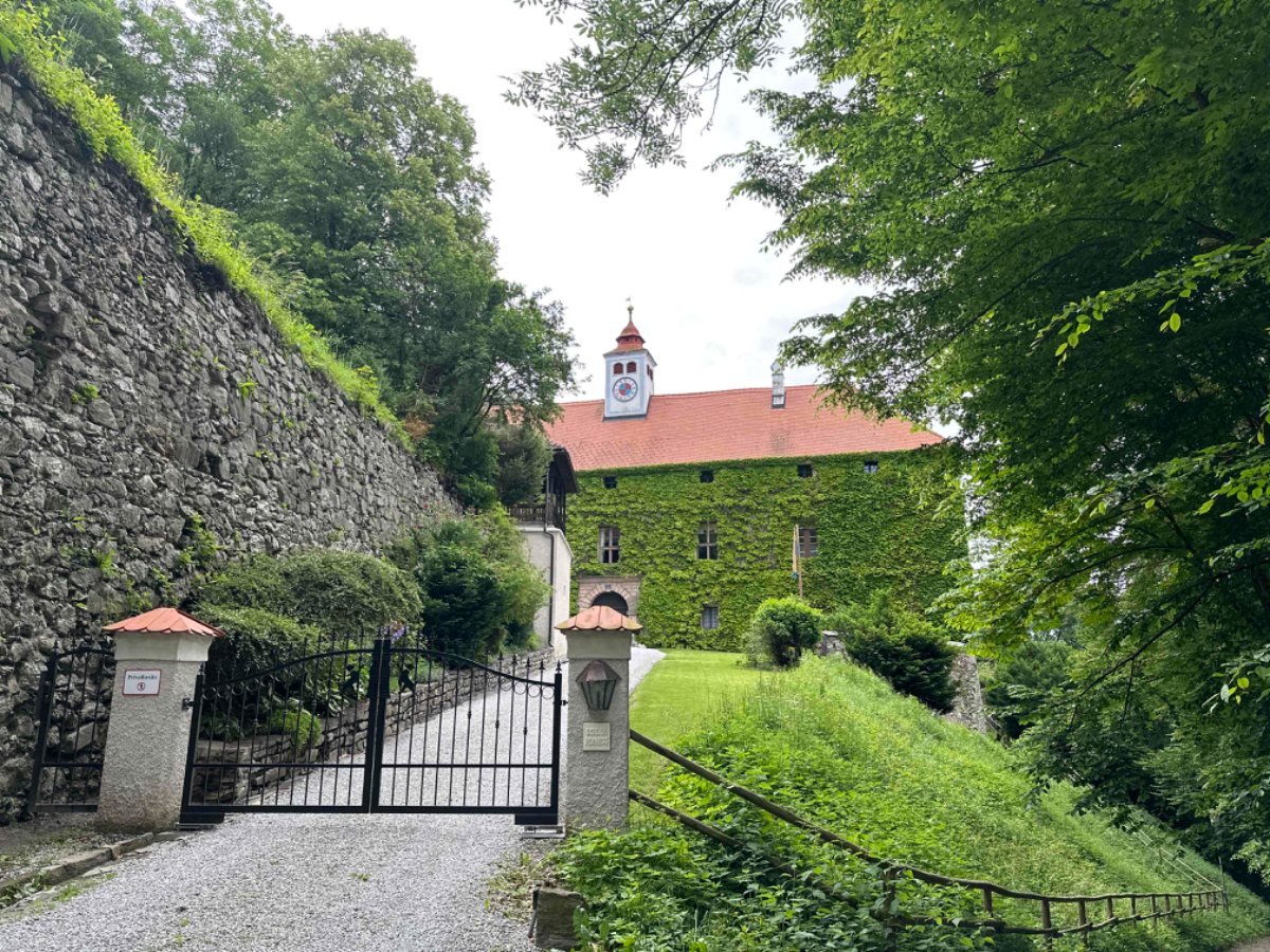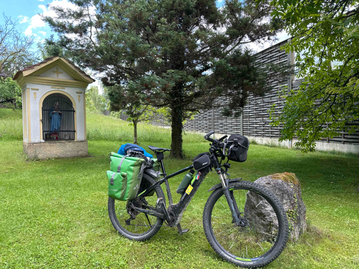 Die letzten 70km sind auch eher von der wenig beschwerlichen Art, einige wenige Steigungen, sonst eher flach dahin, gemütliches homecoming, wenn das Wetter hält. Nach Bruck geht es meist entlang der Bahnstrecke dahin, mal rauf, dann wieder runter, und schon bald ist Pernegg erreicht. Aus der Ferne sehe ich über der altbekannten Marienkirche versteckt im Wald ein Gebäude, es könnte ein Kloster sein denke ich mir. Um es herauszufinden fahre ich hinter der Kirche einen steilen Gehweg hinauf, und stehe vor den Toren von Schloß Pernegg, welches in Privatbesitz ist. Sieht sehr gepflegt aus, ein Zutritt ist nicht möglich. Wieder unten bei der Kirche statte ich dieser einen Besuch ab und entzünde eine Dankeskerze für die so gut verlaufene Reise, nicht weil ich so gläubig bin, sondern ganz einfach weil ich dankbar bin. Vor der Kirche befindet sich die Dorfstub´n Pernegg von Martina Ziesler. Hier war meine erste Einkehr bei der Hinfahrt und hier kehre ich auch heute ein. Letztes mal bei Sonnenschein im Gastgarten, heute drinnen in der gemütlichen Stube. Martina kann sich an meinen ersten Besuch erinnern und wir kommen ins Gespräch, eine sehr schöne und interessante Unterhaltung, wir haben einige Übereinstimmung die Reisen zu Fuß bzw. per Rad betreffend. Ich wäre gerne länger geblieben, aber wer weiß, vielleicht passt es ja wieder einmal. Vielen Dank Martina für die Einladung :-)