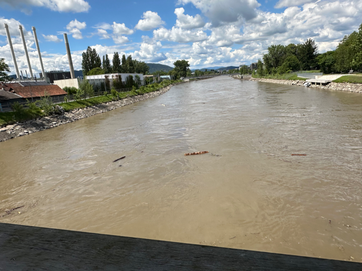 Bis Frohnleiten sind noch einige Spuren der starken Regenfälle der vergangenen Tage zu sehen, ich bin froh nicht vor zwei Tagen hier durchgefahren zu sein. Der Wettergott hatte dankenswerterweise über die gesamte Reise hinweg das schlechte Wetter von mir ferngehalten. In Frohnleiten wollte ich einem Schulfreund kurz Hallo sagen, er betreibt ein Lokal dort. Besser gesagt, betrieb er es, er ist schon wieder weiter gezogen und eröffnet im Juni ein neues Lokal. Entlang der Badlwand Galerie bis hinein nach Peggau muss ich auf die vielbefahrene Landesstraße mit reichlich Schwerverkehr, nicht schön! Viel schöner wird es dann auch bis Graz nicht mehr, bei Gegenwind immer entlang der B67, es ist einfach nur laut. In Peggau gönne ich mir einen letzten Besuch beim Billa, und ja, natürlich hole ich mir eine Leberkässemmel, ein ritueller Abschluß, quasi ;-)