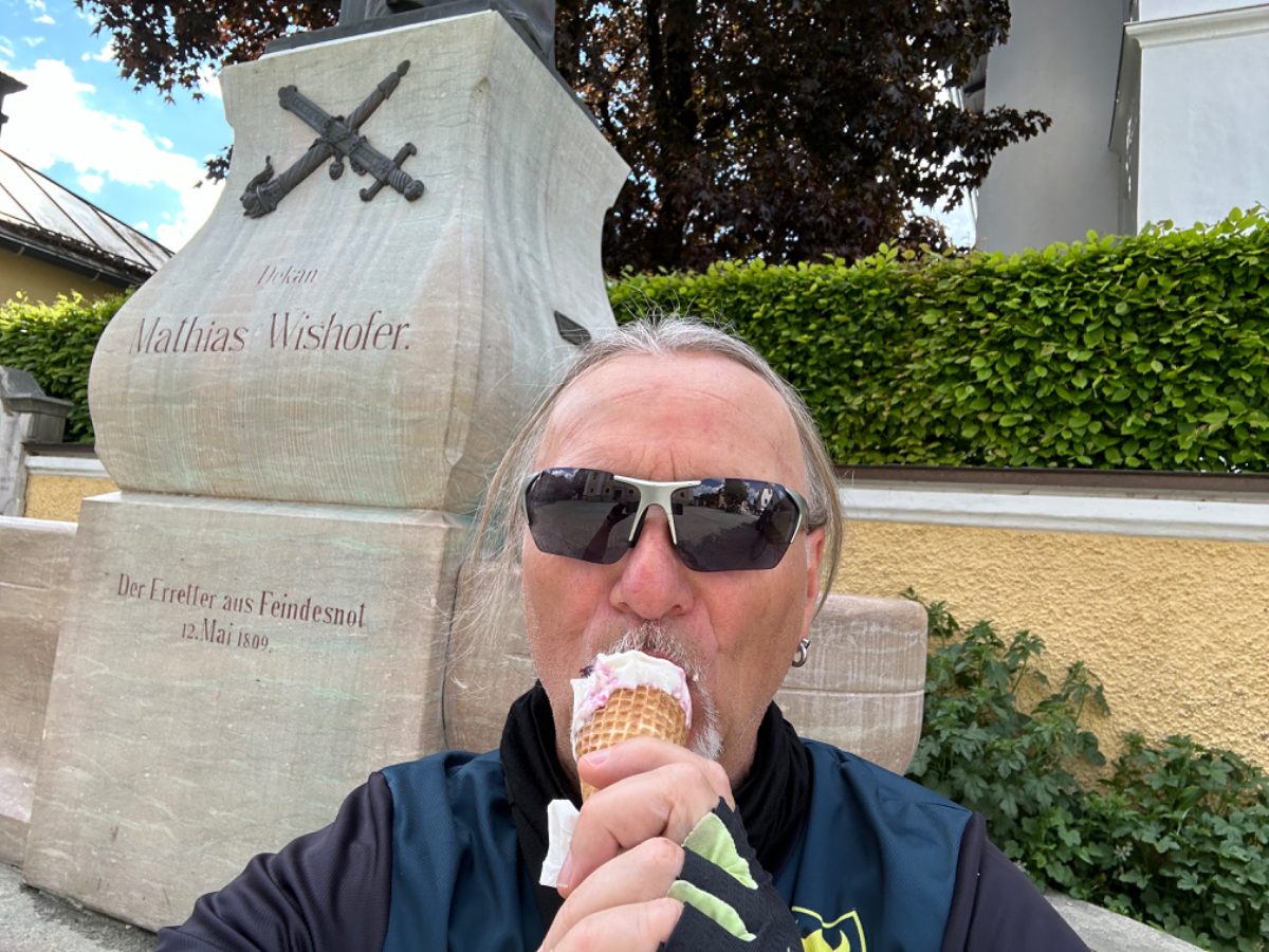 Ein neuer Tag, ein neues Abenteuer:-) Ich hatte mir vorgenommen, mir mehrere Ortsnamen, die an meinem Weg liegen zu merken. Aber aussichtslos, ich bin schon zufrieden wenn ich mir ein paar Highlights merke ;-) Und deren gab es heute viele! Ich muss meine Aussage über den schönsten Tourabschnitt revidieren, Tag 3 Ennstal war super schön, aber heute Tag 5 war eine absolute Steigerung! Beispielsweise Zell am See (und natürlich auch die Fahrt bis dorthin) war eines der Highlights. Über schöne Radwege, verkehrsarme Nebenstraßen erreiche ich nach 20 Kilometer Sellamse. Scheich habe ich in dieser schönen Stadt am See keinen gesehen, aber im Bereich rund um das Grandhotel und Casino etliche, die heute als solche durchgehen ;-) Aber sie lassen sich nicht gerne fotografieren. Entlang des Sees ist die Luft sehr kühl, obwohl bei fast wolkenlosen Himmel die Sonne scheint. Bei der Weiterfahrt ziehe ich mein Gilet verkehrt herum an, damit mir durch den Fahrtwind nicht zu kalt wird, und am Rücken der Schweiß verdunsten kann. So der Plan, aber ganz funktioniert es doch nicht, ich hoffe darauf, dass es bald wärmer wird. Wird es dann auch, als ich gegen Mittag Saalfelden am steinernen Meer erreiche. Die Landschaft bis hierhin war beeindruckend, rundum türmen sich hohe, schneebedeckte Berge auf, schön anzusehen, wenn ich nicht hinauf muss ;-) Entlang einer laaangen Allee radle ich nach Salfelden hinein. Auf der Suche nach einer Möglichkeit, meinen Akku aufzuladen, verliere ich einige Zeit, bin aber nicht erfolgreich. Im Tourismusbüro verweist man mich nach Leogang. Auf gehts nach Leogang. In einer app für ebiker finden sich öffentliche Lademöglichkeiten, alle Angaben für Saalfelden waren allerdings Nieten. In Leogang am Gemeindeamt soll es eine Möglichkeit geben. Gibt es natürlich nicht, aber der Bedienstete gibt mir den entscheidenden Tipp, beim Sport und Freizeitzentrum, das idealerweise an meiner Route liegt, dort haut es hin. Ich lerne dort Dirk kennen, den Betreiber des Restaurant Birnhorn, ein unheimlich netter Typ, bei dem ich fast zwei Stunden verbringe, während der Akku lädt. Dirk ist vor sechs Jahren mit Frau und Kind von Deutschland nach Leogang gezogen um zu bleiben. Leogang ist Sport Hotspot, Sommer wie Winter. Im Winter ein beliebtes Schigebiet, und danach bis zum nächsten Winter fallen die Downhill Biker dort ein, somit ist das ganze Jahr Saison. Wir verabschieden uns, ich muss weiter, vor mir liegen noch etliche Höhenmeter, der höchste Punkt auf 1000 Meter. Es ist jetzt 14 Uhr und die Sonne brennt vom Himmel, auf meiner linken Wade habe ich bereits einen Sonnenbrand. Dass ich Tirol erreicht habe zeigt sich an den Kfz Kennzeichen, aber auch an den Bauernhöfen und Häusern die an meinem Weg liegen. Und an den noch mehr und noch höheren Bergen ringsum. Selbst mir, der es nicht so mit den Bergen hat, entfährt so manches wow, so schön und mächtig sind sie anzusehen. Wie würde es da erst Riki gefallen hier zu radeln, die ja diese Panoramen und die Berge überhaupt liebt. Diese Leidenschaft teilen wir leider gar nicht. Ja, aber sie ist nicht hier, drückt lieber die Schulbank ;-)) Über wunderbare Radwege und teilweise auch Schotterpisten geht es immer weiter hinauf, auf Almen, mit freilaufenden Kühen die meinen Weg kreuzen. Ich glaube, ohne Nachladung des Akkus wäre es sich heute nicht ausgegangen, so steil sind manche Anstiege, dass ich die höchste Unterstützungsstufe verwenden muß. Aber es geht auch wieder hinunter, durch grosse bäuerliche Anwesen hindurch, hinunter, aber auch wieder hinauf. Über der ganzen Gegend liegt ein Geruch nach Kuhdung. Arg, als plötzlich mitten auf der Alm ein riesiger Industrieschornstein auftaucht. Es ist ein Magnesitwerk hier heroben. Die Reihenfolge des geschilderten wird eventuell nicht ganz stimmen, es waren einfach zuviele Eindrücke! Um 16 Uhr nach knapp 80 km erreiche ich St.Johann, wieder eine nette Stadt. Bei einem Italiener genehmige ich mir ein Eis, das ich auf leeren Magen gar nicht gut vertragen habe, ich hab jetzt noch Bauchschmerzen :-( Heute schlafe ich in einem von Rainer Schönfelders Hotels, dem Cooee Hotel, ein tolles Haus. Ich habe Halbpension gebucht, wusste ich gar nicht, habe ich erst gestern auf meiner Buchung gesehen. Also mal ein Tag ohne Billa :-)