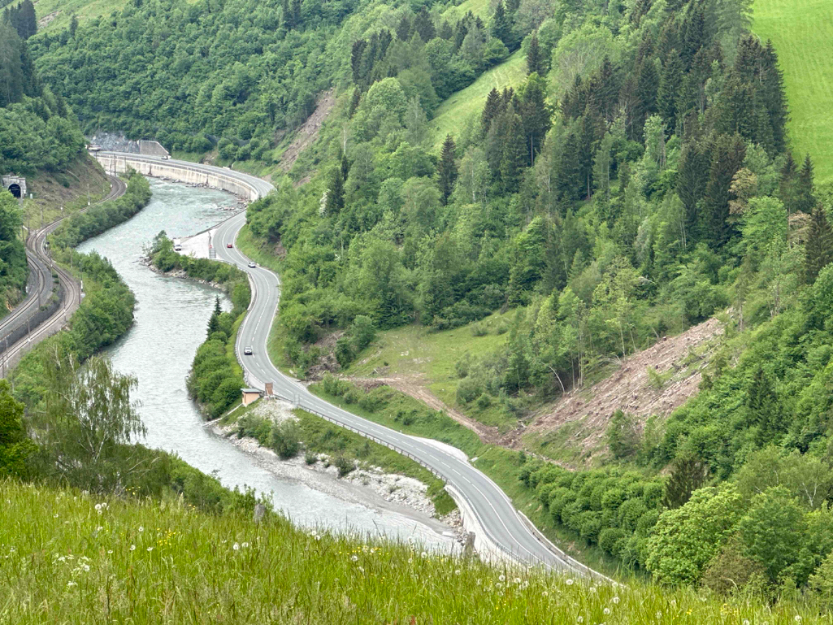 Matratze ultraweich, Rückenschmerzen dennoch erträglich, Frühstück na ja, geht so aber eh ok, kurzum Schladming abgeschlossen. Und dennoch, der Tourabschnitt gestern von Selzthal nach Schladming wird schwer zu toppen sein, es hat so vieles gepasst und hat mir großen Spaß gebracht. Heute geht’s bei wolkenverhangenem Himmel schon um 8:30 los, erstes Ziel Radstadt. Schöne Wege, durch Wald und Wiesen, im Wald doch so kalt, dass ich stehenbleibe um eine langärmelige Jacke anzuziehen. Als ich weiterfuhr, durchzuckte mich plötzlich ein Gedanke, habe ich wohl das verschwitzte Gilet wieder eingepackt. Stehenbleiben, nachsehen, alles da. Aber da erst bemerke ich, dass ich beim Jackenwechsel vergessen habe, meine Gürteltasche wieder umzuhängen, und die liegt ungesichert und unbefestigt hinten am Rad. Glück gehabt, dass ich auf meine innere Stimme gehört habe, Danke Unterbewusstsein! Wäre denkbar schlecht gewesen, bei Verlust der Tasche wäre ich ohne Geld, Karten etc. ziemlich blöd dagestanden. Ich erreiche Altenmarkt und fahre am Atomic Betriebsgelände vorbei, eine erstaunlich große Anlage „nur“ um Schi zu produzieren. Auf einigen Bergspitzen rundum liegt noch Schnee, es regnet zwar nicht, aber warm ist anders. Es geht ständig bergauf, ich schwitze in meinen drei Lagen, aber ohne wäre es einfach zu kalt heute. Endlich oben angekommen, beginnt eine rasante Talfahrt hinunter nach Wagrain. Es ist wieder ein Billa, der mich magisch anzieht, obwohl ich dieses Geschäft eigentlich nicht mag. Aber auf dieser Tour lande ich täglich bei einem. Ich hole mir Wasser und eine Käsesemmel und Bananen. Es kommt sogar die Sonne kurz durch die Wolkendecke, die mich bei meiner Jause vorm Billa wärmt. Mich fröstelt, ich bin total durchgeschwitzt und ziehe die nasse Jacke aus. Das Shirt trocknet in der Sonne am Körper, sehr angenehm :-) Jetzt erweist es sich als Glücksfall, dass ich mehrere Jacken eingepackt habe, so habe ich noch eine trockene für die Weiterfahrt. Die brauche ich dann auch, es geht über eine wenig befahrene, kurvenreiche Straße einige Kilometer bis hinunter nach Sankt Johann im Pongau, dort wird es endlich wärmer. Nun folge ich für einige Zeit dem Tauern Radweg entlang der Salzach bis Schwarzach. Endlich für ein paar Kilometer gemütlich radeln, gefällt mir :-) Aber es bleibt nicht so, der Weg führt zum Teil sehr steil immer höher hinauf, weit unten an den steilen Hängen fließt die Salzach. Wer wohnt freiwillig hier heroben und bewirtschaftet die steilen Leiten, von der mühsamen Zu-und Abfahrt überkommt mich - als nur bedingt höhenfest bekannt - schon im Sommer das Grauen, wie ist‘s dann erst im Winter? Weiter oben erreiche ich einen großen leeren Speichersee. Laut einer Spaziergängerin ist er nur im Herbst voll. Er gehört zu einem Kraftwerk in Schwarzach. Bevor es runter geht, nochmals hinauf, ich mach mir langsam Sorgen, ob mein Akku heute durchhält. Bei normaler Belastung und nur geringen Steigungen reicht die Vollladung für gerade mal 85km. Bei vielen Höhenmetern bin ich froh, wenn ich 70km schaffe. Und um die 70 werden es heute auch werden. Als es endlich bergab geht, muss ich an einer Kreuzung eine Entscheidung treffen, folge ich dem Tauernradweg, oder folge ich meiner Navi Route. Ich entscheide mich fürs Navi, und hoffe dass es kein Fehler war, denn nochmals zurück nach oben ist mit dem Akku keine Option. Es geht eine steile Rampe hinunter, ein handgeschriebenes Schild weist darauf hin, dass für Fahrräder die Durchfahrt nach Schwarzach nicht möglich ist. Gilt nicht für mich, denke ich, ich komme ja aus dieser Richtung, also weiter. Das Gefälle hat sicher 20%, hinauf ist definitiv ausgeschlossen. Unten an der Landesstrasse entlang der Salzach angekommen, bin ich das einzige Fahrzeug. Kurz vor Lind weiß ich auch warum, die Straße ist wegen einer Großbaustelle gesperrt, aber mit dem Rad komme ich glücklicherweise durch, obwohl mich die Arbeiter sehr sparsam mustern und meinen Gruß nicht erwidern. Ich fahre noch einige Zeit allein dahin, hin und wieder kommt ein Baustellen LKW daher. Als ich die Bundesstraße erreiche, gibt es auch wieder einen Radweg neben der Straße. Durch den Tunnel der vor mir auftaucht, muss ich zum Glück nicht durch, die alte Straße führt außen herum. Und dann ist nach 73km endlich Taxenbach erreicht. Mein Quartier nennt sich Sportpension Sonnhof, und ist kurz gesagt, schon seeehr in die Jahre gekommen. Den Inhaber, der gebrochen deutsch spricht, musste ich im Keller suchen, um den Zimmerschlüssel zu bekommen. Die Tür ist ein optischer, aber kein akustischer Verschluss, genauso wie die Tür zum Balkon, der direkt auf die vielbefahrene Bundesstraße hinaus geht. Von den hellhörigen Wänden gar nicht zu sprechen. An und für sich bin ich beim schlafen nicht sehr lärmempfindlich, mal sehen ob‘s stimmt ;-) Zu essen gibt es hier natürlich nichts, und auch in Taxenbach City habe ich nichts gefunden. Also was bleibt? Genau, mein Billa, den es hier natürlich auch gibt. Ich shoppe ein kleines Bier, einen großen Salat und zwei Läberkässemmeln. Am lauschigen Balkon mit reichlich Straßenlärm lasse ich es mir trotzdem gut schmecken :-) Mittlerweile hat es zu regnen begonnen, aber die Prognose für morgen „Not so bad“