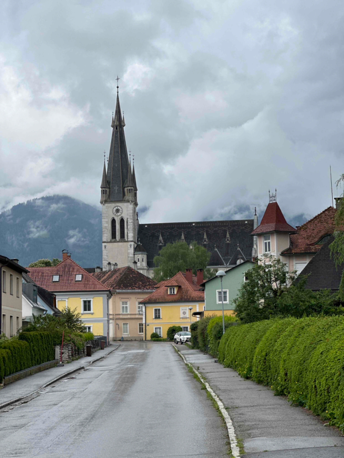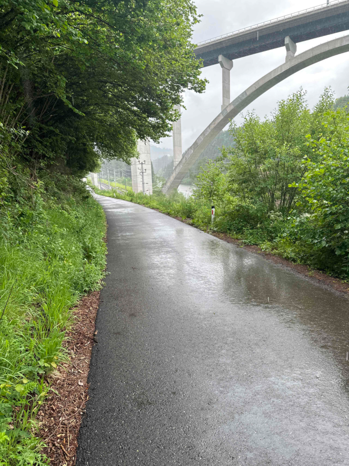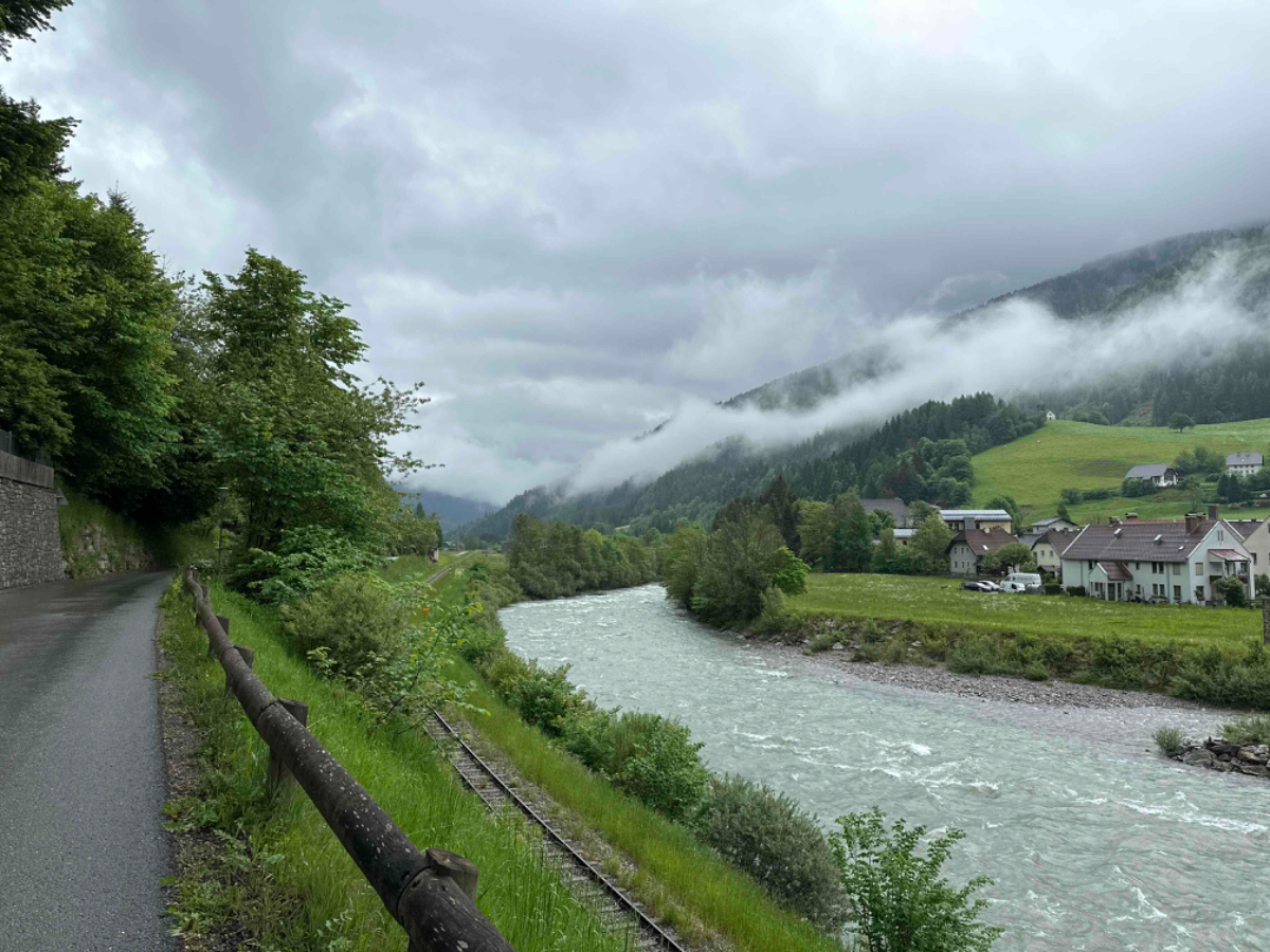 Der gestrige Ritt über den Tauern hat mich wie es scheint mehr geschlaucht als angenommen, denn ich habe fast zehn Stunden geschlafen wie ein Stein. Die überaus netten Wirtsleute beim Postwirt kredenzen mir ein feines Frühstück, das ich aber sehr kurz halte. Ich hege die Hoffnung, wenn ich früher losfahre, erwischt mich der angekündigte Regen erst später. Um viertel nach acht sitze ich heute bereits am Rad, es ist kühl aber momentan trocken. Doch schon nach zwei Kilometer ist es für heute vorbei mit trocken :-( Also Regenhose überziehen, in der Kurzen war es eh viel zu kalt, Regenjacke mit Kapuze und weiter gehts. Der Weg wäre eigentlich schön zu radeln, aber bei diesem Wetter hält sich der Genuss eher in Grenzen. An einigen Stellen erinnere ich mich an unsere erste Radtour, zu der mich Riki „überredet“ hatte mit dem Argument, der Murradweg folgt dem Fluß und somit geht es immer bergab. Hätte ich nämlich gewusst dass dem nicht so ist, wäre ich wahrscheinlich erst gar nicht mitgefahren, was natürlich sehr schade gewesen wäre! Allerdings bin ich seither bei Rikis Angaben zu Entfernungen, Steigungen, Höhen etc. grundsätzlich skeptisch ;-) Heute, mehr als zehn Jahre später, unterwegs mit dem e-bike kann ich vielerorts meinen Frust von damals nachvollziehen, ich war auch mit einem für mich viel zu kleinen Rad unterwegs, Anfängerfehler halt :-)