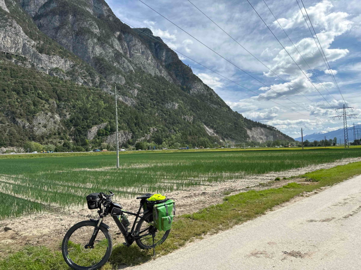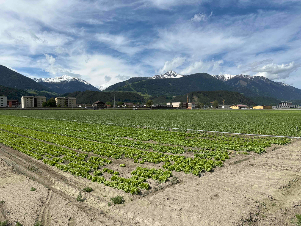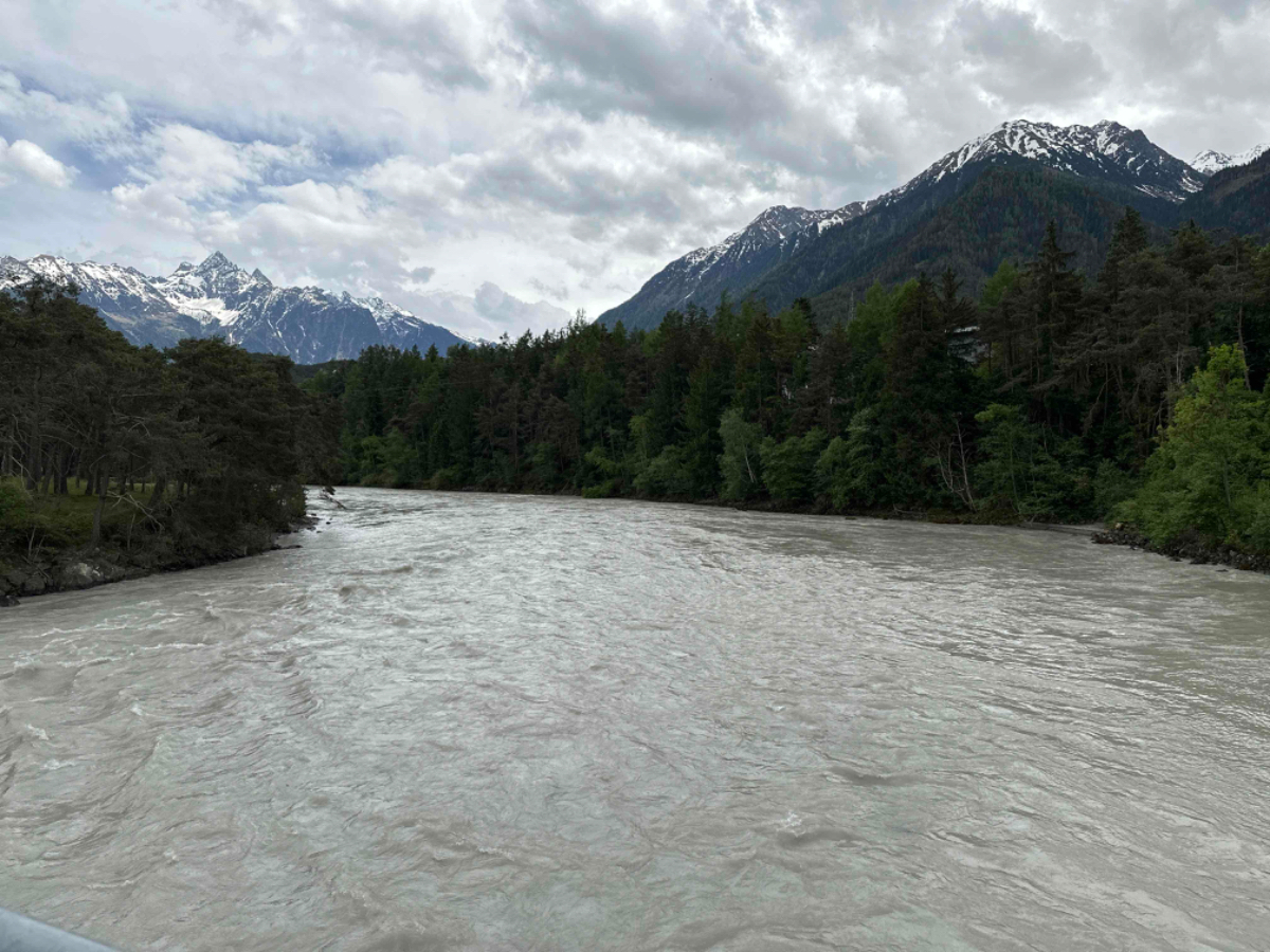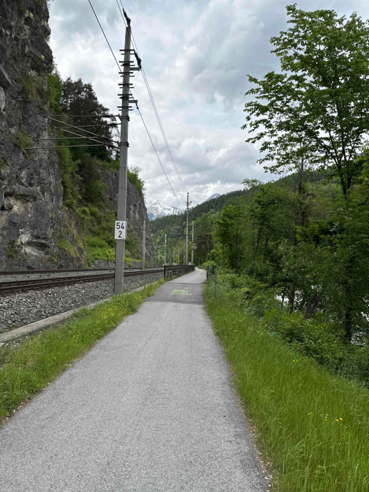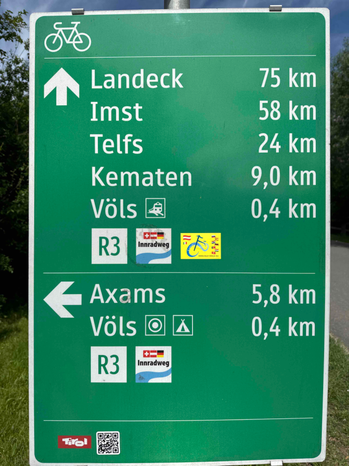 Schon Tag sieben, heute bin ich eine Woche unterwegs. Dieses tägliche Blogschreiben lässt mich den Tag nochmals revue passieren, ohne dieses tägliche Schreiben würde vieles gleich wieder in der ewigen Vergessenheit versinken, ich kann mich doch schon heute nicht mehr erinnern, wo genau ich vorgestern war, aber ich kann’s ja nachlesen ;-) Der Wetterbericht für heute hat gestern am Abend nichts Gutes verlauten lassen, umso überraschter war ich heute früh, dass es leidlich schön zu sein schien, als ich den Vorhang zurück zog. Das Frühstück wurde dem Rest des Hauses durchaus gerecht, es war alles da. Mancher würde vielleicht sagen, besser geht immer, aber es wäre die pure Verschwendung gewesen. Mein Rad trage ich die enge Treppe wieder hinunter, fürs Gepäck nehme ich den Lift. Um neun radle ich aus Wattens hinaus, es ist wolkig, aber mit Sonnenfenstern in meine Fahrtrichtung. Es liegen wieder über 80km vor mir, sollte aber kein Problem sein, laut Höhenprofil geht es die ersten 50km nur ganz moderat bergauf, dem Gefälle des Inn gegen die Flußrichtung folgend. So ist es dann auch, ich radle heute wirklich ganz gemütlich dahin, brauche kaum Unterstützung und es macht Spaß. Bald ist Innsbruck erreicht, über eine breite Promenade zwischen Inn und Bundesstraße radle ich in die Stadt hinein. Es ist zu früh für eine längere Pause und wer weiß wie sich das Wetter entwickelt, also beschließe ich, nach einigen Fotos bald weiter zu fahren. Der Innradweg führt wie der Name vermuten lässt, meist entlang des Inn dahin, Fast immer auf Radwegen, aber manchmal auch weg vom Wasser durch die Dörfer. Die Beschilderung des Radweges ist wirklich vorbildlich gemacht, habe ich anderswo schon ganz anders erlebt. Heute gibt es wieder mal eine Baustelle mit einer größeren Umleitung. Zuerst gibts auch wieder eine Beschilderung der Umleitungsstrecke, aber irgendwann ists dann vorbei damit, und ich folge mehr meiner Intuition. Ich befinde mich in der weiten Ebene des Inntals, verfahren kann ich mich eh nicht, das Tal ist ja links und rechts mit hohen Bergen begrenzt ;-) Das Inntal ist einziger großer Gemüsegarten, Feld an Feld, dazwischen Folientunnel, und überall läuft die Bewässerung auf Hochtouren, die Erde ist staubtrocken. Aber in den kommenden Tagen wird es sicher Regen geben, nur für mich hoffentlich heute noch nicht. Nach einigen km erreiche ich meine Route wieder und folge dem Navi. Seit ich in Tirol bin, liegt ein schwerer „Duft“ in der Luft, es riecht ständig nach Stall, aber auch kein Wunder, hier wird kräftigst gedüngt, teilweise steht die Gülle auf den Feldern. Bisher ist es der anspruchsloseste aber auch unspektakulärste Abschnitt der Gsiberg-Tour, aber es wird noch. An den letzten 20 km geht es doch wieder zum Teil schön zackig hinauf, aber in einer wunderschönen Umgebung, nach Roppen fahre ich durch einen Kiefernwald hinauf, hinunter, rauf und runter, und komme dann in ein enges Tal, das nur Platz für die Bahngleise, den Fluß und den Radweg lässt, mit Blick auf vor mir in der Ferne aufragende Berge. Am Ende erreiche ich Imst, mein heutiges Ziel. Um 15 Uhr checke ich ein, ein wunderschöner alter Gasthof / Hotel, ich habe das Chefzimmer bekommen, alles gut, auch das Bier und die Küche.