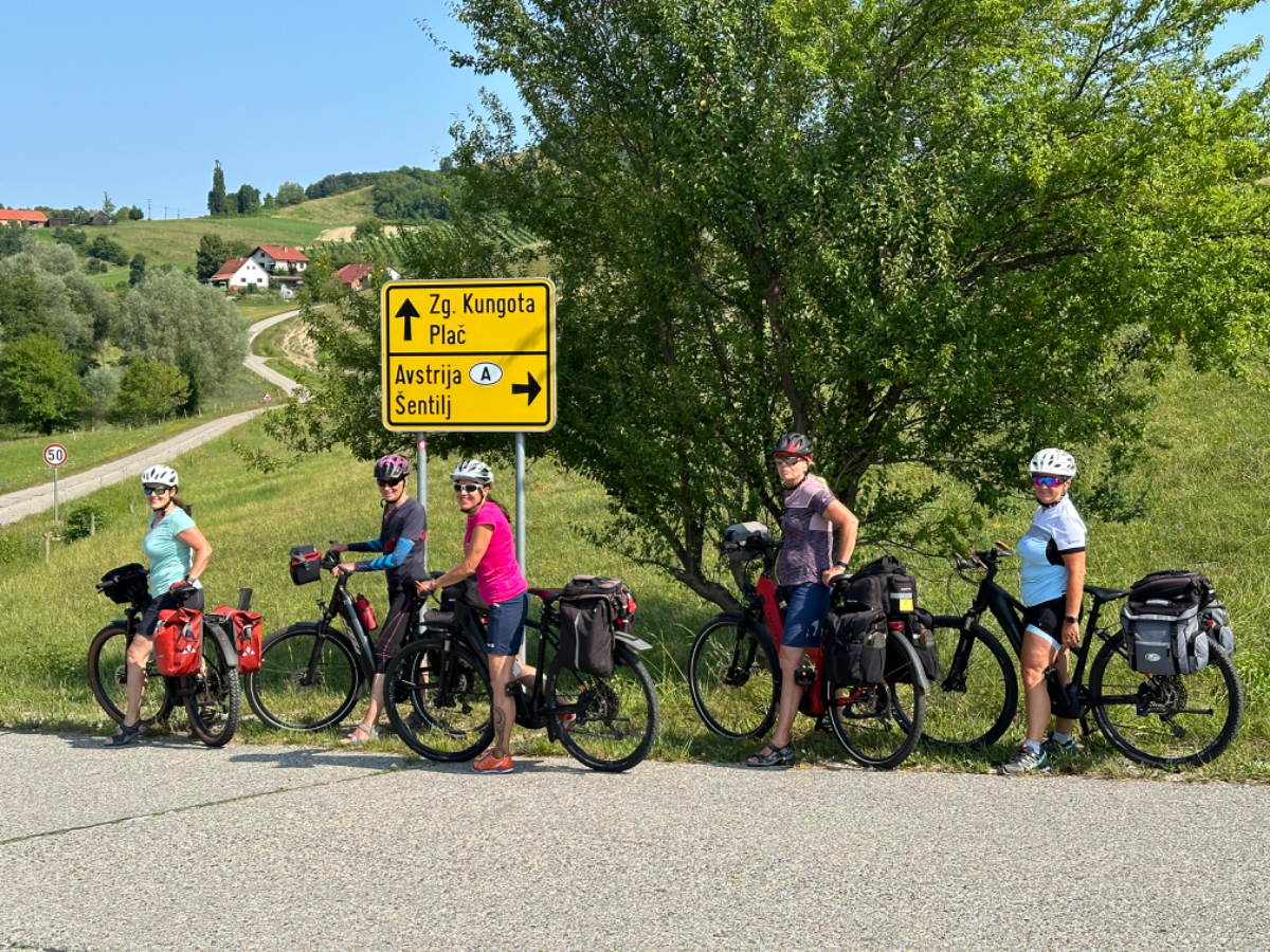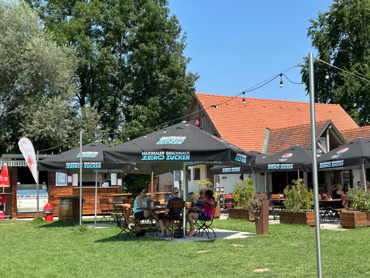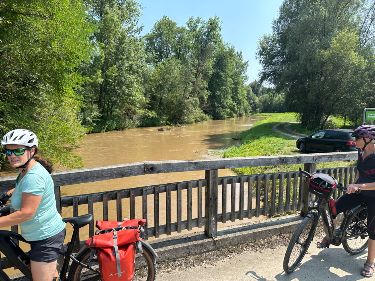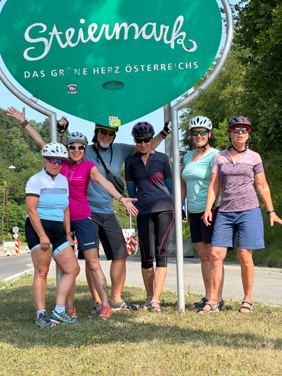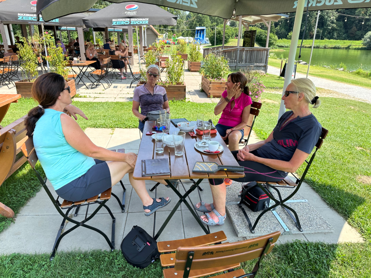 Das Stadtzentrum von Marburg macht Lust auf mehr als nur einen Nachmittag, und ich habe mir auch vorgenommen, mit Riki mal ein Wochenende in Ptuj und Marburg zu verbringen. Aber heute geht es erstmal heim nach Graz, Krumegg und St.Martin. Mit unserem Hotel haben wir echt Glück gehabt, die Lage perfekt im Zentrum gelegen, Zimmer ok ( vor allem die Matratze ;-) und zum Abschluss ein Frühstück, das keinen Wunsch offen lässt. An der Rezeption erfahren wir dann den Grund für die auffallend starke Polizeipräsenz am gestrigen Nachmittag und Abend. Es fand ein Fußballspiel zwischen der Bulgarischen Nationalmannschaft und dem Marburger Stadtclub statt. Offenbar ein Risikospiel. Beim Abendessen hörten wir Fangruppen lautstark ihre Parolen rufend durch die Stadt ziehen, aber in unserem Hotel waren wenige Fans abgestiegen, es war eine ruhige Nacht :-) Dank Navi finden wir über gute Radwege problemlos aus Marburg hinaus. Dann gehts einige Zeit über mehr oder weniger befahrene Straßen über hügeliges Gelände Richtung Österreich. Nach den vorherigen drei Tagen mit massiv schweißtreibenden Temperaturen, scheint auch der heutige Tag keine Ausnahme zu werden. Bald ist die Grenze erreicht, vor dem Steiermarkherz machen wir ein Gruppenfoto, schön wieder da zu sein! Die restliche Strecke bis Graz verläuft auf dem Murradweg R2. Die Mur hat auffallend viel Wasser, eine braune Brühe wälzt sich durch das breite Flussbett. Renate erzählt, es hat letzte Nacht in der Hochsteiermark wieder schwere Unwetter gegeben, das erklärt wohl den Wasserstand und die schlammige Farbe. Wir machen einige Trinkpausen, beim Wildoner Badesee, gönnen wir uns einen längeren Aufenthalt. Es ist eine sehr schöne Anlage mit weitläufigen Liegewiesen, der See hat klares Wasser. Erstaunlich, wie wenig dort trotz des prächtigen Badewetters los war. Wir fahren weiter, in Fernitz lade ich die Damen zum Abschluss der Tour auf ein Eis beim Purkarthofer ein, lecker, wie der Deutsche sagt ;-) Nach 80 km treffen wir um 16 Uhr in der HU ein und stoßen mit einem kühlen Bier auf unsere gelungene Tour an.