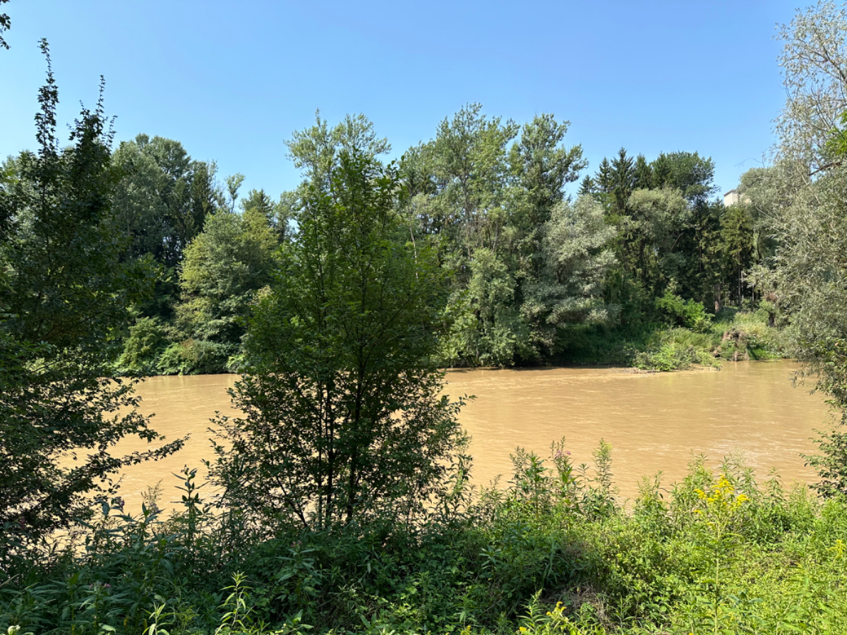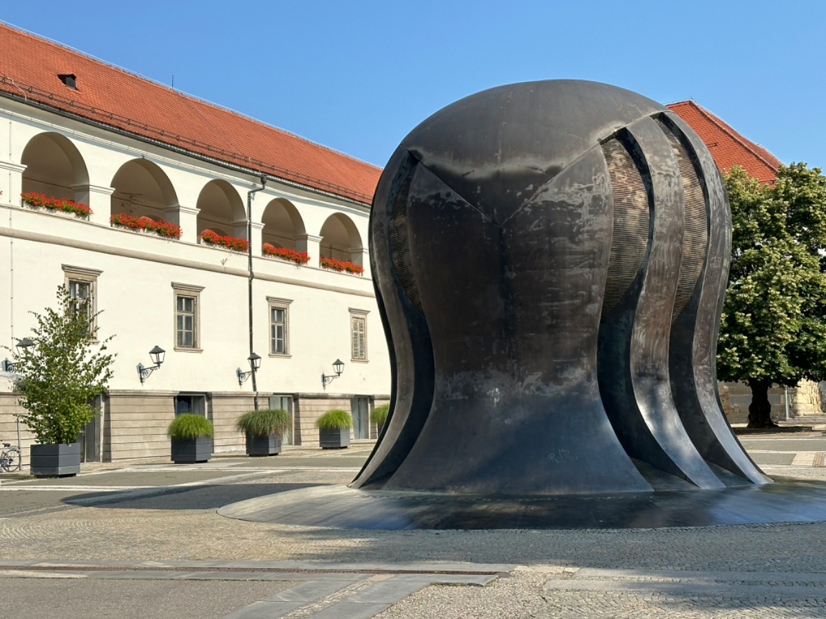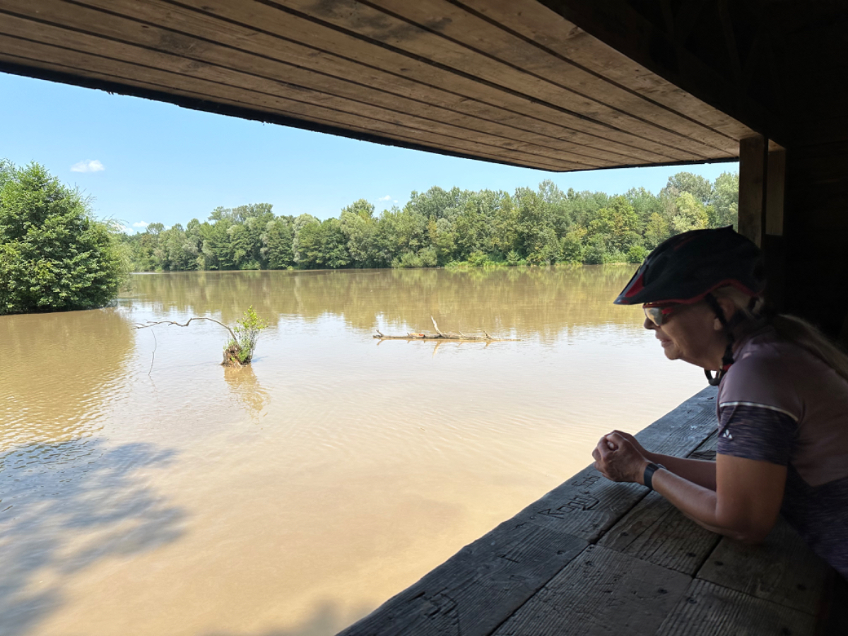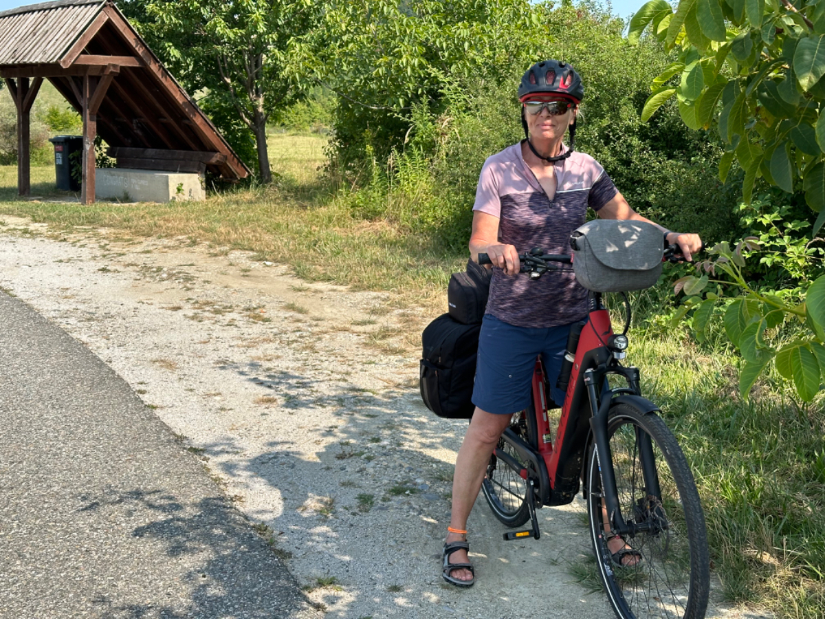 Das Stadtzentrum von Marburg macht Lust auf mehr als nur einen Nachmittag, und ich habe mir auch vorgenommen, mit Riki mal ein Wochenende in Ptuj und Marburg zu verbringen. Aber heute geht es erstmal heim nach Graz, Krumegg und St.Martin. Mit unserem Hotel haben wir echt Glück gehabt, die Lage perfekt im Zentrum gelegen, Zimmer ok ( vor allem die Matratze ;-) und zum Abschluss ein Frühstück, das keinen Wunsch offen lässt. An der Rezeption erfahren wir dann den Grund für die auffallend starke Polizeipräsenz am gestrigen Nachmittag und Abend. Es fand ein Fußballspiel zwischen der Bulgarischen Nationalmannschaft und dem Marburger Stadtclub statt. Offenbar ein Risikospiel. Beim Abendessen hörten wir Fangruppen lautstark ihre Parolen rufend durch die Stadt ziehen, aber in unserem Hotel waren wenige Fans abgestiegen, es war eine ruhige Nacht :-) Dank Navi finden wir über gute Radwege problemlos aus Marburg hinaus. Dann gehts einige Zeit über mehr oder weniger befahrene Straßen über hügeliges Gelände Richtung Österreich. Nach den vorherigen drei Tagen mit massiv schweißtreibenden Temperaturen, scheint auch der heutige Tag keine Ausnahme zu werden. Bald ist die Grenze erreicht, vor dem Steiermarkherz machen wir ein Gruppenfoto, schön wieder da zu sein! Die restliche Strecke bis Graz verläuft auf dem Murradweg R2. Die Mur hat auffallend viel Wasser, eine braune Brühe wälzt sich durch das breite Flussbett. Renate erzählt, es hat letzte Nacht in der Hochsteiermark wieder schwere Unwetter gegeben, das erklärt wohl den Wasserstand und die schlammige Farbe. Wir machen einige Trinkpausen, beim Wildoner Badesee, gönnen wir uns einen längeren Aufenthalt. Es ist eine sehr schöne Anlage mit weitläufigen Liegewiesen, der See hat klares Wasser. Erstaunlich, wie wenig dort trotz des prächtigen Badewetters los war. Wir fahren weiter, in Fernitz lade ich die Damen zum Abschluss der Tour auf ein Eis beim Purkarthofer ein, lecker, wie der Deutsche sagt ;-) Nach 80 km treffen wir um 16 Uhr in der HU ein und stoßen mit einem kühlen Bier auf unsere gelungene Tour an.