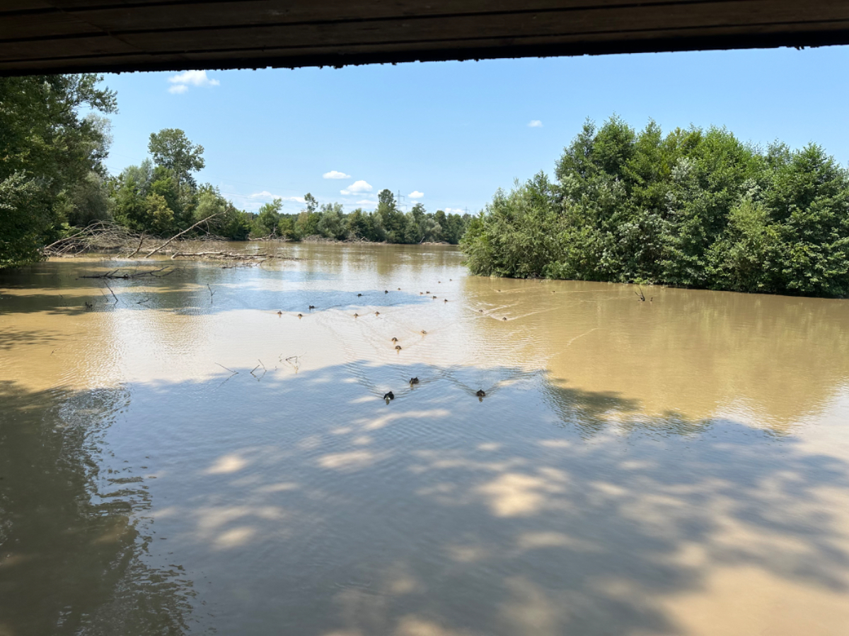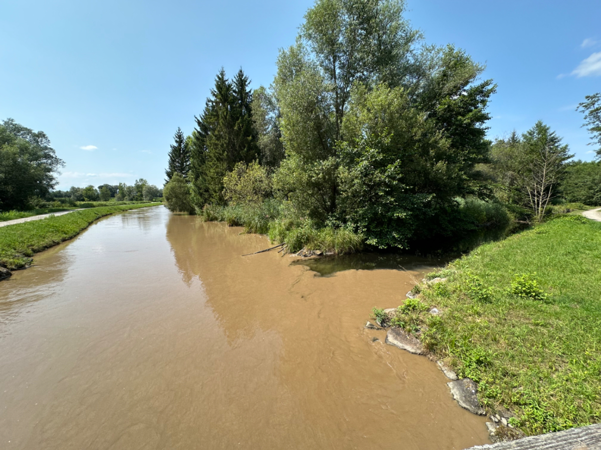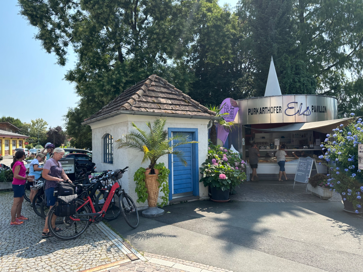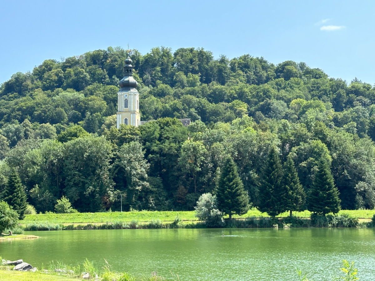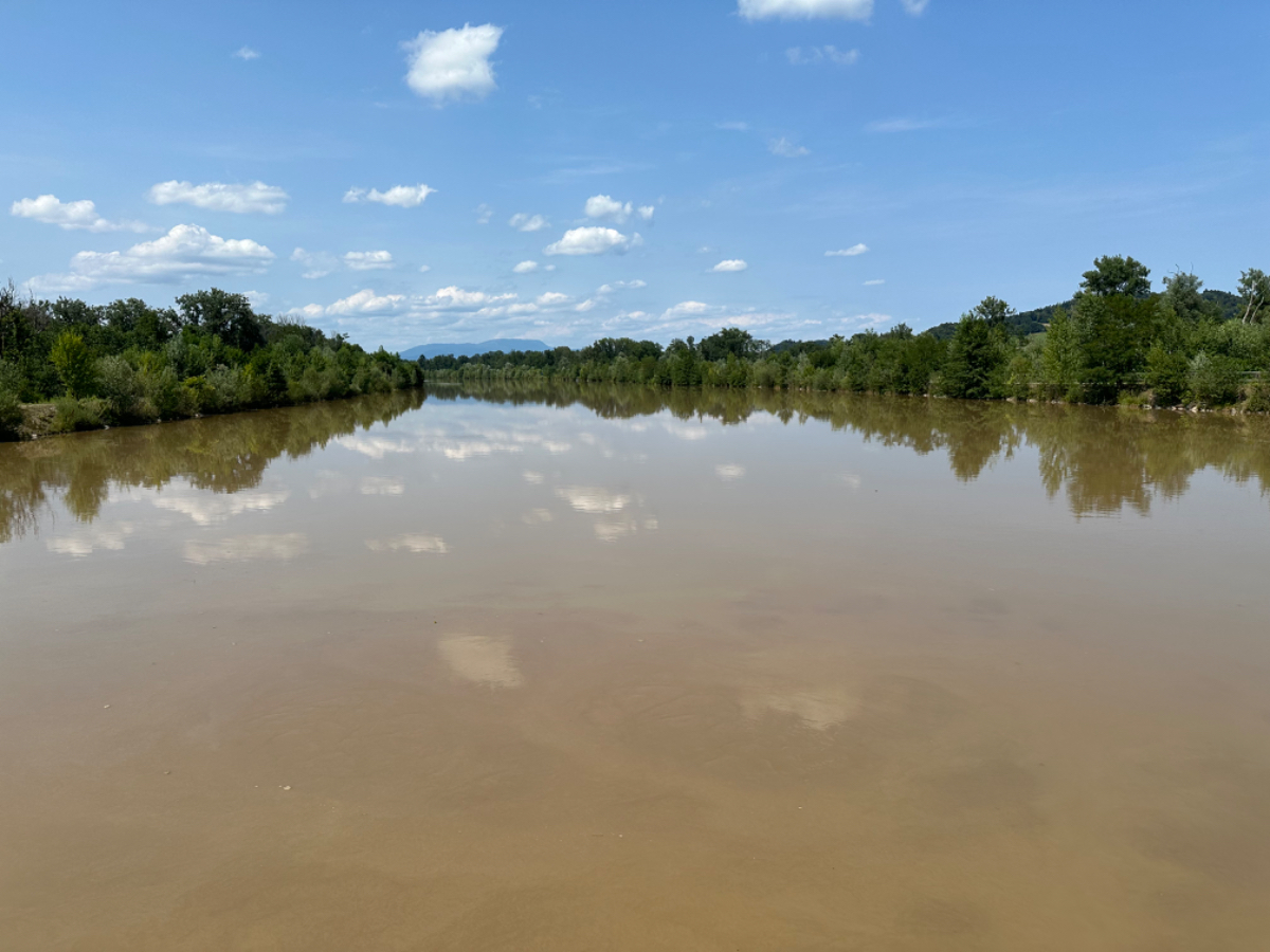 Das Stadtzentrum von Marburg macht Lust auf mehr als nur einen Nachmittag, und ich habe mir auch vorgenommen, mit Riki mal ein Wochenende in Ptuj und Marburg zu verbringen. Aber heute geht es erstmal heim nach Graz, Krumegg und St.Martin. Mit unserem Hotel haben wir echt Glück gehabt, die Lage perfekt im Zentrum gelegen, Zimmer ok ( vor allem die Matratze ;-) und zum Abschluss ein Frühstück, das keinen Wunsch offen lässt. An der Rezeption erfahren wir dann den Grund für die auffallend starke Polizeipräsenz am gestrigen Nachmittag und Abend. Es fand ein Fußballspiel zwischen der Bulgarischen Nationalmannschaft und dem Marburger Stadtclub statt. Offenbar ein Risikospiel. Beim Abendessen hörten wir Fangruppen lautstark ihre Parolen rufend durch die Stadt ziehen, aber in unserem Hotel waren wenige Fans abgestiegen, es war eine ruhige Nacht :-) Dank Navi finden wir über gute Radwege problemlos aus Marburg hinaus. Dann gehts einige Zeit über mehr oder weniger befahrene Straßen über hügeliges Gelände Richtung Österreich. Nach den vorherigen drei Tagen mit massiv schweißtreibenden Temperaturen, scheint auch der heutige Tag keine Ausnahme zu werden. Bald ist die Grenze erreicht, vor dem Steiermarkherz machen wir ein Gruppenfoto, schön wieder da zu sein! Die restliche Strecke bis Graz verläuft auf dem Murradweg R2. Die Mur hat auffallend viel Wasser, eine braune Brühe wälzt sich durch das breite Flussbett. Renate erzählt, es hat letzte Nacht in der Hochsteiermark wieder schwere Unwetter gegeben, das erklärt wohl den Wasserstand und die schlammige Farbe. Wir machen einige Trinkpausen, beim Wildoner Badesee, gönnen wir uns einen längeren Aufenthalt. Es ist eine sehr schöne Anlage mit weitläufigen Liegewiesen, der See hat klares Wasser. Erstaunlich, wie wenig dort trotz des prächtigen Badewetters los war. Wir fahren weiter, in Fernitz lade ich die Damen zum Abschluss der Tour auf ein Eis beim Purkarthofer ein, lecker, wie der Deutsche sagt ;-) Nach 80 km treffen wir um 16 Uhr in der HU ein und stoßen mit einem kühlen Bier auf unsere gelungene Tour an.
