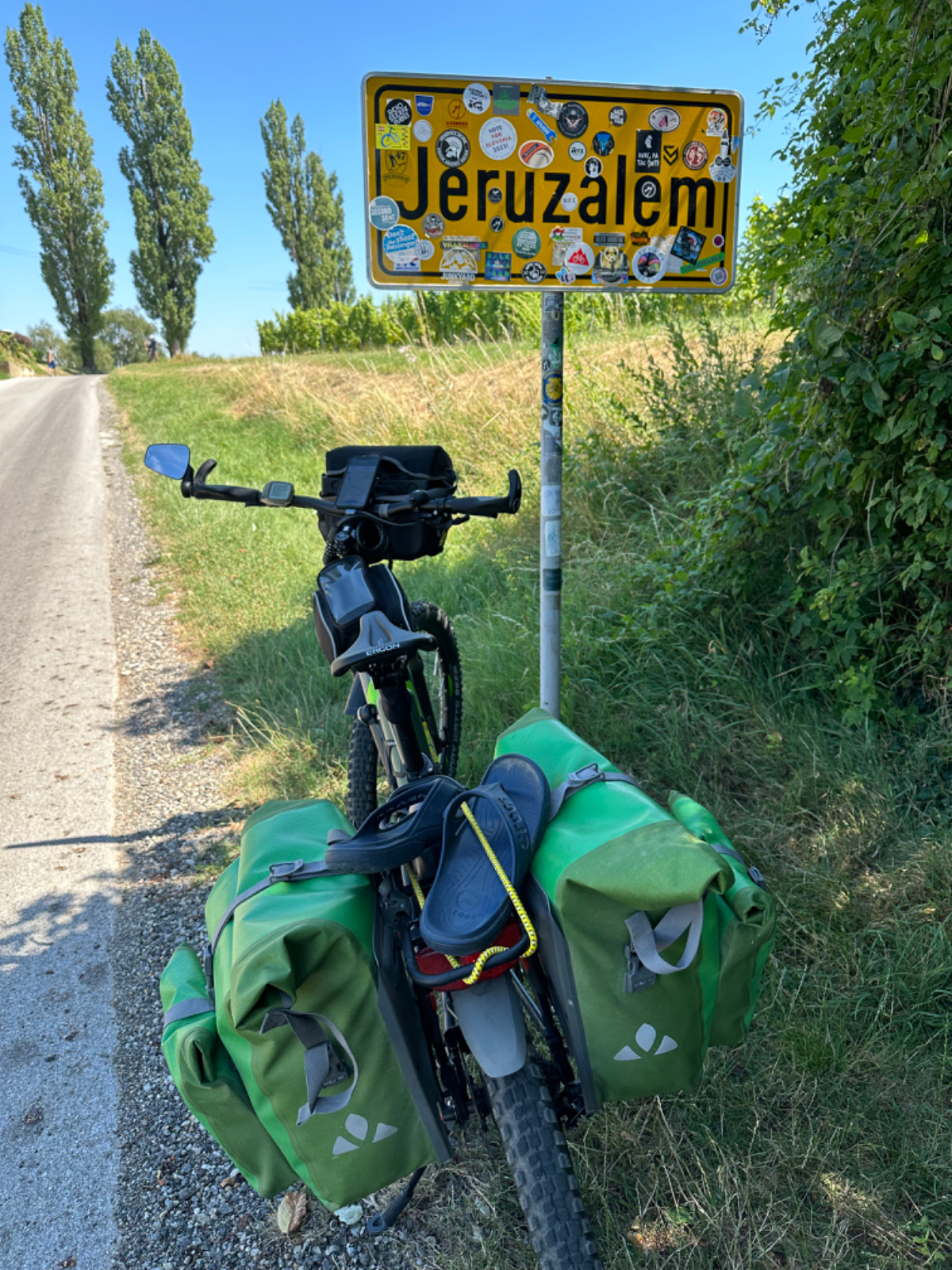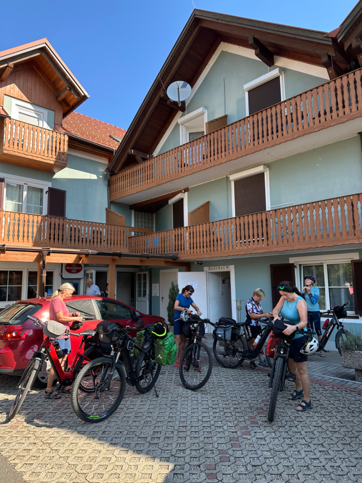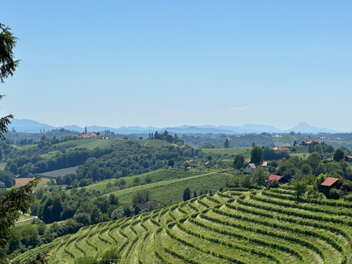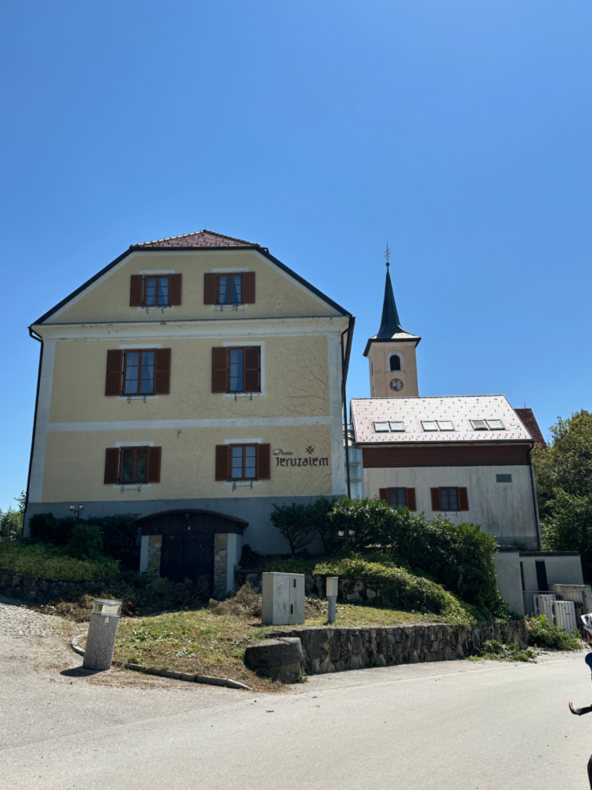 Über von typischer Vorstadtarchitektur gesäumten Straßen verlassen wir den Ort. Es erwarten uns einige Hügel, die Landschaft wird immer schöner, sehr ähnlich der Südsteirischen Weingegend, es ist wahrlich ein Genuss hier zu radeln, und auch die Temperatur ist noch einigermaßen angenehm. Nachdem wir erst um 9:30 losgefahren sind, wird uns die gross angekündigte Hitze heute aber sicher noch zu schaffen machen. Wir werden von einem Radfahrer mit Strassenrad in zügigem Tempo überholt. Beim nächsten Anstieg holen wir ihn aber wieder ein, überholen ihn aber nicht. Oben angekommen sehe ich erst, wie total verschwitzt der Mann nach diesem Anstieg ist, da haben wir mit unseren e bikes einen Vorteil, der speziell bei diesen Verhältnissen nicht hoch genug geschätzt werden kann :-) Als wir die Weinberge verlassen, liegen bis Ljutomer viele Kilometer flaches Land vor uns. Da wird die Hitze dann doch schon spürbar, die Sonne brennt vom wolkenlosen, blauen Himmel, und der schwarze Asphalt reflektiert die Sonne, quasi Ober -und Unterhitze. Ganz arg wird es wenn man zwischen Maisfeldern fährt, aber es wird nicht geklagt, es ist Sommer! In einem Dorf, dessen Namen ich schon nach der Ortstafel wieder vergessen habe, machen wir in einem schattigen Gastgarten eine Rast und laben uns mit Zitronenwasser mit Minze. Der freundliche Kellner möchte unsere Karin gerne näher kennenlernen, aber Karin lehnt dankend ab. Sie ist so verwirrt, dass sie als wir wieder aufbrechen, direkt vor ihrem Verehrer mit dem Rad einen Bauchfleck hinlegt, aber alles gut, nichts passiert, wir können später darüber scherzen ;-) Weiter gehts, es ist schon nach Mittag als wir Ljutomer erreichen. Die erste größere Stadt, erkennbar an den grösseren Geschäften am Stadtrand wie Lidl, Teddi etc. Der Altstadtkern der Stadt ist sehr schön, am zentralen Platz gönnen wir uns Eis und Eiskaffee, was gibt es schöneres bei diesen Temperaturen! Dann geht es aber wieder hinauf, in die Weinberge von Jeruzalem. Jetzt spürt man die 35 Grad bei jeder Umdrehung der Tretkurbel, aber als sich die Schönheit dieser Gegend das erste mal vor uns auftut, sind wir geflasht, so schön ist es hier. Wir suchen den Schatten der hohen Bäume am Wegesrand, als wir unseren Augen kaum trauen. Peter kommt mit seinem VW Bus den Berg herauf geröchelt. Eine freudige Überraschung, mit der niemand gerechnet hat :-) Gemeinsam fahren wir die letzten km bis Jeruzalem, wo wir die Kirche und die Vinothek besuchen, aber es ist einfach viel zu heiß, um jetzt Wein zu trinken. Nicht so für Renate, sie verkostet ein paar edle Tropfen der lokalen Köstlichkeiten. Am Weg zu unserer Unterkunft stoppen wir beim einzigen Gasthaus hier heroben, die Taverna, hier lädt uns Peter auf ein zisch frisches Ankommensbier ein, vielen Dank mein Freund! Danach fährt er zurück nach Radkersburg und wir die letzten Meter zu unsrer Unterkunft. Wir werden schon erwartet, Katja die freundliche Vermieterin serviert uns ein Glas Frizzante, zeigt uns die Radgarage und unsere Zimmer - mit Klimaanlage :-) Die Vinothek, erzählt sie uns, ist über 100 Jahre alt und war früher einmal ein Geschäft für allerhand Sachen, heute würde man Nahversorger dazu sagen. Es gab hier auch einmal eine Schule, eine Kirche gibt es noch immer, uns somit war es ein kleines Dorf mit wahrscheinlich einer Handvoll von Einwohnern. Viel los ist hier im Sommer nicht, die Saison ist hier, wie eh auch in unserer Weingegend, eher der Herbst. Aber uns ist es nur recht, dass hier nichts los ist, diese Ruhe ist einfach herrlich! Wir gehen dann nochmals zur Taverna zum Essen und speisen dort vorzüglich. Mittlerweile ist es schon wieder 23 Uhr, Zeit schlafen zu gehen, was ausser mir alle schon seit geraumer Zeit bereits tun ;-)