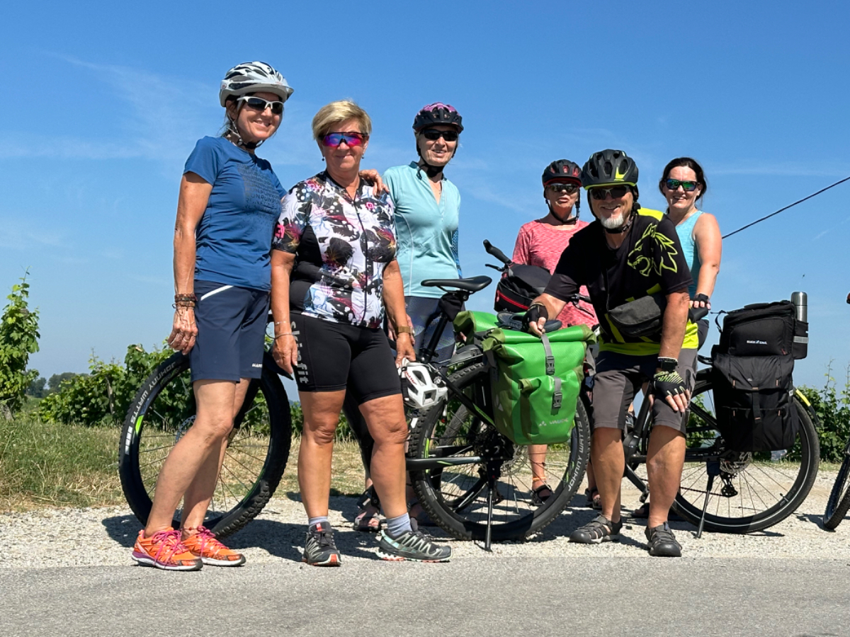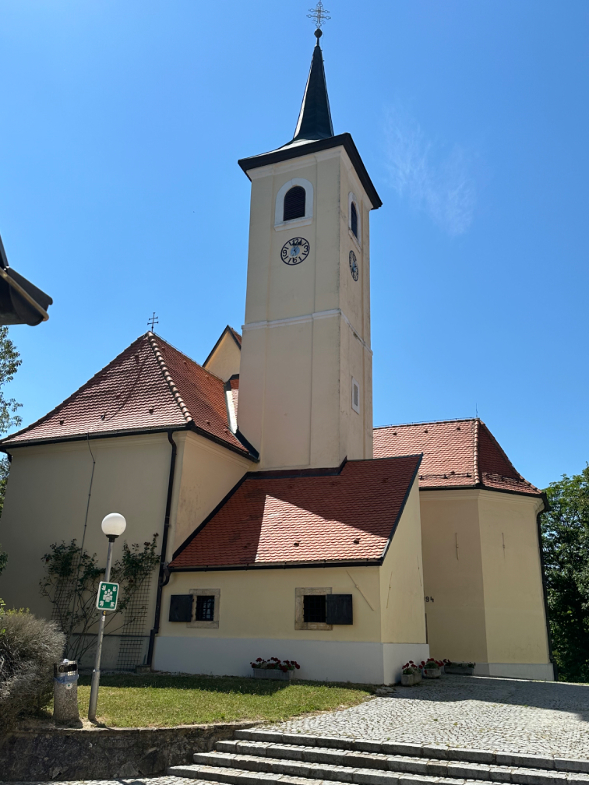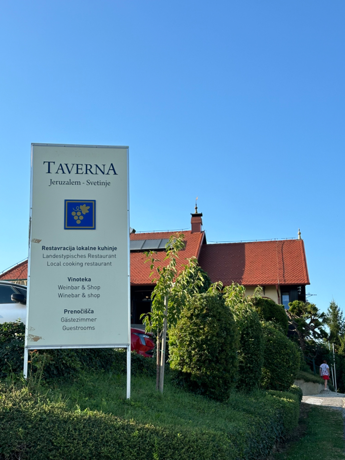 Über von typischer Vorstadtarchitektur gesäumten Straßen verlassen wir den Ort. Es erwarten uns einige Hügel, die Landschaft wird immer schöner, sehr ähnlich der Südsteirischen Weingegend, es ist wahrlich ein Genuss hier zu radeln, und auch die Temperatur ist noch einigermaßen angenehm. Nachdem wir erst um 9:30 losgefahren sind, wird uns die gross angekündigte Hitze heute aber sicher noch zu schaffen machen. Wir werden von einem Radfahrer mit Strassenrad in zügigem Tempo überholt. Beim nächsten Anstieg holen wir ihn aber wieder ein, überholen ihn aber nicht. Oben angekommen sehe ich erst, wie total verschwitzt der Mann nach diesem Anstieg ist, da haben wir mit unseren e bikes einen Vorteil, der speziell bei diesen Verhältnissen nicht hoch genug geschätzt werden kann :-) Als wir die Weinberge verlassen, liegen bis Ljutomer viele Kilometer flaches Land vor uns. Da wird die Hitze dann doch schon spürbar, die Sonne brennt vom wolkenlosen, blauen Himmel, und der schwarze Asphalt reflektiert die Sonne, quasi Ober -und Unterhitze. Ganz arg wird es wenn man zwischen Maisfeldern fährt, aber es wird nicht geklagt, es ist Sommer! In einem Dorf, dessen Namen ich schon nach der Ortstafel wieder vergessen habe, machen wir in einem schattigen Gastgarten eine Rast und laben uns mit Zitronenwasser mit Minze. Der freundliche Kellner möchte unsere Karin gerne näher kennenlernen, aber Karin lehnt dankend ab. Sie ist so verwirrt, dass sie als wir wieder aufbrechen, direkt vor ihrem Verehrer mit dem Rad einen Bauchfleck hinlegt, aber alles gut, nichts passiert, wir können später darüber scherzen ;-) Weiter gehts, es ist schon nach Mittag als wir Ljutomer erreichen. Die erste größere Stadt, erkennbar an den grösseren Geschäften am Stadtrand wie Lidl, Teddi etc. Der Altstadtkern der Stadt ist sehr schön, am zentralen Platz gönnen wir uns Eis und Eiskaffee, was gibt es schöneres bei diesen Temperaturen! Dann geht es aber wieder hinauf, in die Weinberge von Jeruzalem. Jetzt spürt man die 35 Grad bei jeder Umdrehung der Tretkurbel, aber als sich die Schönheit dieser Gegend das erste mal vor uns auftut, sind wir geflasht, so schön ist es hier. Wir suchen den Schatten der hohen Bäume am Wegesrand, als wir unseren Augen kaum trauen. Peter kommt mit seinem VW Bus den Berg herauf geröchelt. Eine freudige Überraschung, mit der niemand gerechnet hat :-) Gemeinsam fahren wir die letzten km bis Jeruzalem, wo wir die Kirche und die Vinothek besuchen, aber es ist einfach viel zu heiß, um jetzt Wein zu trinken. Nicht so für Renate, sie verkostet ein paar edle Tropfen der lokalen Köstlichkeiten. Am Weg zu unserer Unterkunft stoppen wir beim einzigen Gasthaus hier heroben, die Taverna, hier lädt uns Peter auf ein zisch frisches Ankommensbier ein, vielen Dank mein Freund! Danach fährt er zurück nach Radkersburg und wir die letzten Meter zu unsrer Unterkunft. Wir werden schon erwartet, Katja die freundliche Vermieterin serviert uns ein Glas Frizzante, zeigt uns die Radgarage und unsere Zimmer - mit Klimaanlage :-) Die Vinothek, erzählt sie uns, ist über 100 Jahre alt und war früher einmal ein Geschäft für allerhand Sachen, heute würde man Nahversorger dazu sagen. Es gab hier auch einmal eine Schule, eine Kirche gibt es noch immer, uns somit war es ein kleines Dorf mit wahrscheinlich einer Handvoll von Einwohnern. Viel los ist hier im Sommer nicht, die Saison ist hier, wie eh auch in unserer Weingegend, eher der Herbst. Aber uns ist es nur recht, dass hier nichts los ist, diese Ruhe ist einfach herrlich! Wir gehen dann nochmals zur Taverna zum Essen und speisen dort vorzüglich. Mittlerweile ist es schon wieder 23 Uhr, Zeit schlafen zu gehen, was ausser mir alle schon seit geraumer Zeit bereits tun ;-)