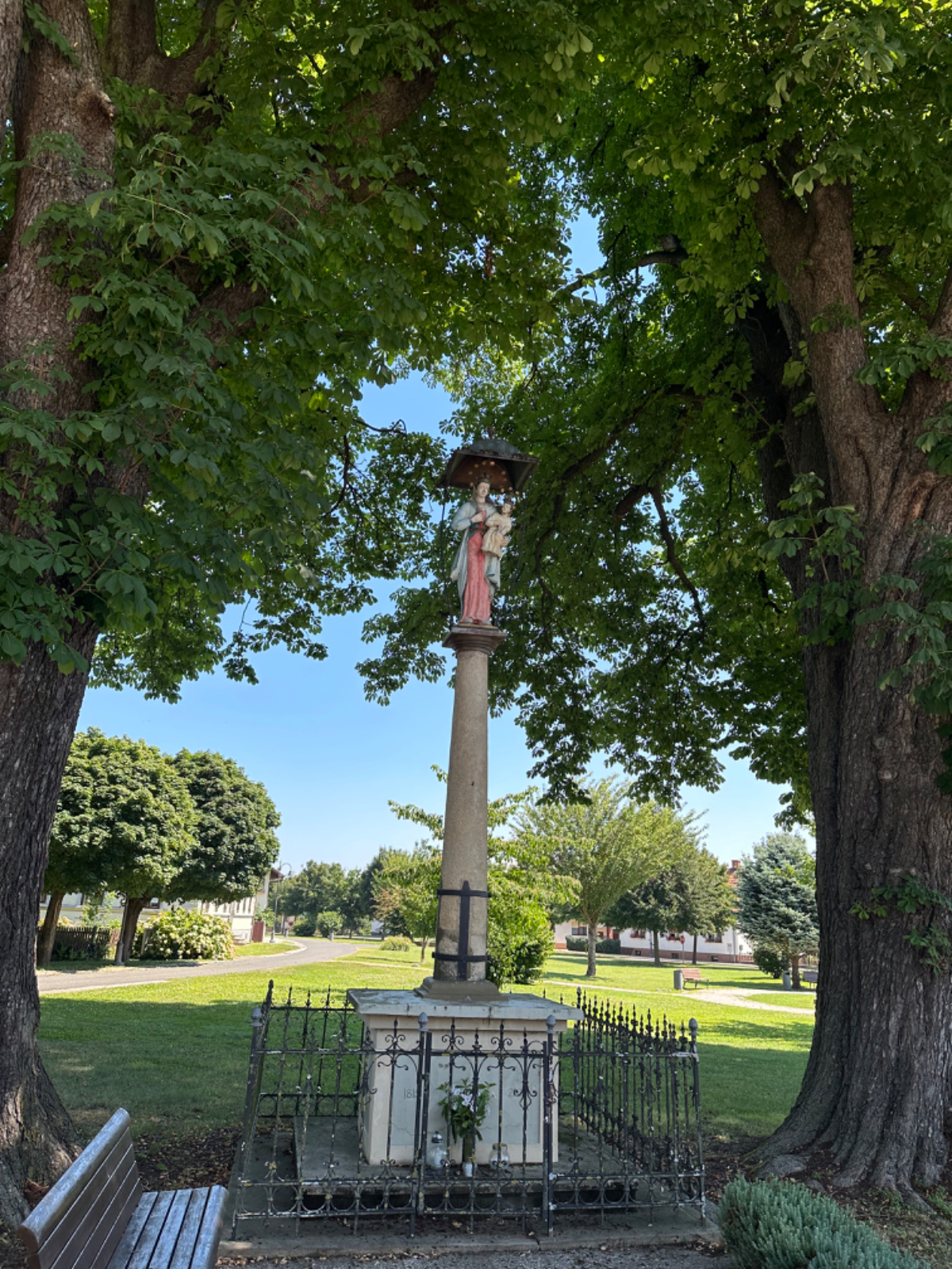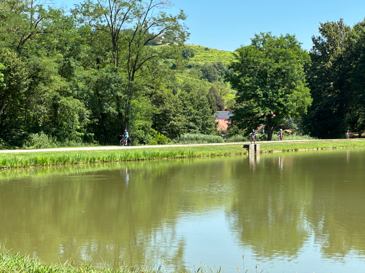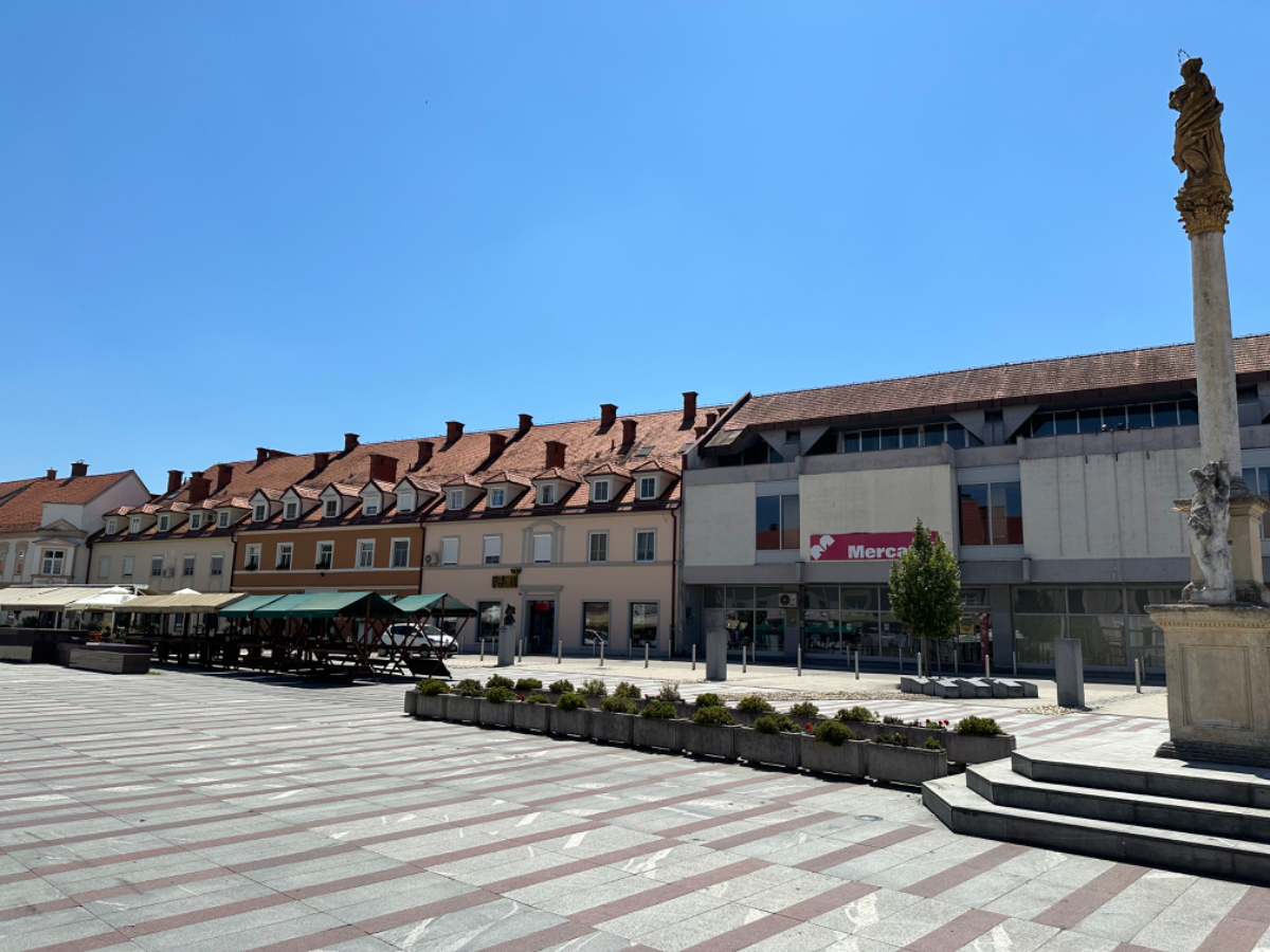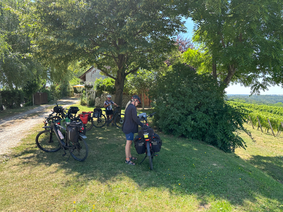 Über von typischer Vorstadtarchitektur gesäumten Straßen verlassen wir den Ort. Es erwarten uns einige Hügel, die Landschaft wird immer schöner, sehr ähnlich der Südsteirischen Weingegend, es ist wahrlich ein Genuss hier zu radeln, und auch die Temperatur ist noch einigermaßen angenehm. Nachdem wir erst um 9:30 losgefahren sind, wird uns die gross angekündigte Hitze heute aber sicher noch zu schaffen machen. Wir werden von einem Radfahrer mit Strassenrad in zügigem Tempo überholt. Beim nächsten Anstieg holen wir ihn aber wieder ein, überholen ihn aber nicht. Oben angekommen sehe ich erst, wie total verschwitzt der Mann nach diesem Anstieg ist, da haben wir mit unseren e bikes einen Vorteil, der speziell bei diesen Verhältnissen nicht hoch genug geschätzt werden kann :-) Als wir die Weinberge verlassen, liegen bis Ljutomer viele Kilometer flaches Land vor uns. Da wird die Hitze dann doch schon spürbar, die Sonne brennt vom wolkenlosen, blauen Himmel, und der schwarze Asphalt reflektiert die Sonne, quasi Ober -und Unterhitze. Ganz arg wird es wenn man zwischen Maisfeldern fährt, aber es wird nicht geklagt, es ist Sommer! In einem Dorf, dessen Namen ich schon nach der Ortstafel wieder vergessen habe, machen wir in einem schattigen Gastgarten eine Rast und laben uns mit Zitronenwasser mit Minze. Der freundliche Kellner möchte unsere Karin gerne näher kennenlernen, aber Karin lehnt dankend ab. Sie ist so verwirrt, dass sie als wir wieder aufbrechen, direkt vor ihrem Verehrer mit dem Rad einen Bauchfleck hinlegt, aber alles gut, nichts passiert, wir können später darüber scherzen ;-) Weiter gehts, es ist schon nach Mittag als wir Ljutomer erreichen. Die erste größere Stadt, erkennbar an den grösseren Geschäften am Stadtrand wie Lidl, Teddi etc. Der Altstadtkern der Stadt ist sehr schön, am zentralen Platz gönnen wir uns Eis und Eiskaffee, was gibt es schöneres bei diesen Temperaturen! Dann geht es aber wieder hinauf, in die Weinberge von Jeruzalem. Jetzt spürt man die 35 Grad bei jeder Umdrehung der Tretkurbel, aber als sich die Schönheit dieser Gegend das erste mal vor uns auftut, sind wir geflasht, so schön ist es hier. Wir suchen den Schatten der hohen Bäume am Wegesrand, als wir unseren Augen kaum trauen. Peter kommt mit seinem VW Bus den Berg herauf geröchelt. Eine freudige Überraschung, mit der niemand gerechnet hat :-) Gemeinsam fahren wir die letzten km bis Jeruzalem, wo wir die Kirche und die Vinothek besuchen, aber es ist einfach viel zu heiß, um jetzt Wein zu trinken. Nicht so für Renate, sie verkostet ein paar edle Tropfen der lokalen Köstlichkeiten. Am Weg zu unserer Unterkunft stoppen wir beim einzigen Gasthaus hier heroben, die Taverna, hier lädt uns Peter auf ein zisch frisches Ankommensbier ein, vielen Dank mein Freund! Danach fährt er zurück nach Radkersburg und wir die letzten Meter zu unsrer Unterkunft. Wir werden schon erwartet, Katja die freundliche Vermieterin serviert uns ein Glas Frizzante, zeigt uns die Radgarage und unsere Zimmer - mit Klimaanlage :-) Die Vinothek, erzählt sie uns, ist über 100 Jahre alt und war früher einmal ein Geschäft für allerhand Sachen, heute würde man Nahversorger dazu sagen. Es gab hier auch einmal eine Schule, eine Kirche gibt es noch immer, uns somit war es ein kleines Dorf mit wahrscheinlich einer Handvoll von Einwohnern. Viel los ist hier im Sommer nicht, die Saison ist hier, wie eh auch in unserer Weingegend, eher der Herbst. Aber uns ist es nur recht, dass hier nichts los ist, diese Ruhe ist einfach herrlich! Wir gehen dann nochmals zur Taverna zum Essen und speisen dort vorzüglich. Mittlerweile ist es schon wieder 23 Uhr, Zeit schlafen zu gehen, was ausser mir alle schon seit geraumer Zeit bereits tun ;-)