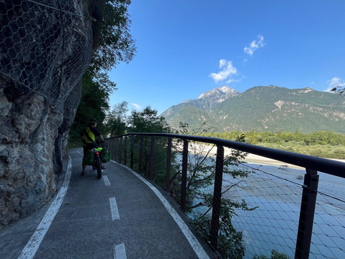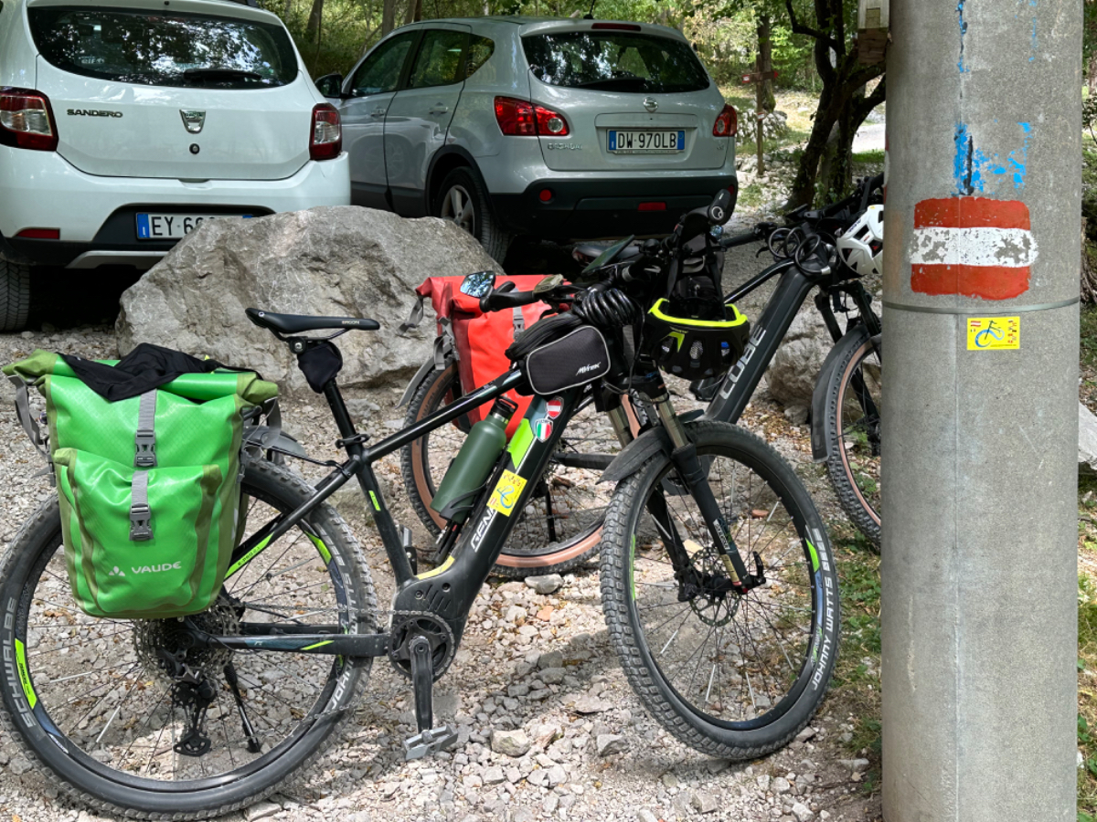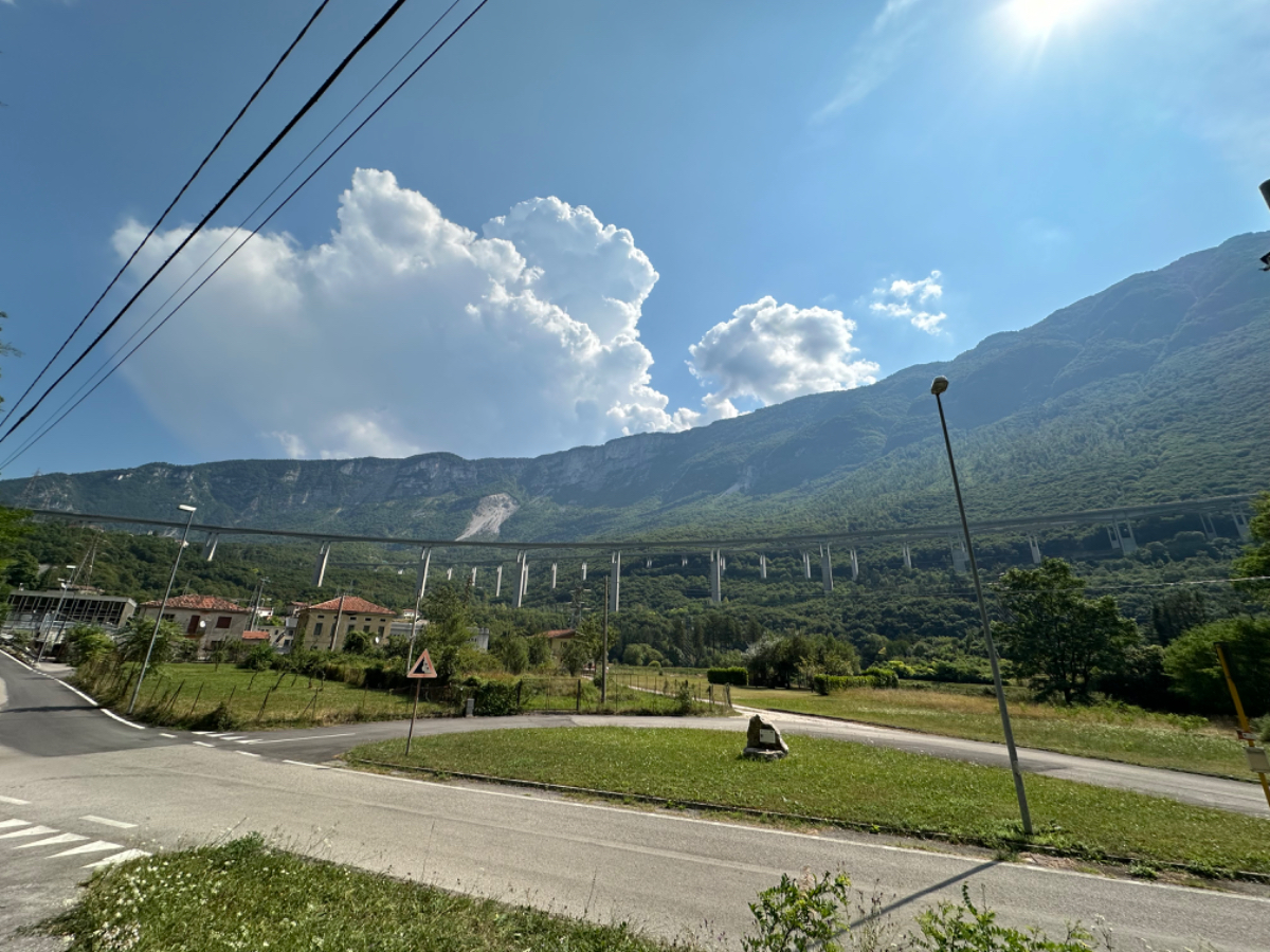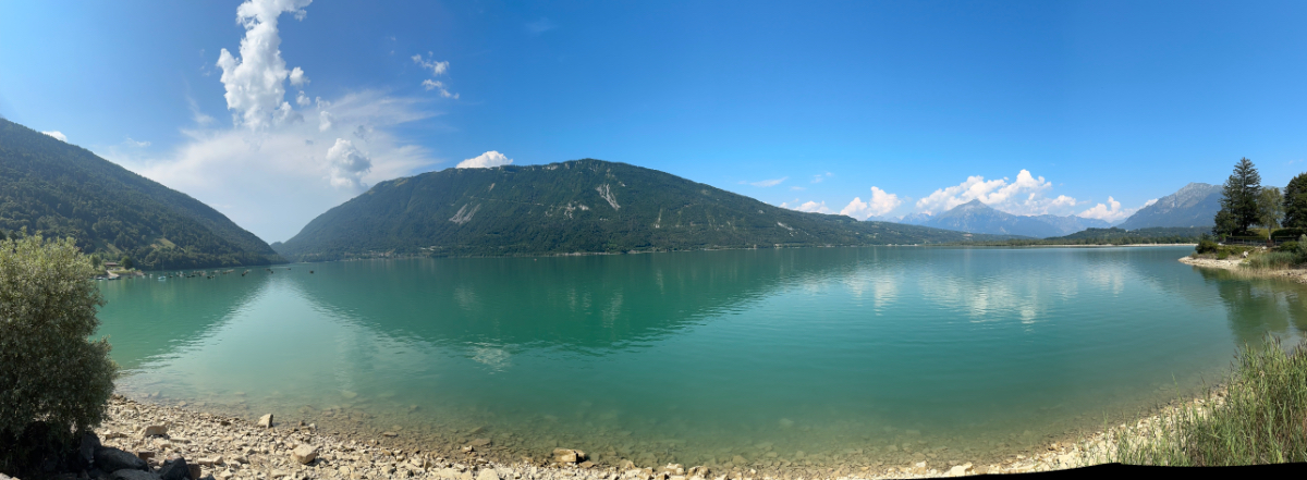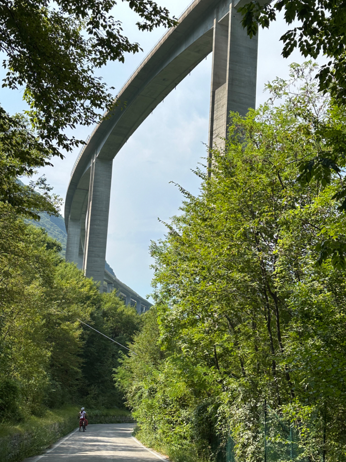 Zum Frühstück gabs Joghurt, Käse und Brot von gestern, es gab nicht einmal einen Wasserkocher um Tee zu machen. Anyway, ist schon Geschichte. Um 7:45 fuhren wir los, das Wetter gut, ohne Jacke zu kalt. Der Radweg führt steil bergab, bald erreichen wir eine Strasse, die für den Individualverkehr gesperrt ist, nur Radfahrer und Anrainer dürfen die perfekt ausgebaute Strasse benützen. Es ist ein absoluter Hochgenuss über Serpentinen ins Tal zu brausen, in dem noch kein Sonnenstrahl hereinfällt. Landschaftlich einfach wieder wunderschön :-) Wir fahren durch dieses Tal entlang eines Flusses zumeist auf Radwegen oder kaum befahrenen Nebenstraßen und je weiter wir aus dem Tal hinauskommen, steigt merklich die Temperatur. Bei einer Bar gönnen wir uns Kaffee und Tee und ein Croisant. Der Wirt erzählt, dass es in den letzten Wochen hier sehr viel Regen gab, auch Hagel mit der Größe einer Orange war dabei. Wir haben auch etliche Autos mit entsprechenden Schäden gesehen. Wir fahren weiter. Am Lago di Santa Groce gibt es einen breiten Sandstrand, der wie auch die anschließenden Wiesen gut belegt ist. Das Wasser ist verlockend, aber wir fahren weiter am Ufer des Sees entlang, es liegt noch viel Schönes auf unserem Weg. So konnten wir heute Italienische Ingenieurskunst bewundern. Ein Tal, durchzogen von Brücken von gleich zwei Autobahnen in schwindelnder Höhe und endlos scheinende Brücken entlang des Berghangs. Wir hatten heute schon einige Umleitungen, am Ende dieses Tals liegt ein idyllischer See, an dessen Ufer die Radroute verläuft, verlaufen sollte. Totalsperre, mit der Option Autobahn oder Singletrail auf der anderen Uferseite. Und der Trail hat es in sich, unsere Räder mit Gepäck sind absolut ungeeignet um die steilen Geröll Anstiege zu bewältigen, aber was soll’s, es gibt keine Alternative, da müssen wir durch. Mittlerweile ist es heiß geworden, der Schweiß fließt in Ströme, als wir endlich durch sind. Wir erreichen wieder ein Ufergestade, das zum Baden einlädt. Zumindest unsere Beine kühlen wir im See und machen im Schatten eine von vielen weiteren Trinkpausen. Hinter uns in den Bergen rumpelt es, ein Gewitter zieht auf, also weiter. In Vittorio Veneto, am sehr stimmungsvollen Hauptplatz, gönnen wir uns ein Gelato vom Feinsten :-) Aber das Wetter drängt zum Aufbruch. Bis Susegana fahren wir größtenteils auf Nebenstraßen rauf und runter und durchqueren die Prosecco Region, aber ich habe keinen Blick mehr für die Landschaft, es ist HOT, HOT, HOT…….
