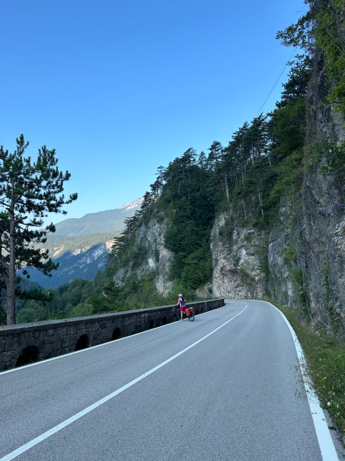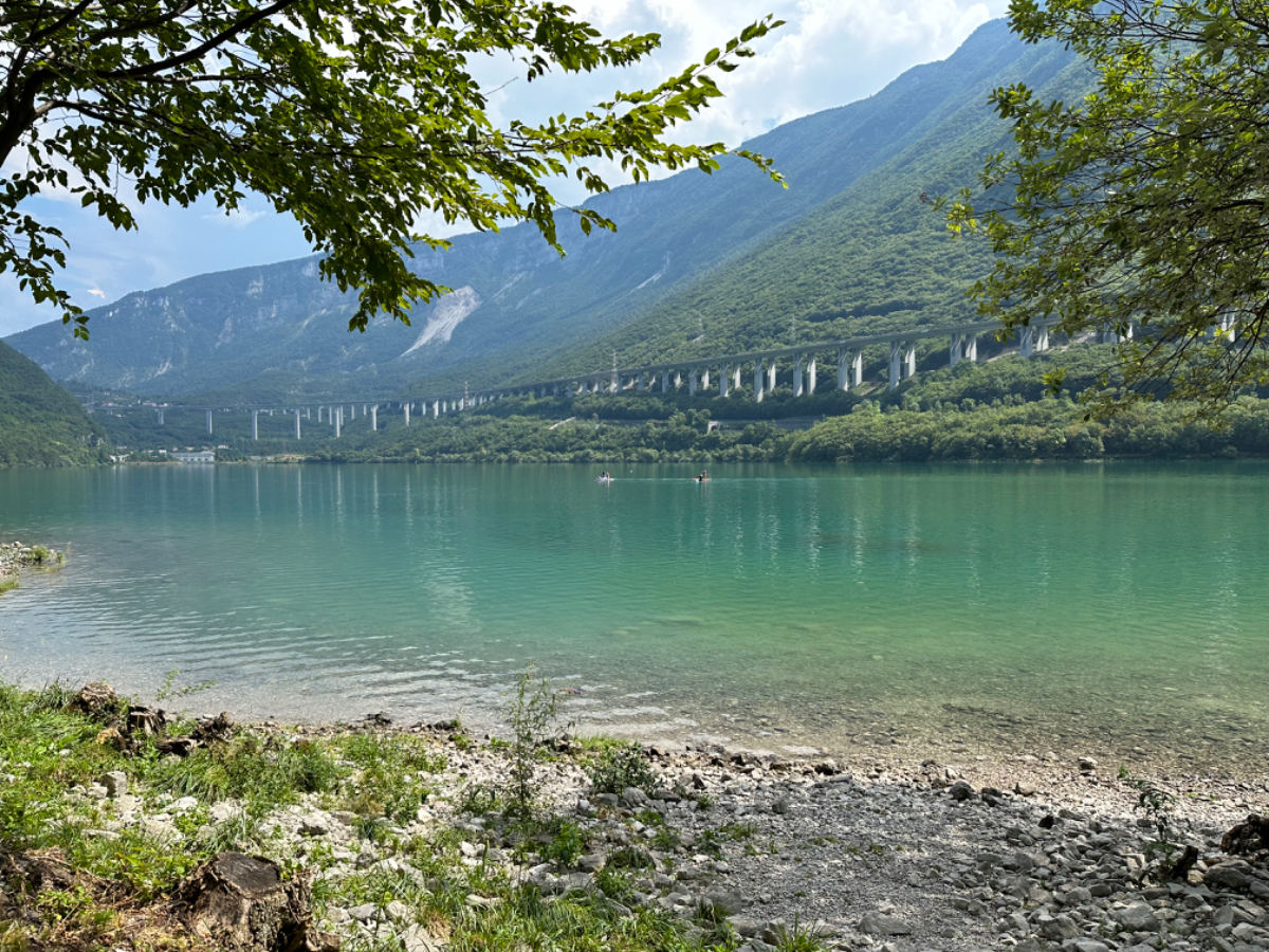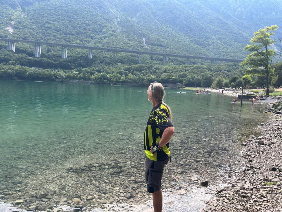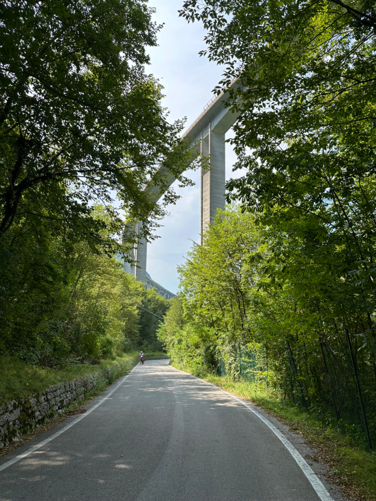 Zum Frühstück gabs Joghurt, Käse und Brot von gestern, es gab nicht einmal einen Wasserkocher um Tee zu machen. Anyway, ist schon Geschichte. Um 7:45 fuhren wir los, das Wetter gut, ohne Jacke zu kalt. Der Radweg führt steil bergab, bald erreichen wir eine Strasse, die für den Individualverkehr gesperrt ist, nur Radfahrer und Anrainer dürfen die perfekt ausgebaute Strasse benützen. Es ist ein absoluter Hochgenuss über Serpentinen ins Tal zu brausen, in dem noch kein Sonnenstrahl hereinfällt. Landschaftlich einfach wieder wunderschön :-) Wir fahren durch dieses Tal entlang eines Flusses zumeist auf Radwegen oder kaum befahrenen Nebenstraßen und je weiter wir aus dem Tal hinauskommen, steigt merklich die Temperatur. Bei einer Bar gönnen wir uns Kaffee und Tee und ein Croisant. Der Wirt erzählt, dass es in den letzten Wochen hier sehr viel Regen gab, auch Hagel mit der Größe einer Orange war dabei. Wir haben auch etliche Autos mit entsprechenden Schäden gesehen. Wir fahren weiter. Am Lago di Santa Groce gibt es einen breiten Sandstrand, der wie auch die anschließenden Wiesen gut belegt ist. Das Wasser ist verlockend, aber wir fahren weiter am Ufer des Sees entlang, es liegt noch viel Schönes auf unserem Weg. So konnten wir heute Italienische Ingenieurskunst bewundern. Ein Tal, durchzogen von Brücken von gleich zwei Autobahnen in schwindelnder Höhe und endlos scheinende Brücken entlang des Berghangs. Wir hatten heute schon einige Umleitungen, am Ende dieses Tals liegt ein idyllischer See, an dessen Ufer die Radroute verläuft, verlaufen sollte. Totalsperre, mit der Option Autobahn oder Singletrail auf der anderen Uferseite. Und der Trail hat es in sich, unsere Räder mit Gepäck sind absolut ungeeignet um die steilen Geröll Anstiege zu bewältigen, aber was soll’s, es gibt keine Alternative, da müssen wir durch. Mittlerweile ist es heiß geworden, der Schweiß fließt in Ströme, als wir endlich durch sind. Wir erreichen wieder ein Ufergestade, das zum Baden einlädt. Zumindest unsere Beine kühlen wir im See und machen im Schatten eine von vielen weiteren Trinkpausen. Hinter uns in den Bergen rumpelt es, ein Gewitter zieht auf, also weiter. In Vittorio Veneto, am sehr stimmungsvollen Hauptplatz, gönnen wir uns ein Gelato vom Feinsten :-) Aber das Wetter drängt zum Aufbruch. Bis Susegana fahren wir größtenteils auf Nebenstraßen rauf und runter und durchqueren die Prosecco Region, aber ich habe keinen Blick mehr für die Landschaft, es ist HOT, HOT, HOT…….