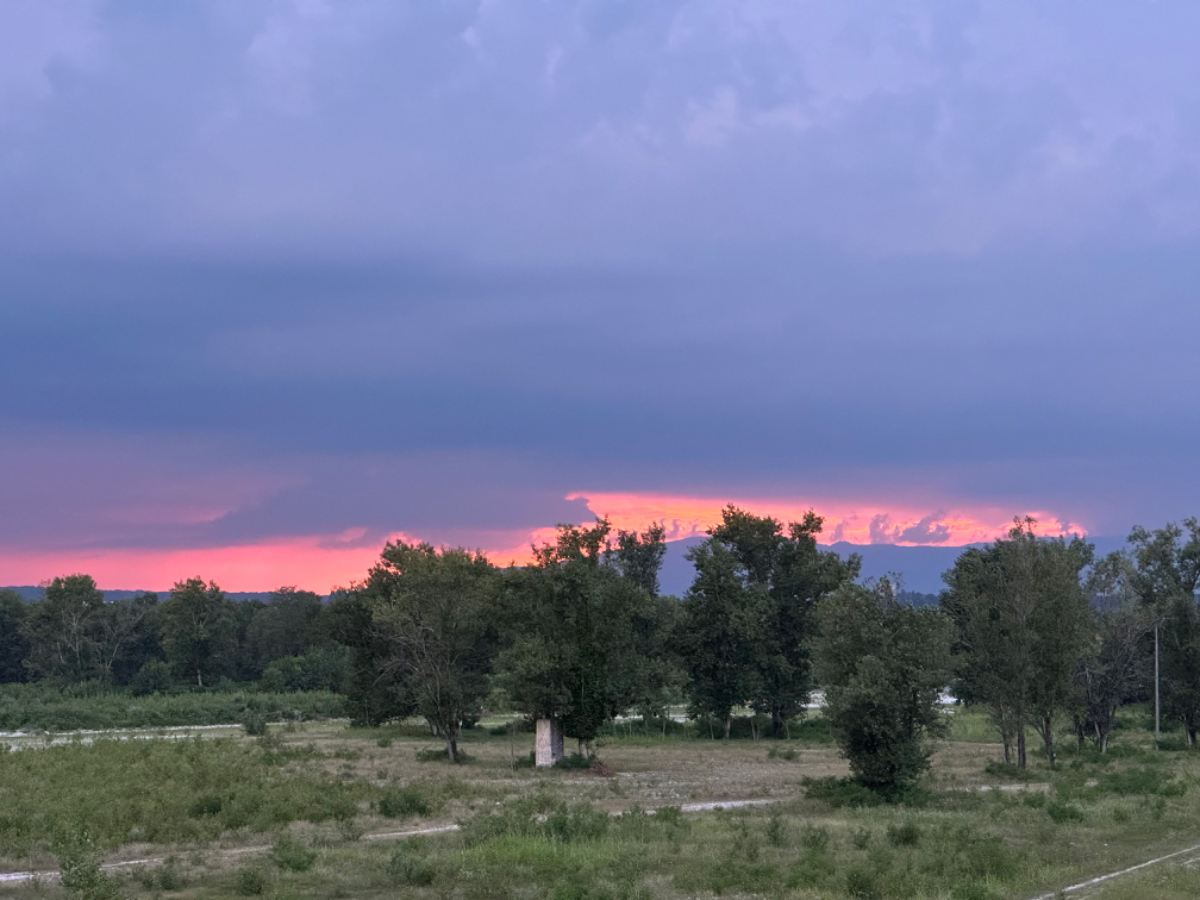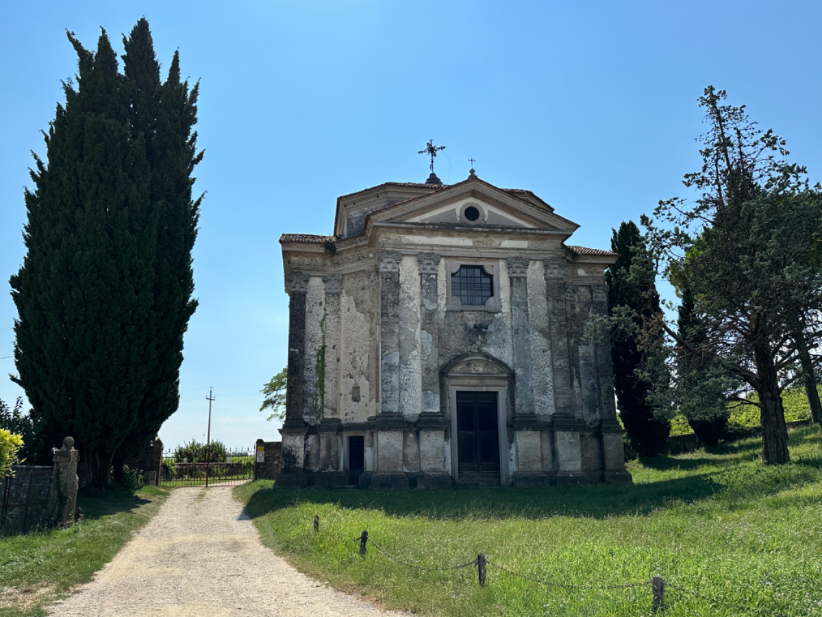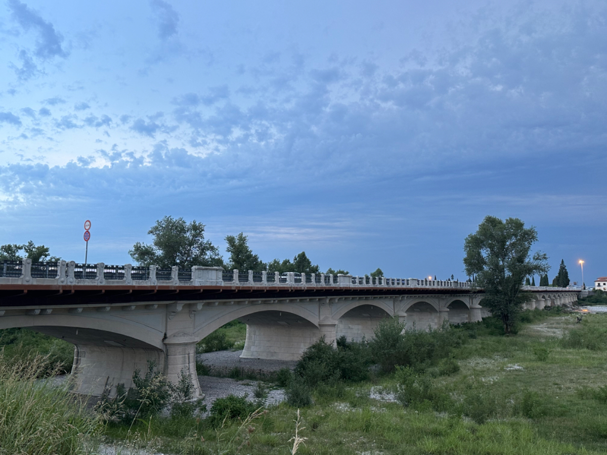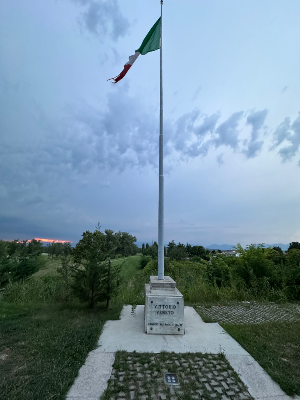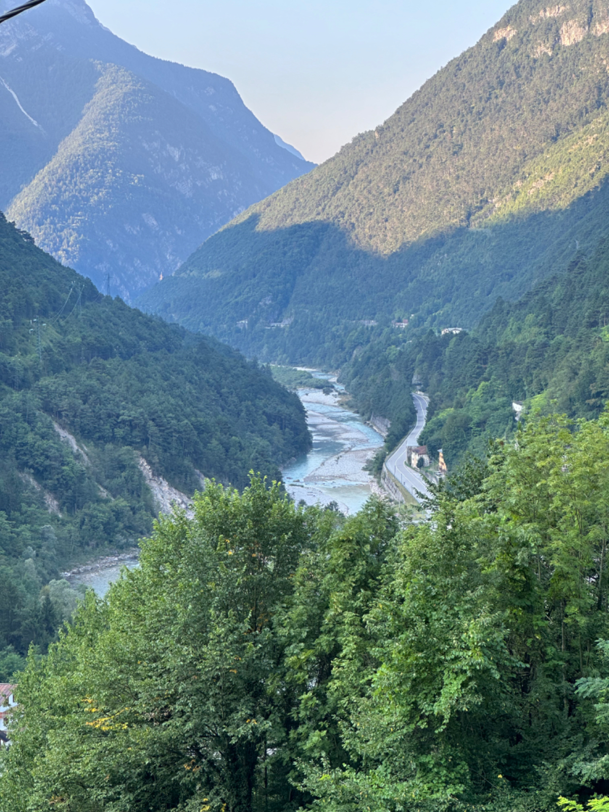 Zum Frühstück gabs Joghurt, Käse und Brot von gestern, es gab nicht einmal einen Wasserkocher um Tee zu machen. Anyway, ist schon Geschichte. Um 7:45 fuhren wir los, das Wetter gut, ohne Jacke zu kalt. Der Radweg führt steil bergab, bald erreichen wir eine Strasse, die für den Individualverkehr gesperrt ist, nur Radfahrer und Anrainer dürfen die perfekt ausgebaute Strasse benützen. Es ist ein absoluter Hochgenuss über Serpentinen ins Tal zu brausen, in dem noch kein Sonnenstrahl hereinfällt. Landschaftlich einfach wieder wunderschön :-) Wir fahren durch dieses Tal entlang eines Flusses zumeist auf Radwegen oder kaum befahrenen Nebenstraßen und je weiter wir aus dem Tal hinauskommen, steigt merklich die Temperatur. Bei einer Bar gönnen wir uns Kaffee und Tee und ein Croisant. Der Wirt erzählt, dass es in den letzten Wochen hier sehr viel Regen gab, auch Hagel mit der Größe einer Orange war dabei. Wir haben auch etliche Autos mit entsprechenden Schäden gesehen. Wir fahren weiter. Am Lago di Santa Groce gibt es einen breiten Sandstrand, der wie auch die anschließenden Wiesen gut belegt ist. Das Wasser ist verlockend, aber wir fahren weiter am Ufer des Sees entlang, es liegt noch viel Schönes auf unserem Weg. So konnten wir heute Italienische Ingenieurskunst bewundern. Ein Tal, durchzogen von Brücken von gleich zwei Autobahnen in schwindelnder Höhe und endlos scheinende Brücken entlang des Berghangs. Wir hatten heute schon einige Umleitungen, am Ende dieses Tals liegt ein idyllischer See, an dessen Ufer die Radroute verläuft, verlaufen sollte. Totalsperre, mit der Option Autobahn oder Singletrail auf der anderen Uferseite. Und der Trail hat es in sich, unsere Räder mit Gepäck sind absolut ungeeignet um die steilen Geröll Anstiege zu bewältigen, aber was soll’s, es gibt keine Alternative, da müssen wir durch. Mittlerweile ist es heiß geworden, der Schweiß fließt in Ströme, als wir endlich durch sind. Wir erreichen wieder ein Ufergestade, das zum Baden einlädt. Zumindest unsere Beine kühlen wir im See und machen im Schatten eine von vielen weiteren Trinkpausen. Hinter uns in den Bergen rumpelt es, ein Gewitter zieht auf, also weiter. In Vittorio Veneto, am sehr stimmungsvollen Hauptplatz, gönnen wir uns ein Gelato vom Feinsten :-) Aber das Wetter drängt zum Aufbruch. Bis Susegana fahren wir größtenteils auf Nebenstraßen rauf und runter und durchqueren die Prosecco Region, aber ich habe keinen Blick mehr für die Landschaft, es ist HOT, HOT, HOT…….