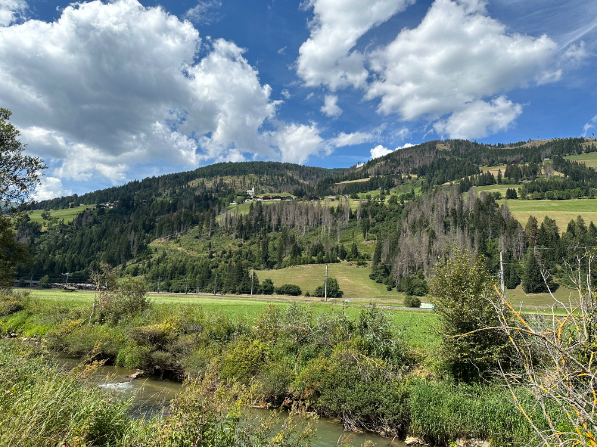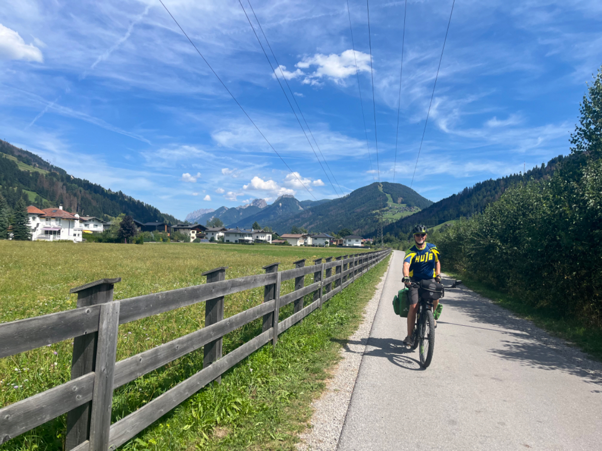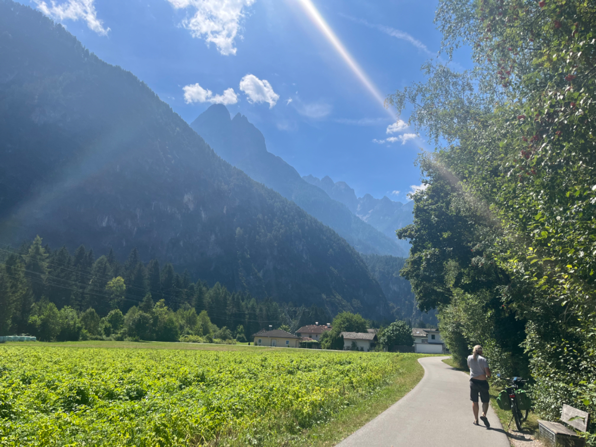 Nach einem Überraschungsfrühstück (Danke Eva) starten wir um 7 Uhr Richtung Villach. Das Wetter ist gut, der Verkehr mäßig und so sind wir bald da. Ich parke direkt vor dem Villacher Bahnhof, zwischen zwei Halteverbotstafeln, auf dem Gehsteig, und auch noch direkt vor dem Polizeiwachzimmer. Das alles war mir nicht bewusst, wir wollten nur ganz schnell die Räder samt Gepäck abladen, bevor ich in die Tiefgarage fahre. Den Beamten blieb das allerdings nicht verborgen und es dauerte nicht lange, bis mich ein Polizist zur Rede stellte. Ich konnte ihn gnädig stimmen und er beließ es bei einer einmaligen Abmahnung. Vielen Dank, Glück gehabt! In jedem Fall ein gelungener Start in unsere Reise :-) Die Zugfahrt nach Lienz vergeht wie im Flug, ab Spittal wird die Landschaft immer schöner, die Berge links und rechts immer höher, bis der Blick auf die Lienzer Dolomiten das Ende der Zugreise ankündigt. Der Zug war klimatisiert, da fühlte sich die Temperatur in Lienz noch heißer an, als es mit 31 Grad ohnehin war. Richtig heiß her geht es dann aber auf dem Radweg. Hunderte von Radfahrern kommen uns entgegen, vorwiegend italienische Familien brausen den Radweg herunter, und einige Male sind Kollisionen nur knapp zu vermeiden gewesen. Auch die Rettung hatte einen Einsatz wegen eines Verunglückten. Es ist dies der Italiener Abschnitt des Drau Radweges, von Innichen bis Lienz. In Innichen stehen hunderte von Fahrrädern zum Tagesverleih bereit, und retour geht es mit dem Zug mit eigens angehängten Waggons nur für die unendlich vielen Räder, Tag für Tag den Sommer lang. In unsere Fahrtrichtung hingegen war so gut wie kein Verkehr. Es waren trotzdem sehr schöne 33km, und nach Ankunft in Lienz gönnten wir uns am Hauptplatz zwei Ankommensbiere ;-) Ich bin ja mit einem kleinen Handicap in die Tour gestartet, vor zwei Wochen habe ich mir im linken Oberschenkel einen Muskel eingerissen, und vor zwei Tagen habe ich mir die rechte Schulter verrissen, mit starken Schmerzen bei bestimmten Bewegungen, beim Radfahren nicht zu vermeiden. Ich wurde gestern noch von meiner Tochter professionell getapet, von Riki gesalbt, und mit leichter Schmerzunterdrückung und moderater elektrischer Unterstützung ist es doch ganz gut gegangen heute. Bin sehr zufrieden, wenns so bleibt!