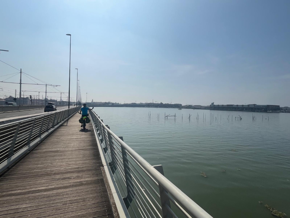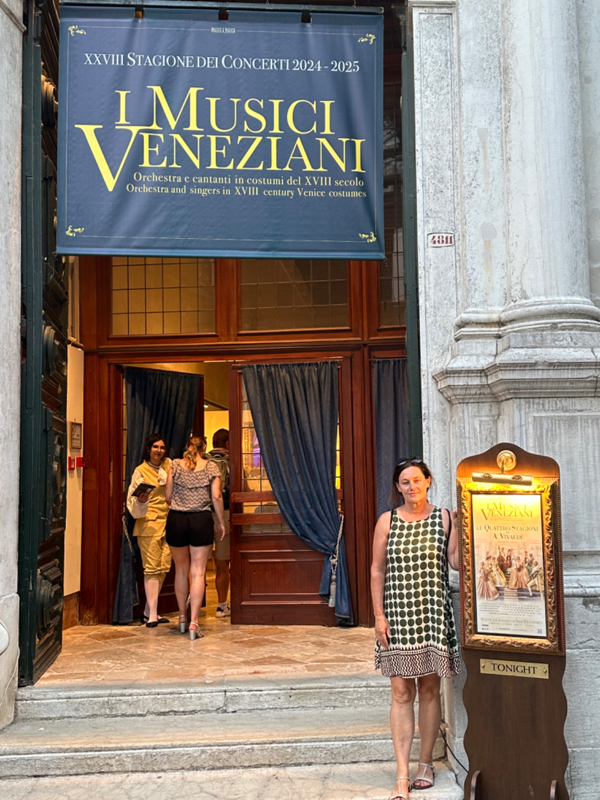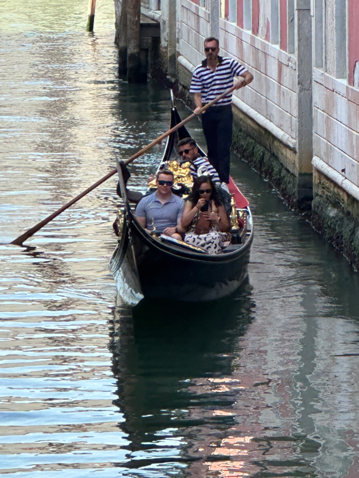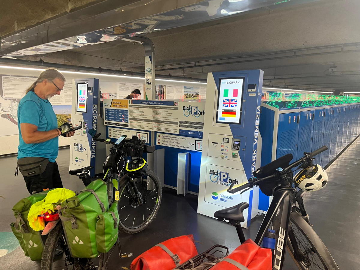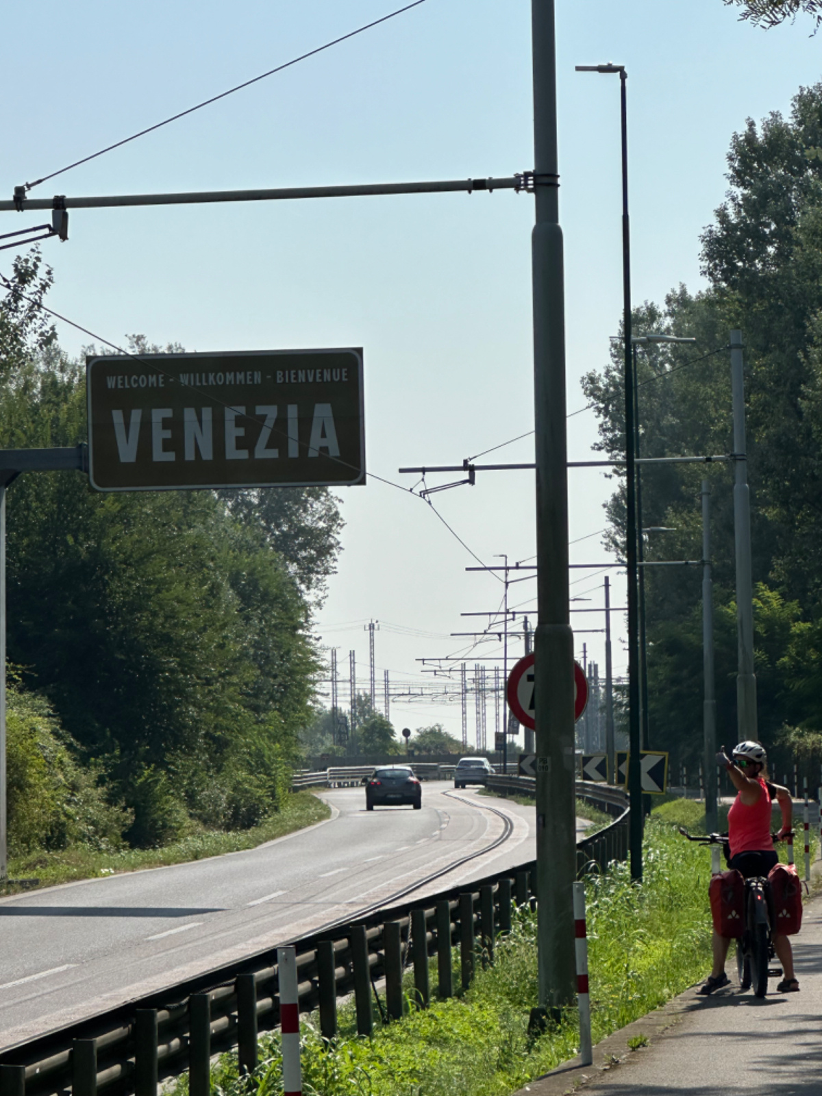 Aufgepackt und Abfahrt um 8:30, es ist warm, aber vielmehr ist es heute extrem schwül. Zum Glück sind es nur ca. 35km bis Venedig. Die Fahrt ist unspektakulär, Landstraßen und Radwege wechseln sich ab. Wir treten ordentlich in die Pedale, um vor der grossen Mittagshitze anzukommen. Der Schweiß rinnt in Strömen, als wir Mestre erreichen stoppen wir an der erstbesten Bar um den Flüssigkeitsverlust auszugleichen ;-) Diese Bar ist mehr eine schäbige Kneipe, passt aber gut zu dieser Stadt die so gar nichts anziehendes an sich hat. Zudem hat man das Gefühl, im nichteuropäischen Ausland zu sein. Über ein Wirrwarr an Radwegen erreichen wir eine Bahnunterführung. Eine steile, schmale Treppe führt nach unten und nach der Unterführung ebenso wieder hinauf. Als ob wir nicht schon genug geschwitzt hätten, hieven wir zu zweit unsere Räder wieder rauf. Bald steigt die Stimmung wieder, als Venedig in der Ferne sichtbar wird :-) Über - ich weiß nicht ob es eine Brücke ist - fahren Züge, Busse, Strassenbahnen, unzählige Autos und wir zwei nach Venedig hinein. Hier gibt es den Bici Park, ein Teil einer Tiefgarage, ausgestattet mit Aufbewahrungsboxen für Fahrräder, sogar mit Lademöglichkeit. Nach ein paar Verständigungsschwierigkeiten haben wir die Räder sicher verstaut und machen uns auf die Suche nach unserem Hotel Belle Epoque. Es liegt in der Nähe des Bahnhofs, entsprechend sind die Menschenmassen die in die Stadt hineinströmen, und es ist stickig heiß und uns klebt das Gewand am Körper. Einchecken können wir noch nicht, das Zimmer ist noch nicht fertig :-( Wir trinken ein wirklich gutes Ankommensbier und schlendern halt durch die Gassen, bis wir endlich duschen können. Unser Zimmer - eher eine Kammer - ist wohl im Stil den man von einem alten Hotel hier erwartet, ein Badezimmer in dem man zur Platzangst neigt, dafür mit Aussicht aus dem Fenster auf ein Baugerüst, aber sonst wirklich ganz ok ;-) Jetzt waren wir gerade essen, sehr gut gegessen, die Preise - Venedig halt. Riki hat für den Abend ein Konzert in einer Kirche gebucht, wir werden uns die vier Jahreszeiten von Antonio Vivaldi anhören/ansehen, somit wird der Kulturauftrag dieses Urlaubs auch erfüllt :-) Zuvor fahren wir mit dem Vaporetto zum Markusplatz, Venezia Sightseeing ……