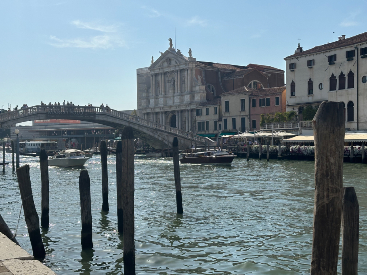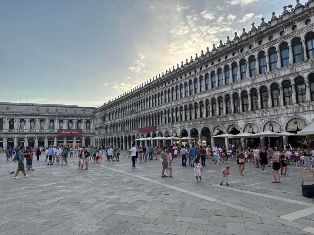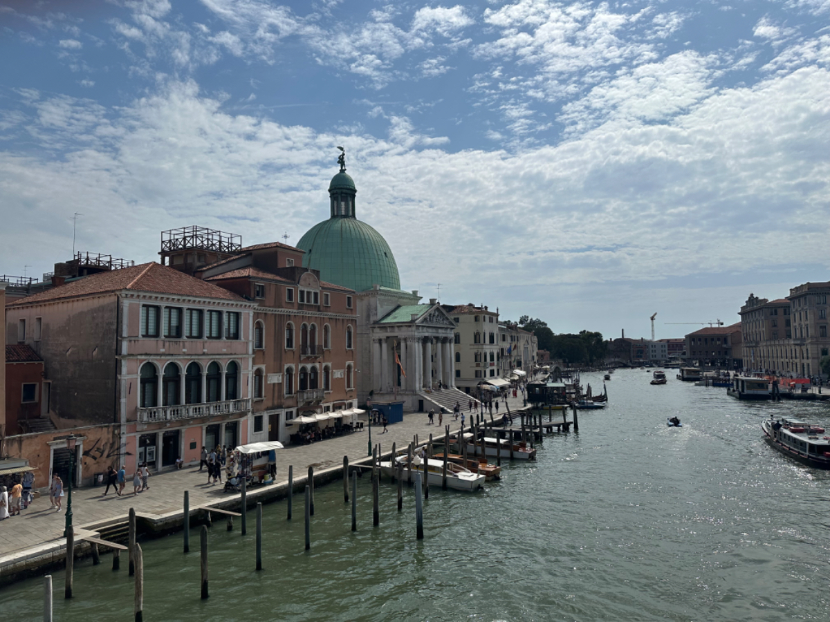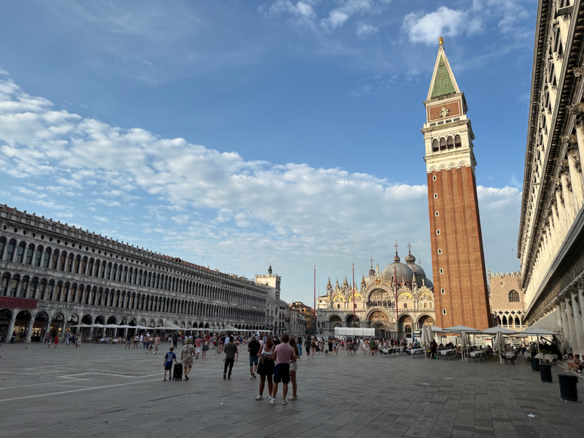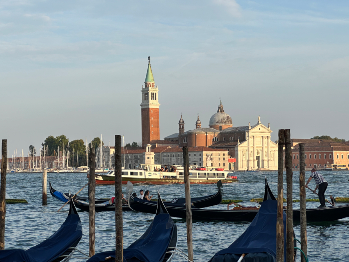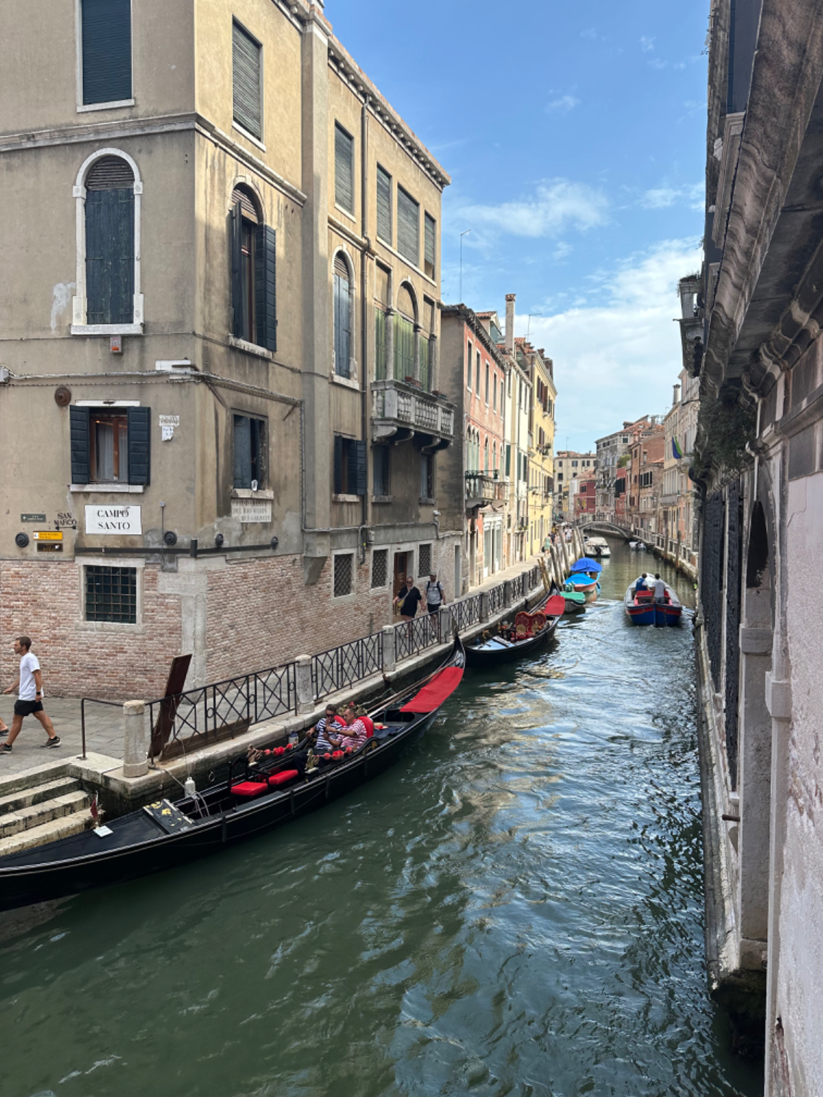 Aufgepackt und Abfahrt um 8:30, es ist warm, aber vielmehr ist es heute extrem schwül. Zum Glück sind es nur ca. 35km bis Venedig. Die Fahrt ist unspektakulär, Landstraßen und Radwege wechseln sich ab. Wir treten ordentlich in die Pedale, um vor der grossen Mittagshitze anzukommen. Der Schweiß rinnt in Strömen, als wir Mestre erreichen stoppen wir an der erstbesten Bar um den Flüssigkeitsverlust auszugleichen ;-) Diese Bar ist mehr eine schäbige Kneipe, passt aber gut zu dieser Stadt die so gar nichts anziehendes an sich hat. Zudem hat man das Gefühl, im nichteuropäischen Ausland zu sein. Über ein Wirrwarr an Radwegen erreichen wir eine Bahnunterführung. Eine steile, schmale Treppe führt nach unten und nach der Unterführung ebenso wieder hinauf. Als ob wir nicht schon genug geschwitzt hätten, hieven wir zu zweit unsere Räder wieder rauf. Bald steigt die Stimmung wieder, als Venedig in der Ferne sichtbar wird :-) Über - ich weiß nicht ob es eine Brücke ist - fahren Züge, Busse, Strassenbahnen, unzählige Autos und wir zwei nach Venedig hinein. Hier gibt es den Bici Park, ein Teil einer Tiefgarage, ausgestattet mit Aufbewahrungsboxen für Fahrräder, sogar mit Lademöglichkeit. Nach ein paar Verständigungsschwierigkeiten haben wir die Räder sicher verstaut und machen uns auf die Suche nach unserem Hotel Belle Epoque. Es liegt in der Nähe des Bahnhofs, entsprechend sind die Menschenmassen die in die Stadt hineinströmen, und es ist stickig heiß und uns klebt das Gewand am Körper. Einchecken können wir noch nicht, das Zimmer ist noch nicht fertig :-( Wir trinken ein wirklich gutes Ankommensbier und schlendern halt durch die Gassen, bis wir endlich duschen können. Unser Zimmer - eher eine Kammer - ist wohl im Stil den man von einem alten Hotel hier erwartet, ein Badezimmer in dem man zur Platzangst neigt, dafür mit Aussicht aus dem Fenster auf ein Baugerüst, aber sonst wirklich ganz ok ;-) Jetzt waren wir gerade essen, sehr gut gegessen, die Preise - Venedig halt. Riki hat für den Abend ein Konzert in einer Kirche gebucht, wir werden uns die vier Jahreszeiten von Antonio Vivaldi anhören/ansehen, somit wird der Kulturauftrag dieses Urlaubs auch erfüllt :-) Zuvor fahren wir mit dem Vaporetto zum Markusplatz, Venezia Sightseeing ……
