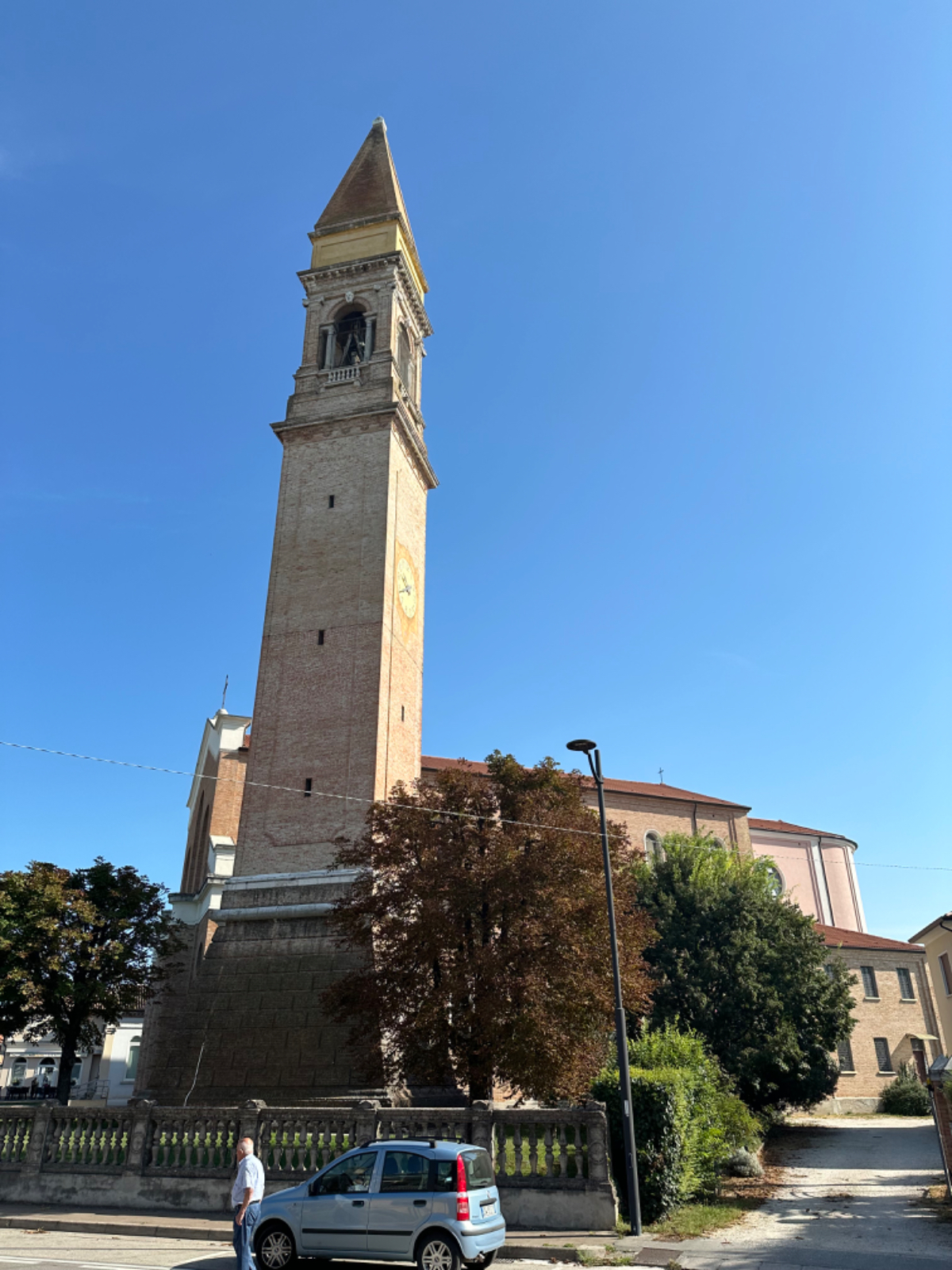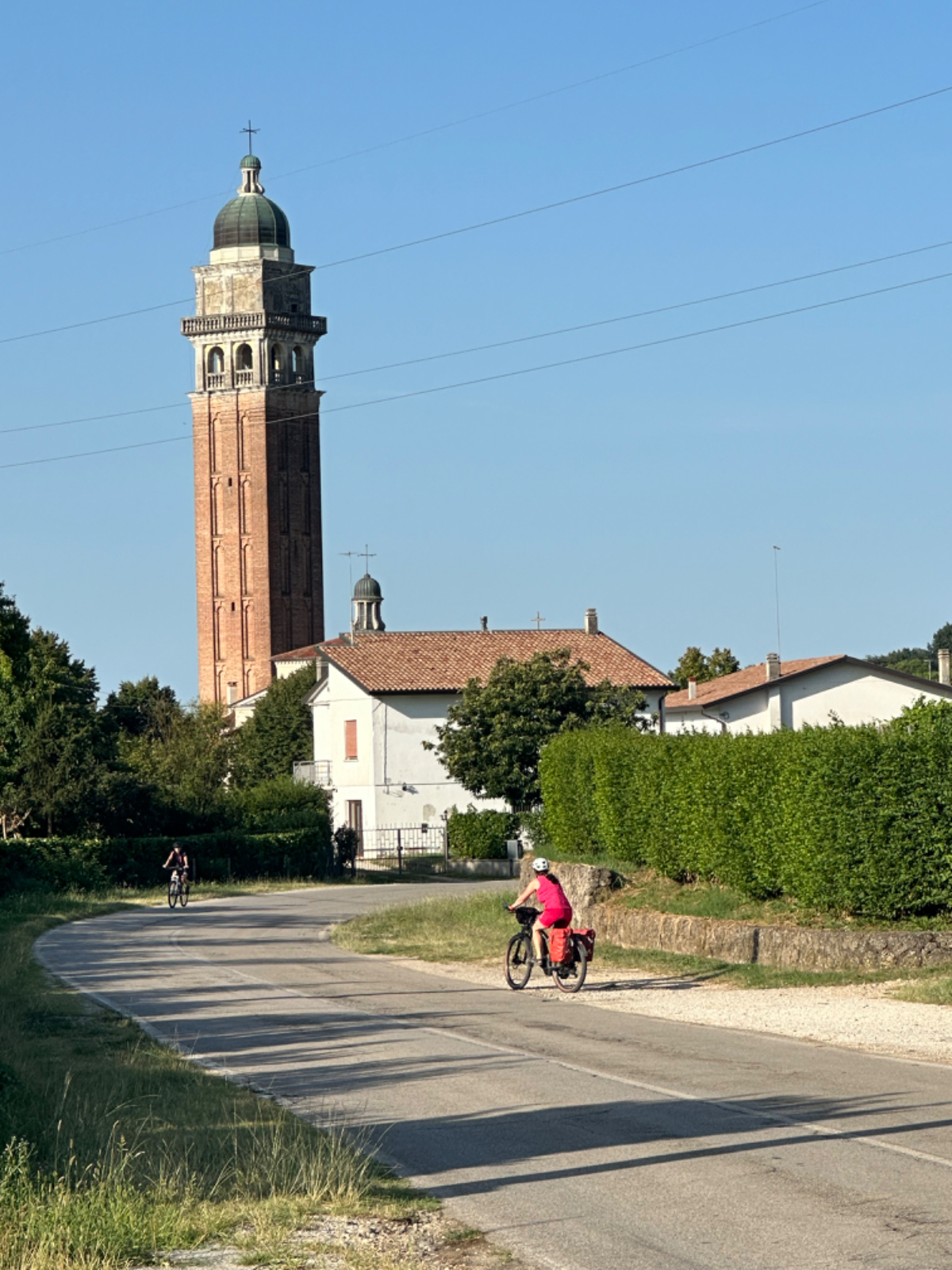 In unserem Hotel fand gestern quasi eine Pre Ferragosto Party statt, ein DJ spielte schreckliche Techno Musik, direkt unter unserem Fenster. Dazu röhrte unsere Klimaanlage wie ein Helikopter - bis ich den Strom abschaltete. Dafür wars dann im Zimmer ziemlich warm die Nacht über, haben aber nach den Anstrengungen des Tages trotzdem gut geschlafen. Nach einem ausgiebigen Frühstück haben wir uns um 8:15 auf die Räder geschwungen und die heutige kurze Etappe von 68 km in Angriff genommen. Es geht über beinahe leere Straßen durch die Dörfer, einige Hügel rauf und wieder hinunter, dann lassen wir die Berge endgültig hinter uns. Ab jetzt gehts durch die Ebene, es sind - wie in Italien an Sonntagen oder Feiertagen üblich - wesentlich mehr Radfahrer als Autos auf der Strasse. Wir kommen sehr gut voran, und nach zwei Stunden und 43km erreichen wir Treviso.