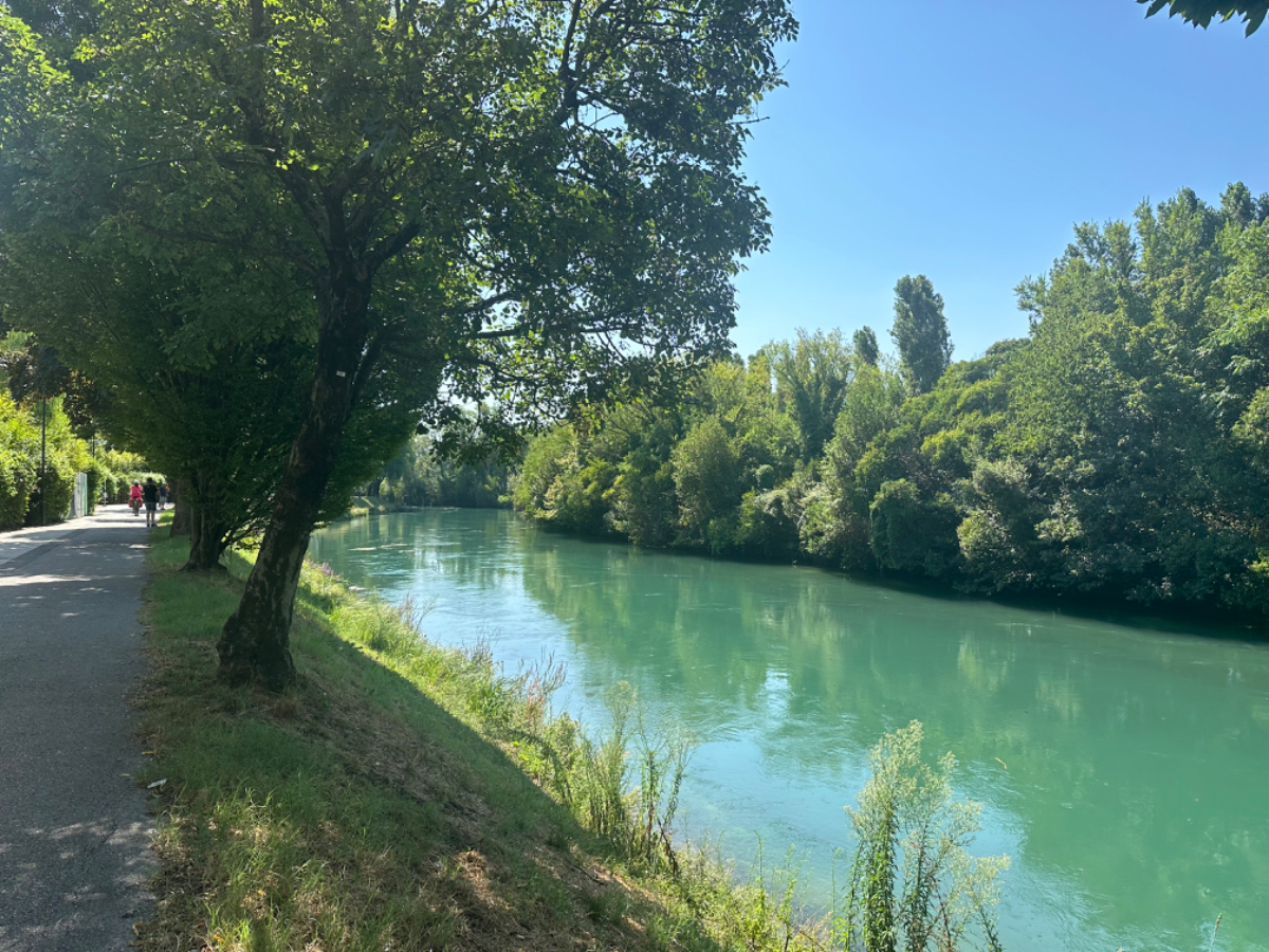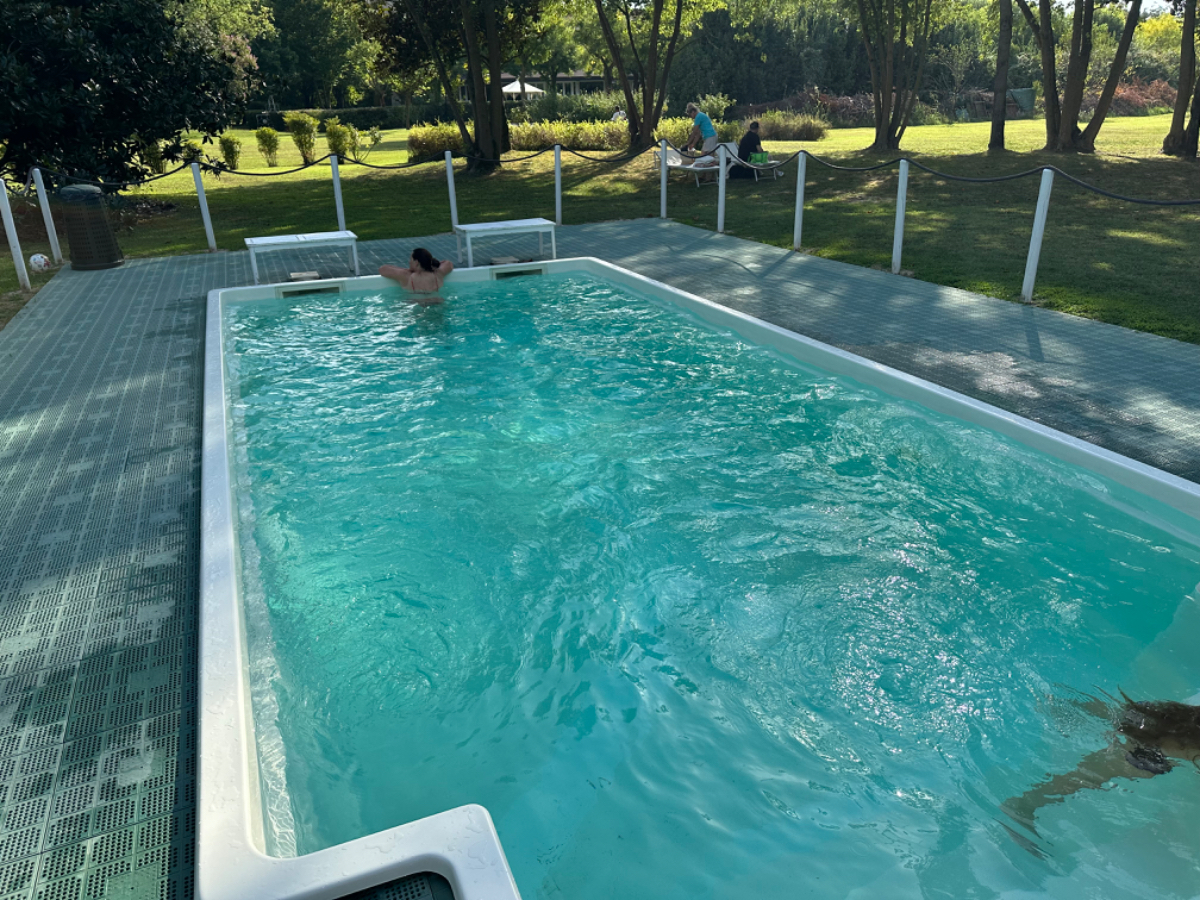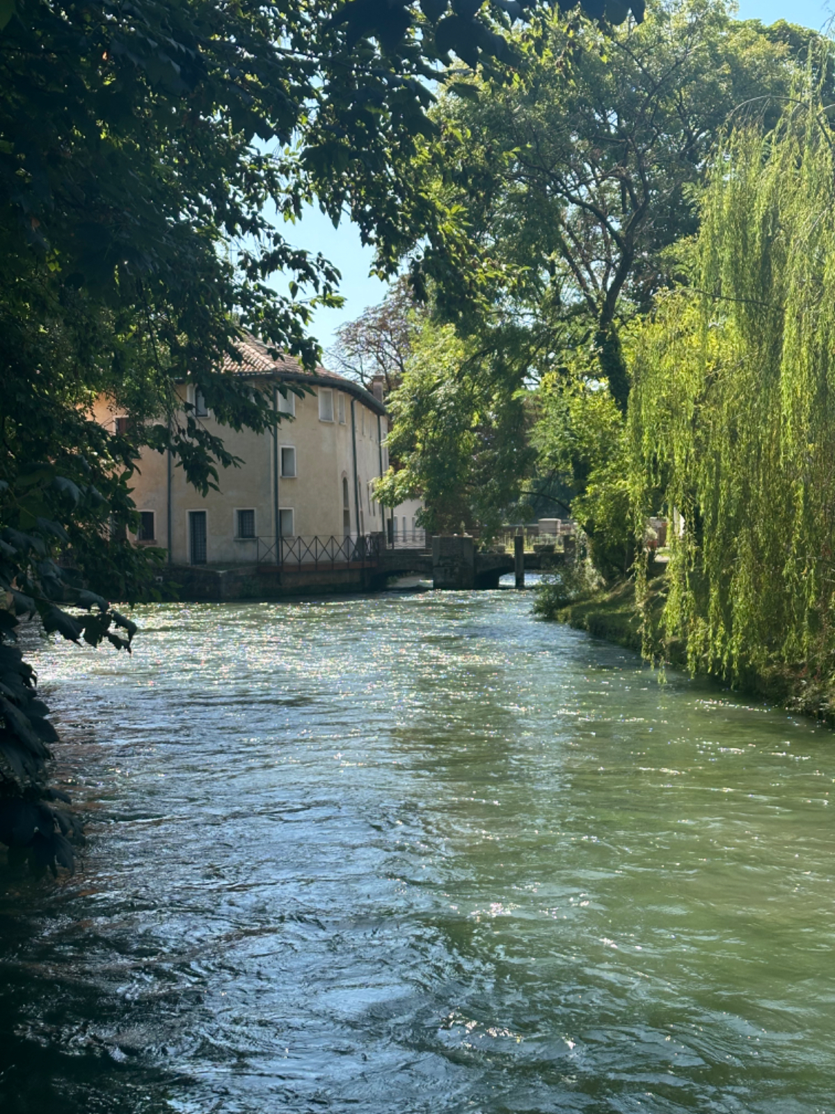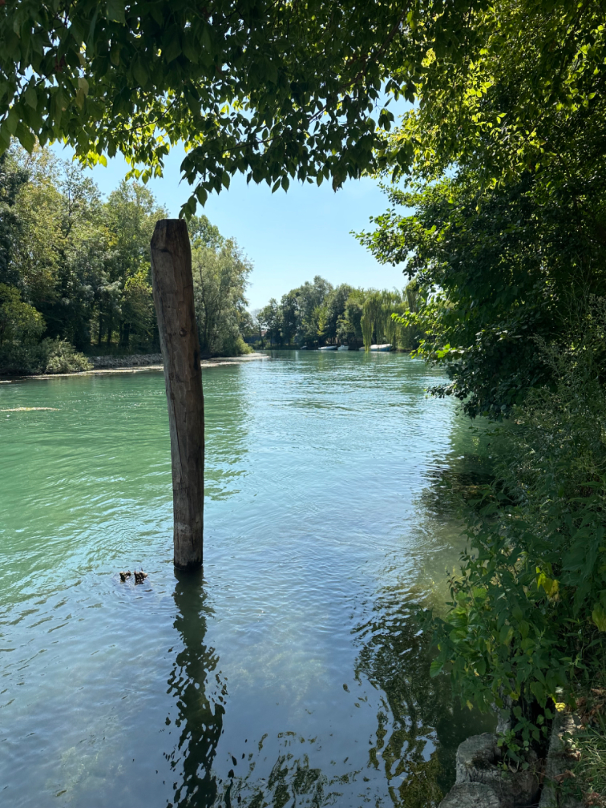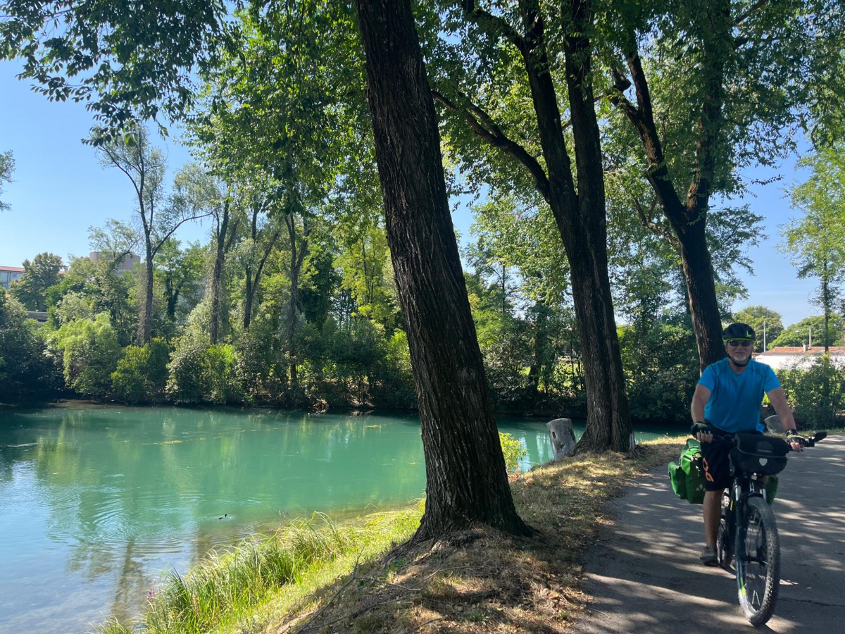 Aus Treviso raus folgen wir dem Fluß Sile, größtenteils bis zu unserem heutigen Ziel. Wir durchqueren ein Naturschutzgebiet entlang des Sile, schattige Wege, Stege und Brücken und nach jeder Flußbiegung eröffnet sich uns ein schönerer Anblick als zuvor. Hier werde ich mal - natürlich mit Riki - mit einem Hausboot hochfahren :-) Um 13 Uhr erreichen wir unser Quartier, ein schönes Hotel, eingebettet in einen großen Park, sehr cool! Wir sind zu früh, also gehen wir zuerst auf ein Ankommensbier. Dem jungen Kellner passiert ein Missgeschick, er zerbricht ein Glas und gießt den Inhalt über den Tisch und auch Rikis Shirt stinkt danach nach Bier. Das Gute daran, wir mussten unsere Zeche nicht bezahlen. (Danke Bernd für die Einladung, wir kommen gerne in ein nächsten Tagen darauf zurück :-) Nachdem heute ein Feiertag ist, hat so gut wie kein Lokal um die Mittagszeit geöffnet, aber wieder Glück gehabt, in einer Bar essen wir schmackhafte Spaghetti - und bezahlen für zwei Portionen und ein Liter Mineralwasser 15 Euro :-) Den restlichen Tag verbringen wir bis zum Abend am hoteleigenen Pool, der mitten im Park liegt, bei angenehmen 34 Grad, mit Campari und Aperol Spritz, WHAT A DAY! :-) Und morgen Venezia……